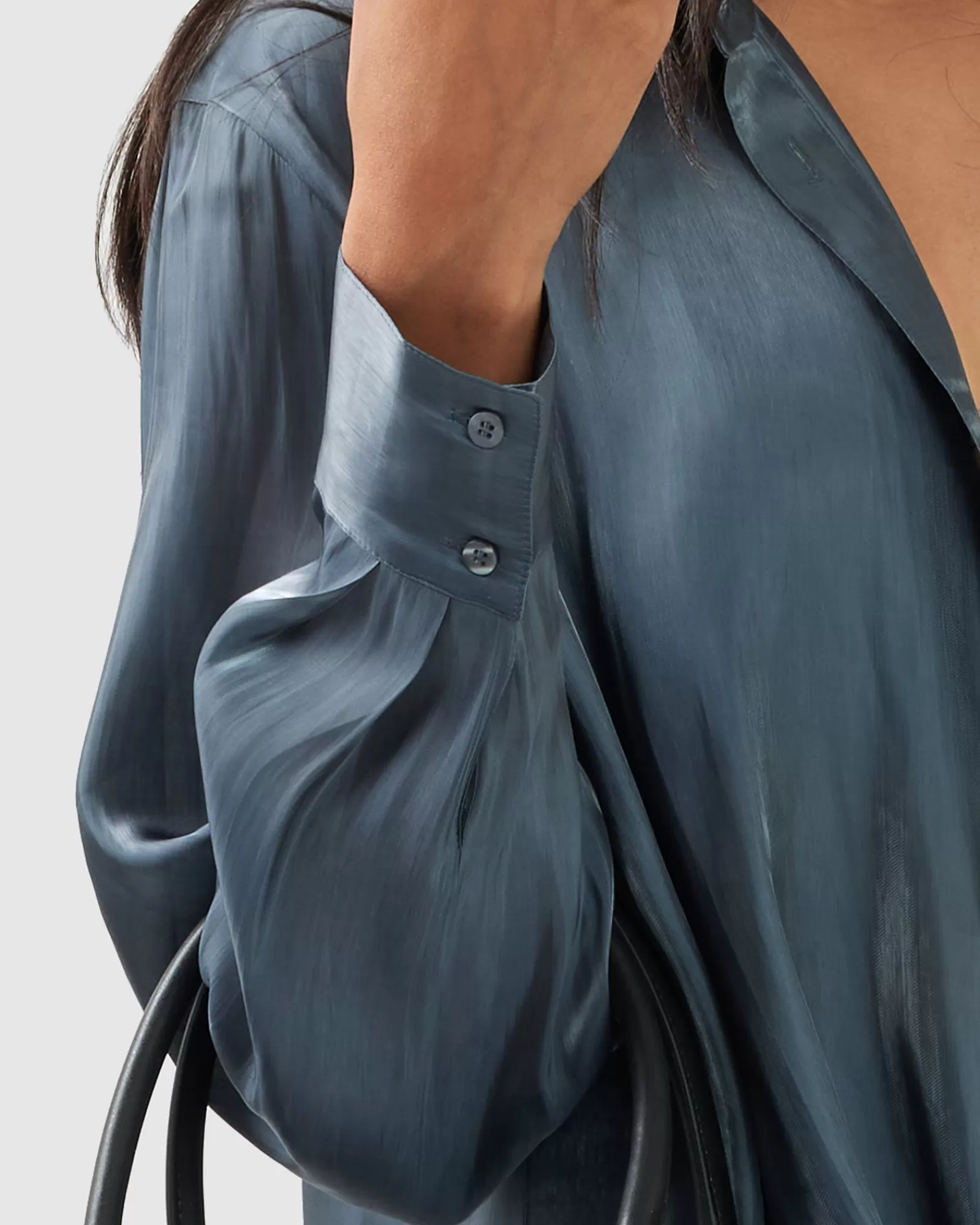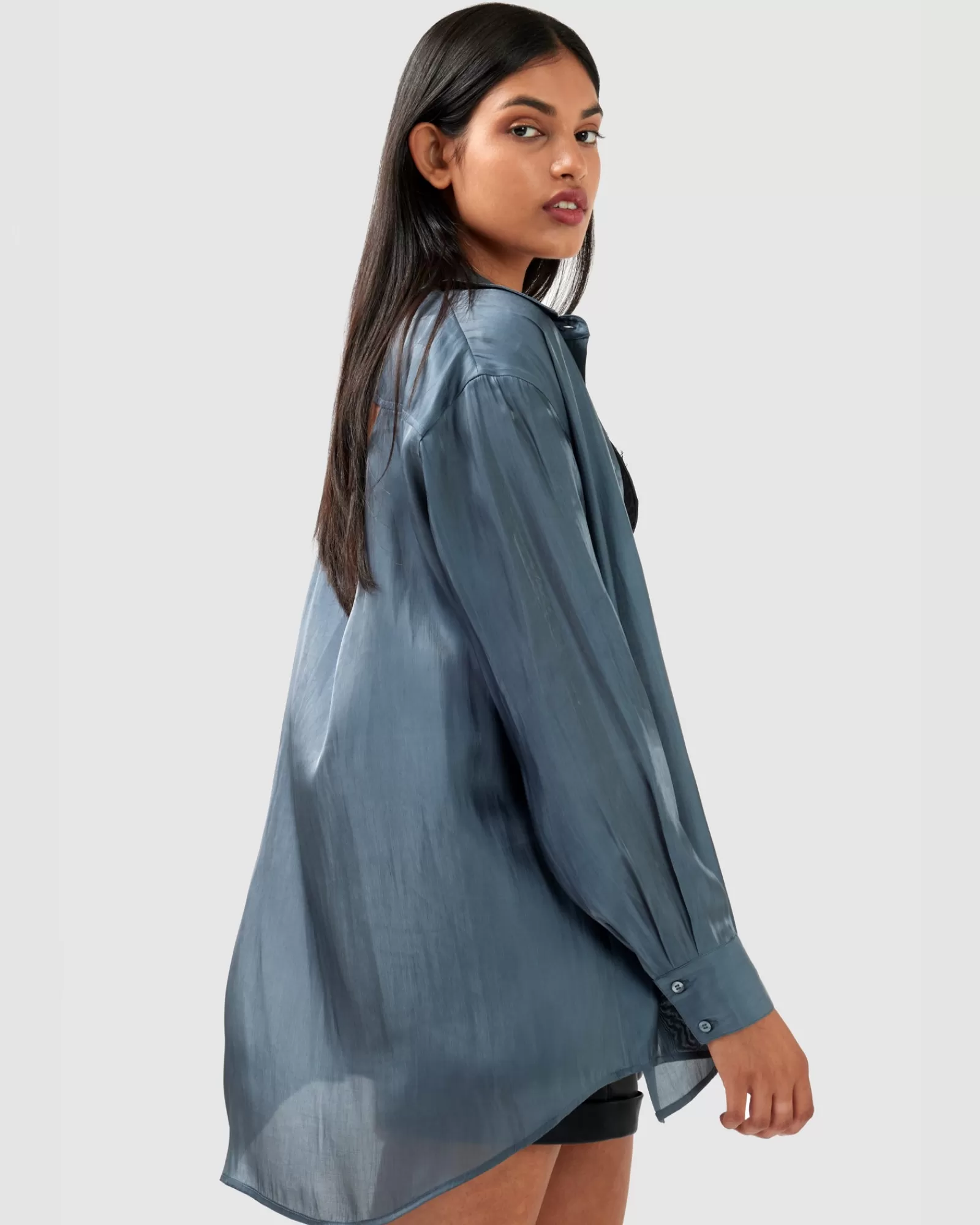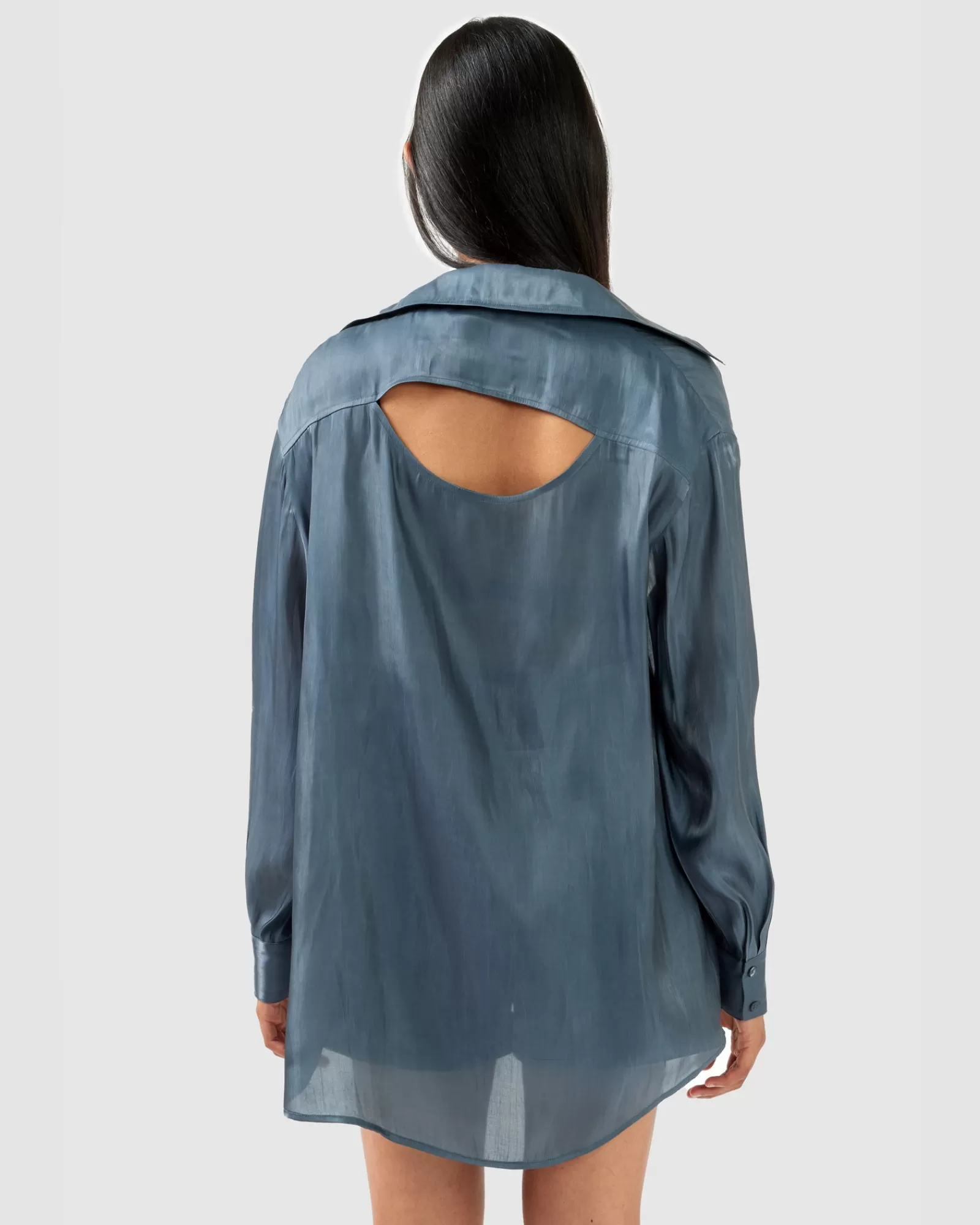 The iridescent sheer fabric adds a contemporary flair to this classic collared shirt. Featuring an oversized fit with our signature back cut out, the Back To You Iridescent Shirt is the perfect layering piece to take you from day to night.