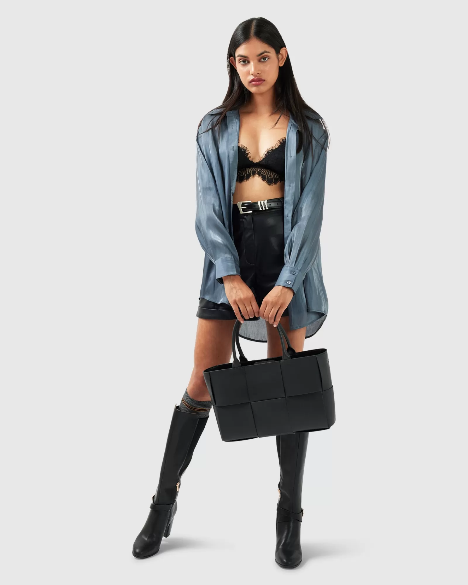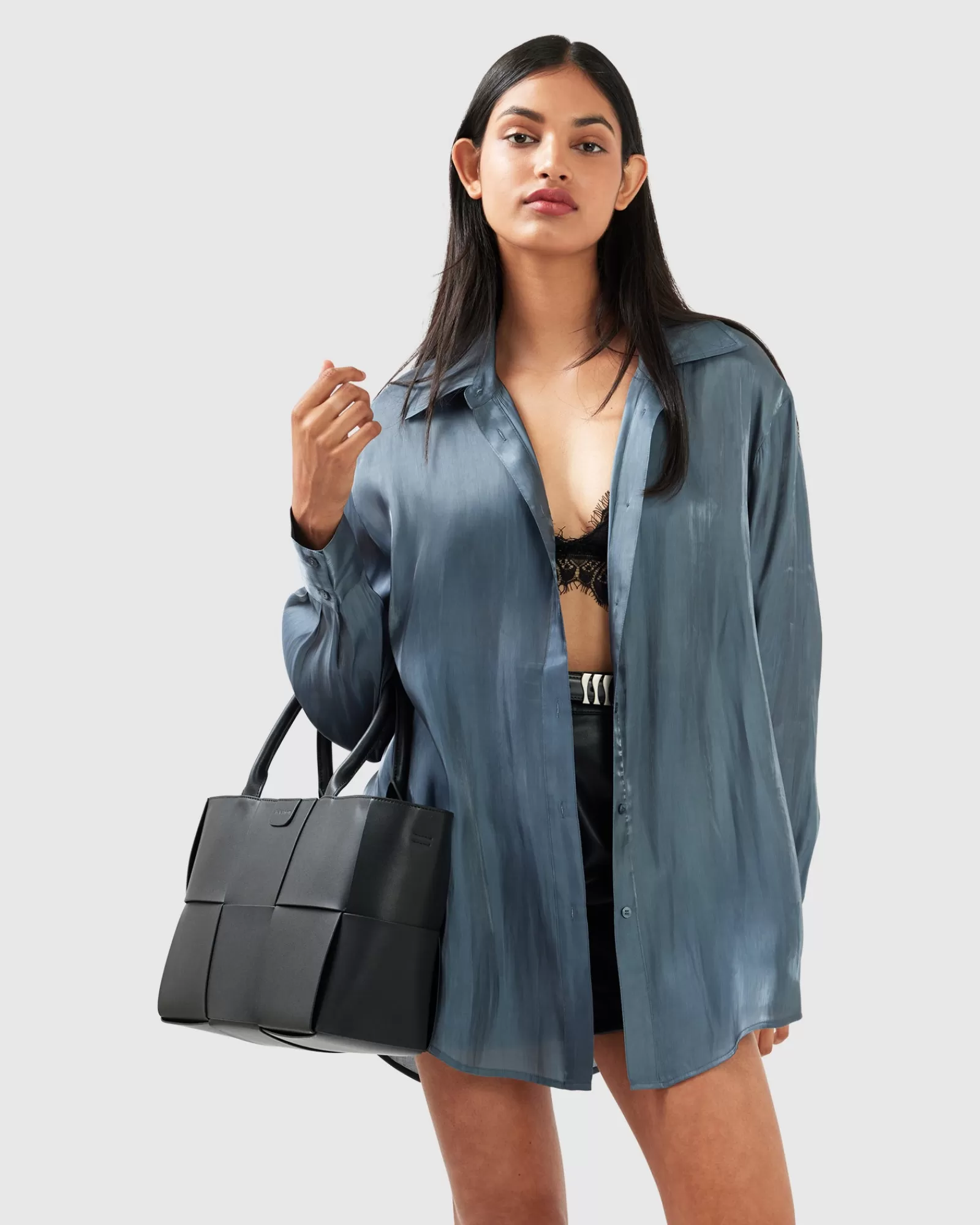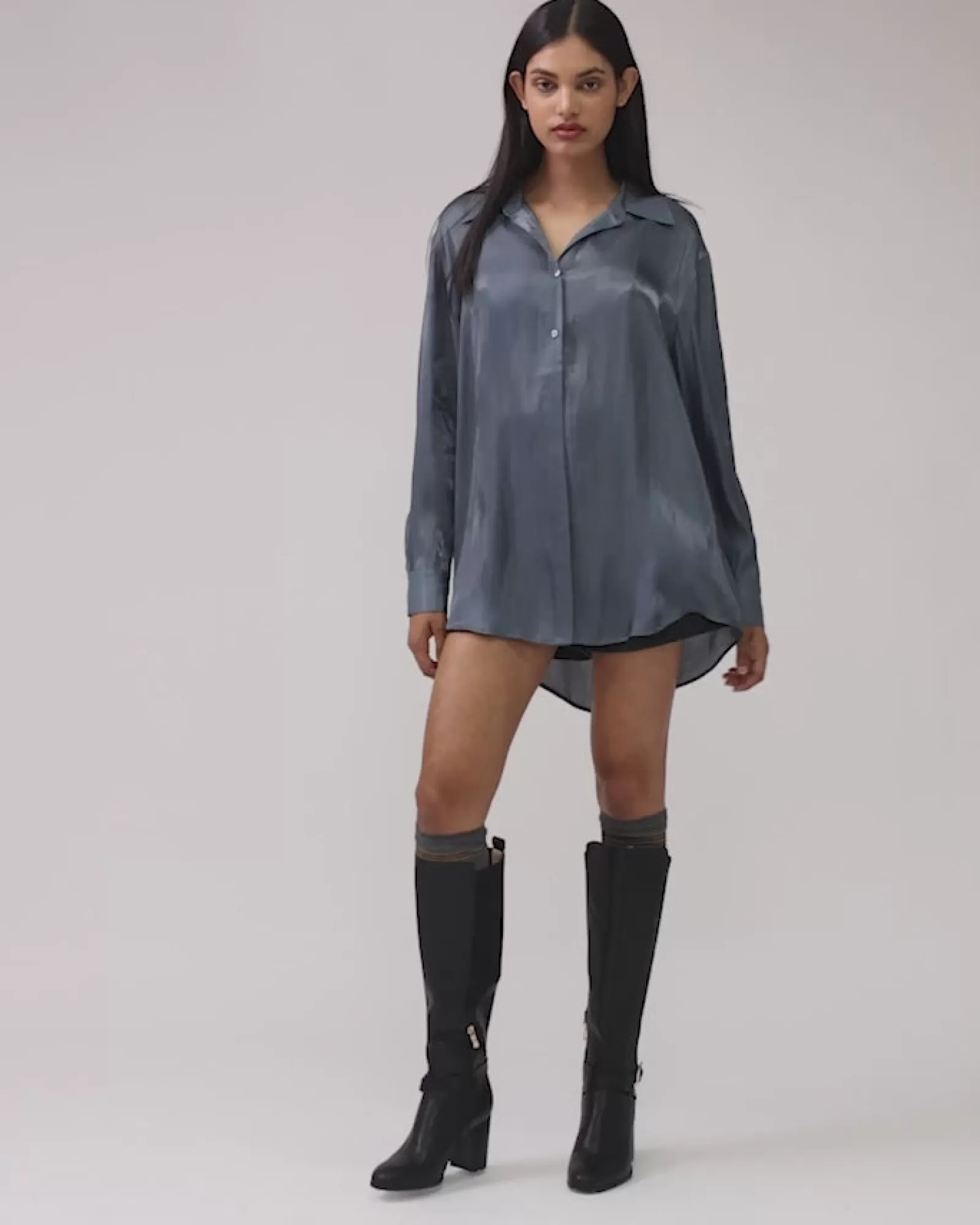 The iridescent sheer fabric adds a contemporary flair to this classic collared shirt. Featuring an oversized fit with our signature back cut out, the Back To You Iridescent Shirt is the perfect layering piece to take you from day to night.