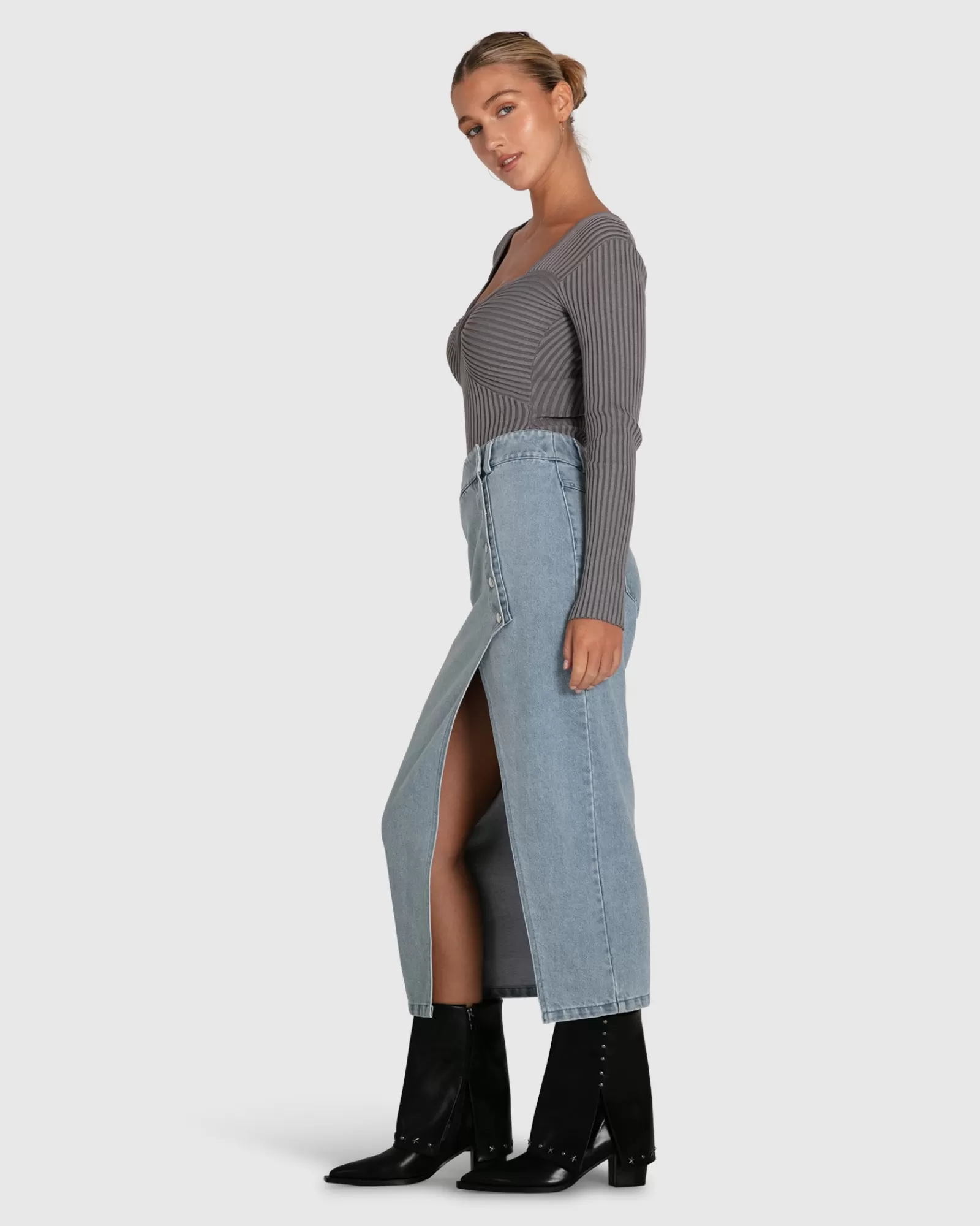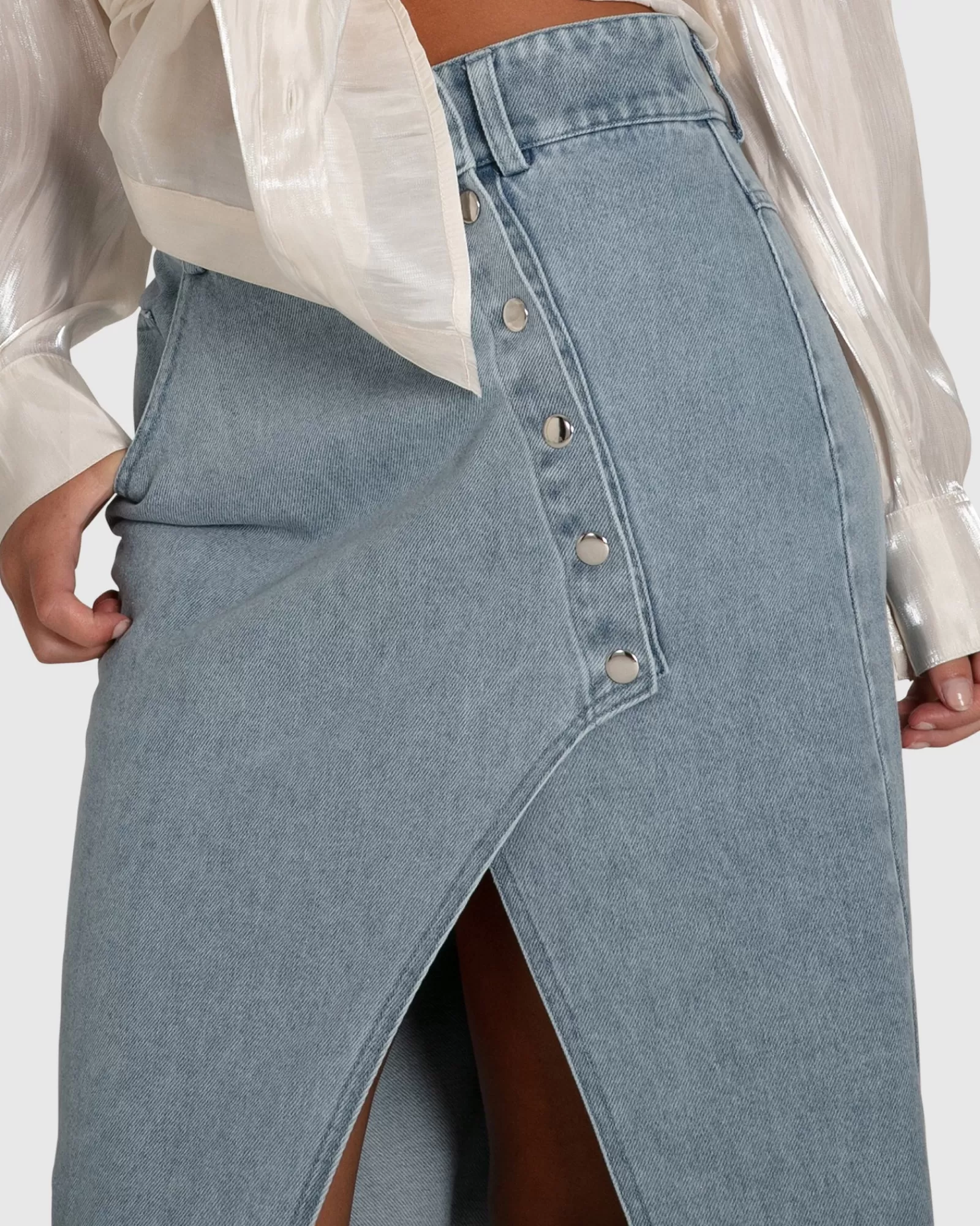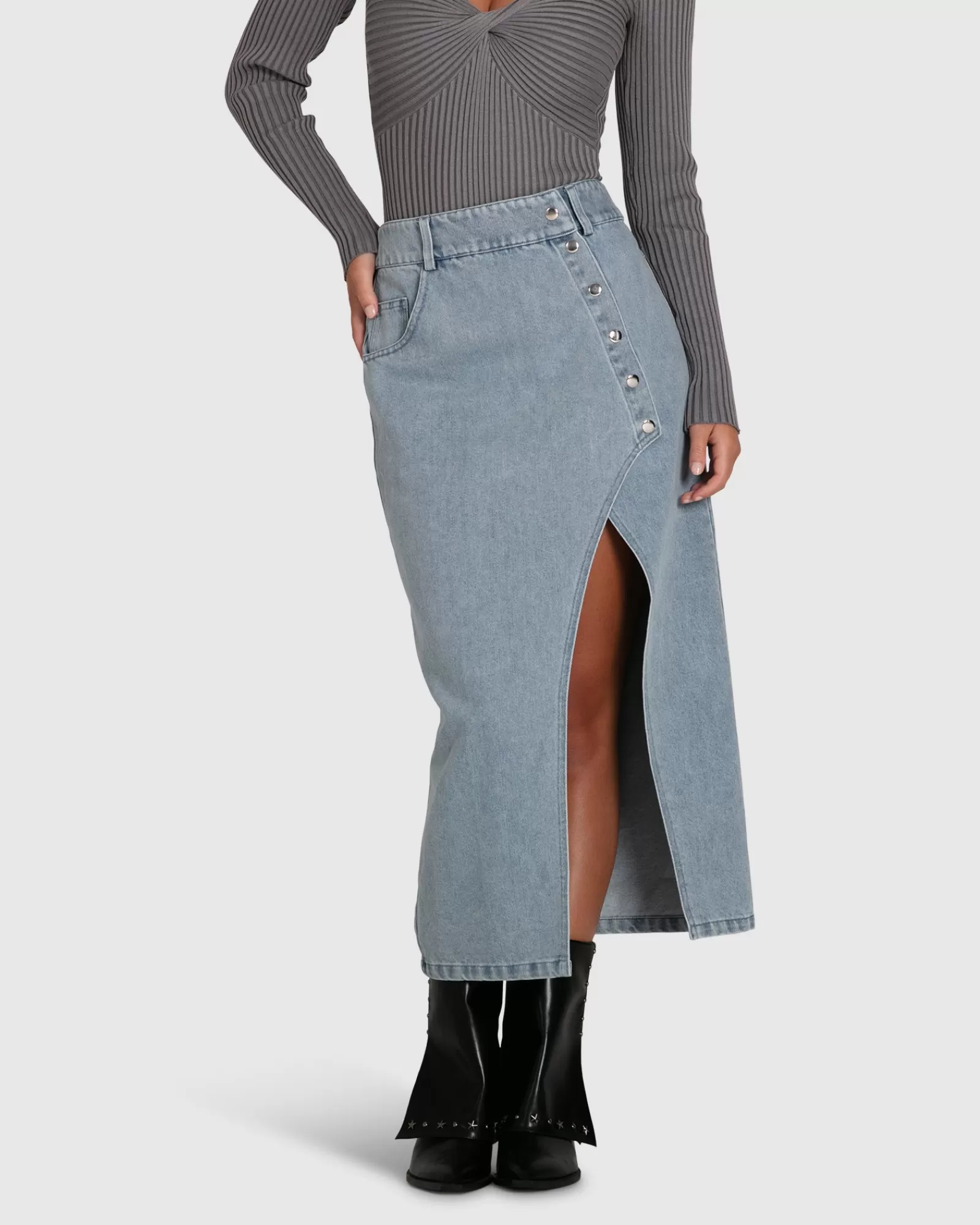 A front slit gives you room to move in the Can’t Forget You Denim Midi Skirt. Traditionally casual denim has had a refined update with the unique asymmetrical stud closure and stonewash finish.