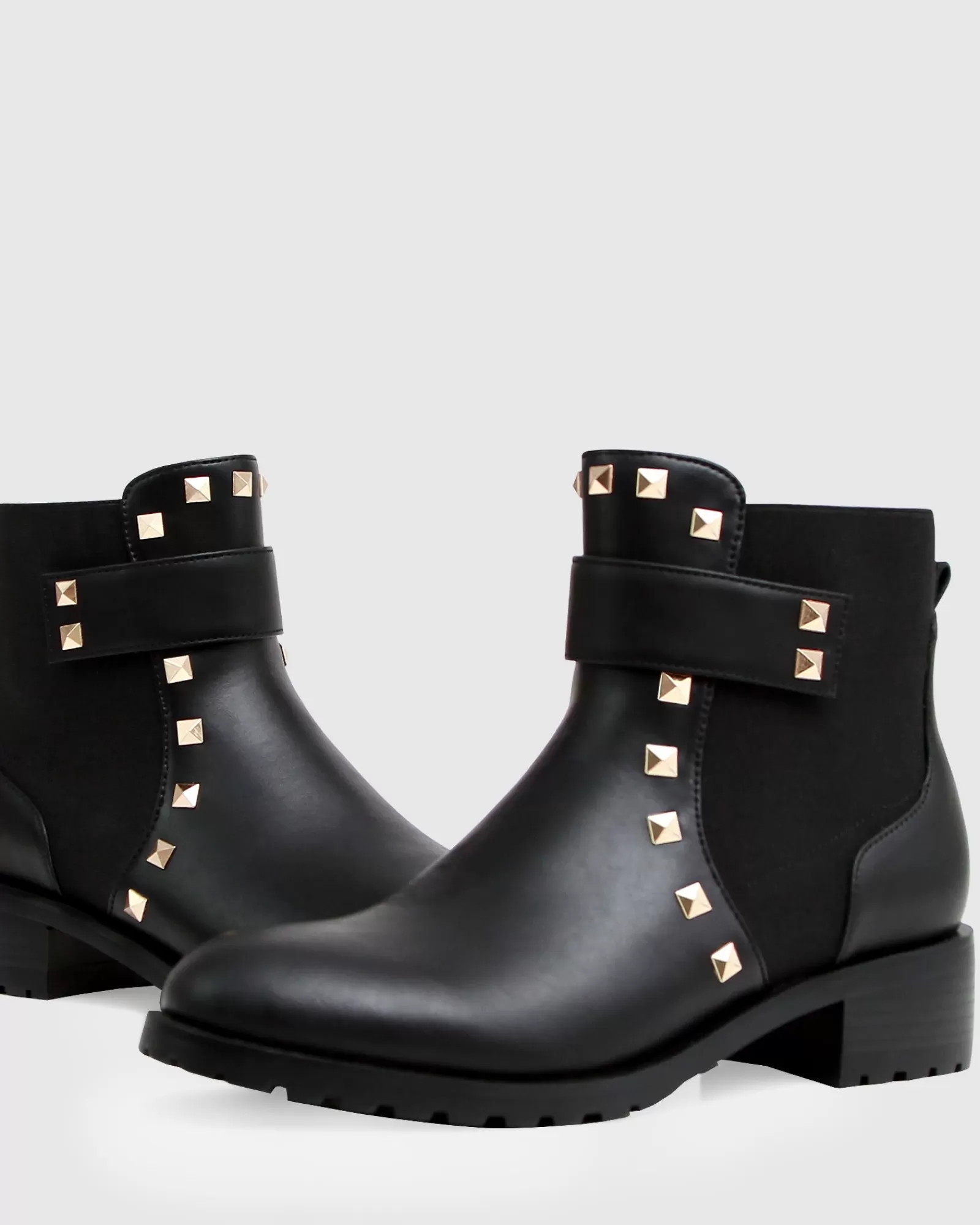 Gleaming gold pyramid studs stand out against the sleek black silhouette of the City Lights Leather Ankle Boot. Stretchy side panels and a classic comfortable lug sole make this boot the perfect addition to take your everyday winter wardrobe to the next level.