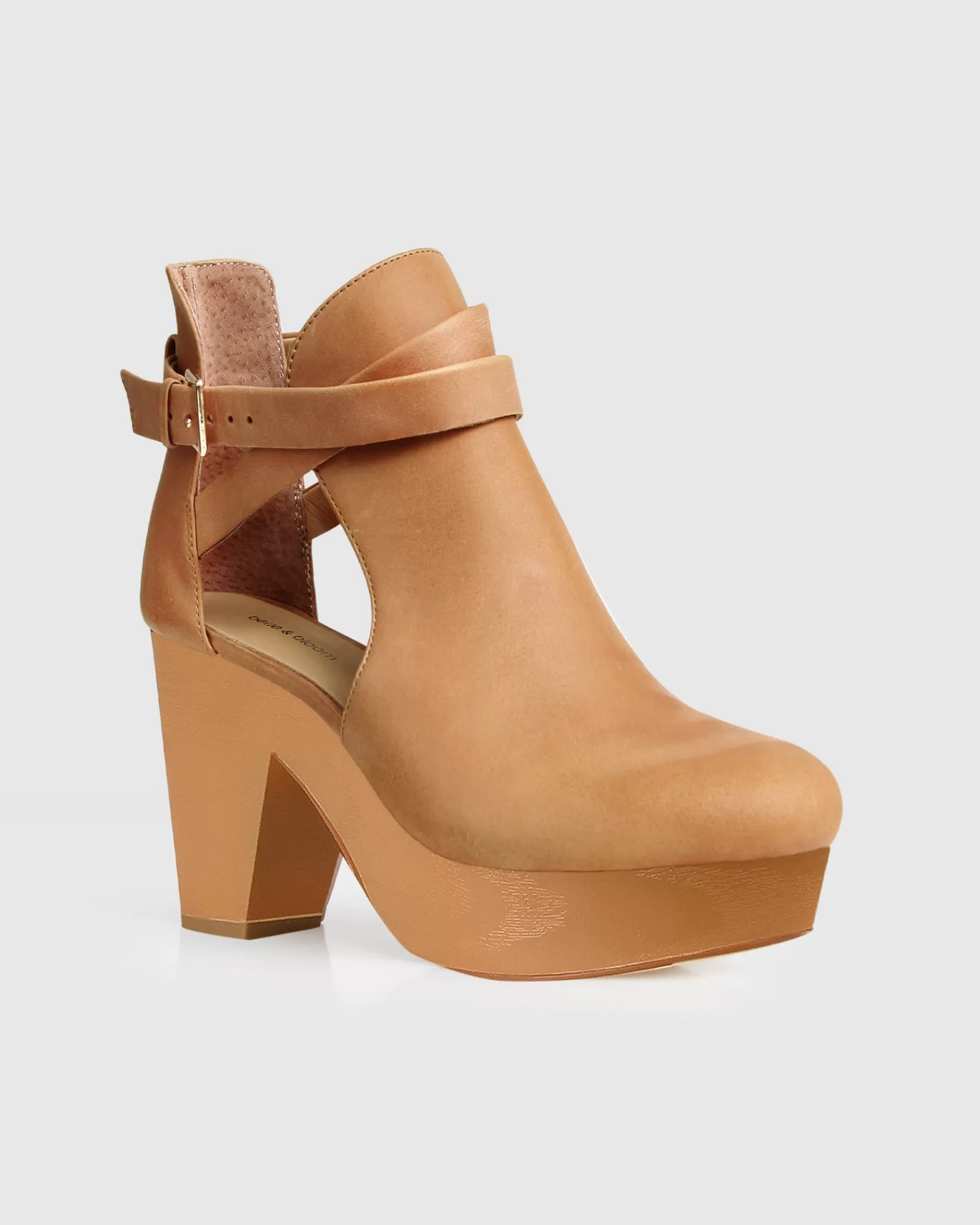 A woodgrain finish platform and heel add to the 70‚Äôs vibe of the Fearless Clog Ankle Boot by Belle and Bloom. Feat…