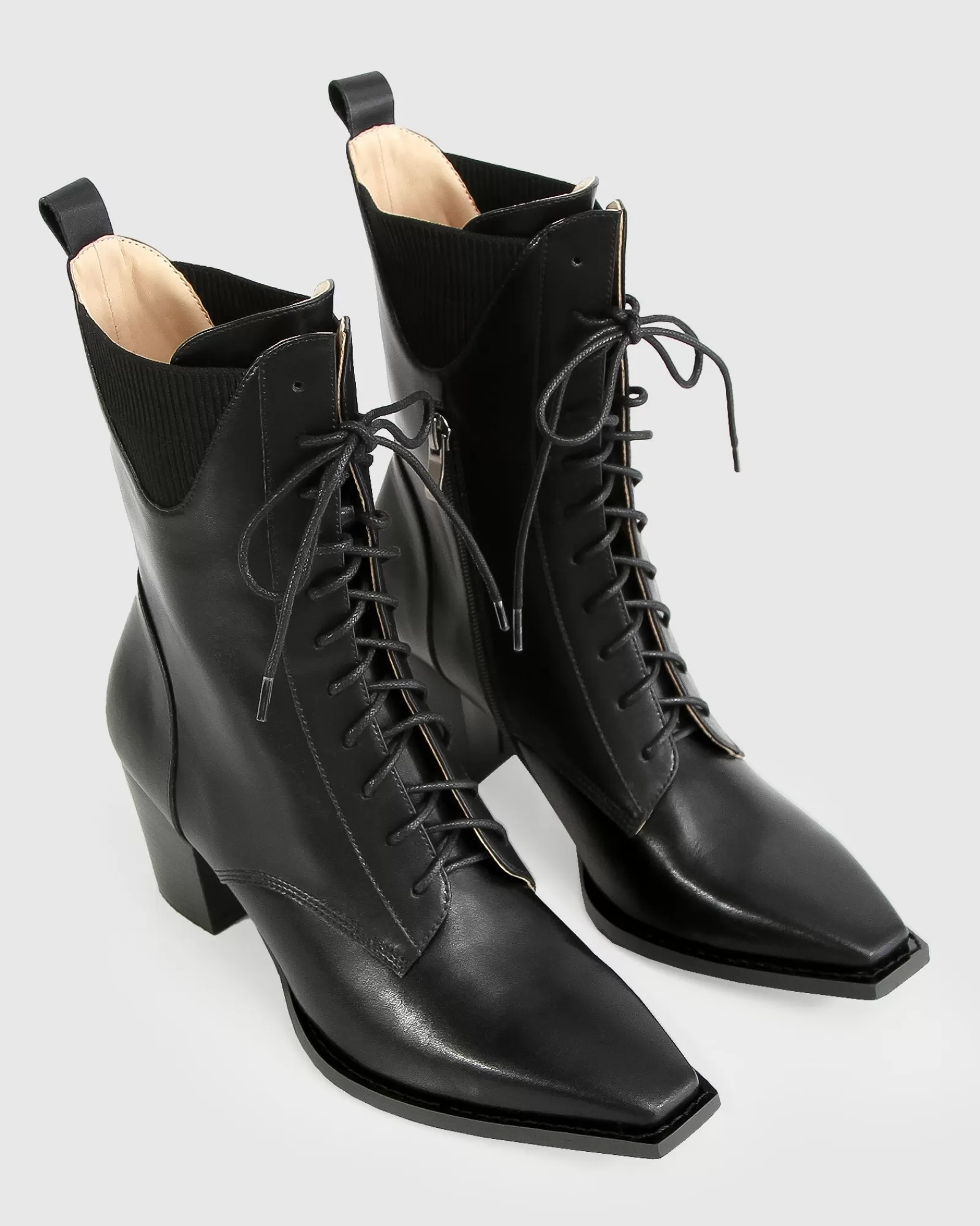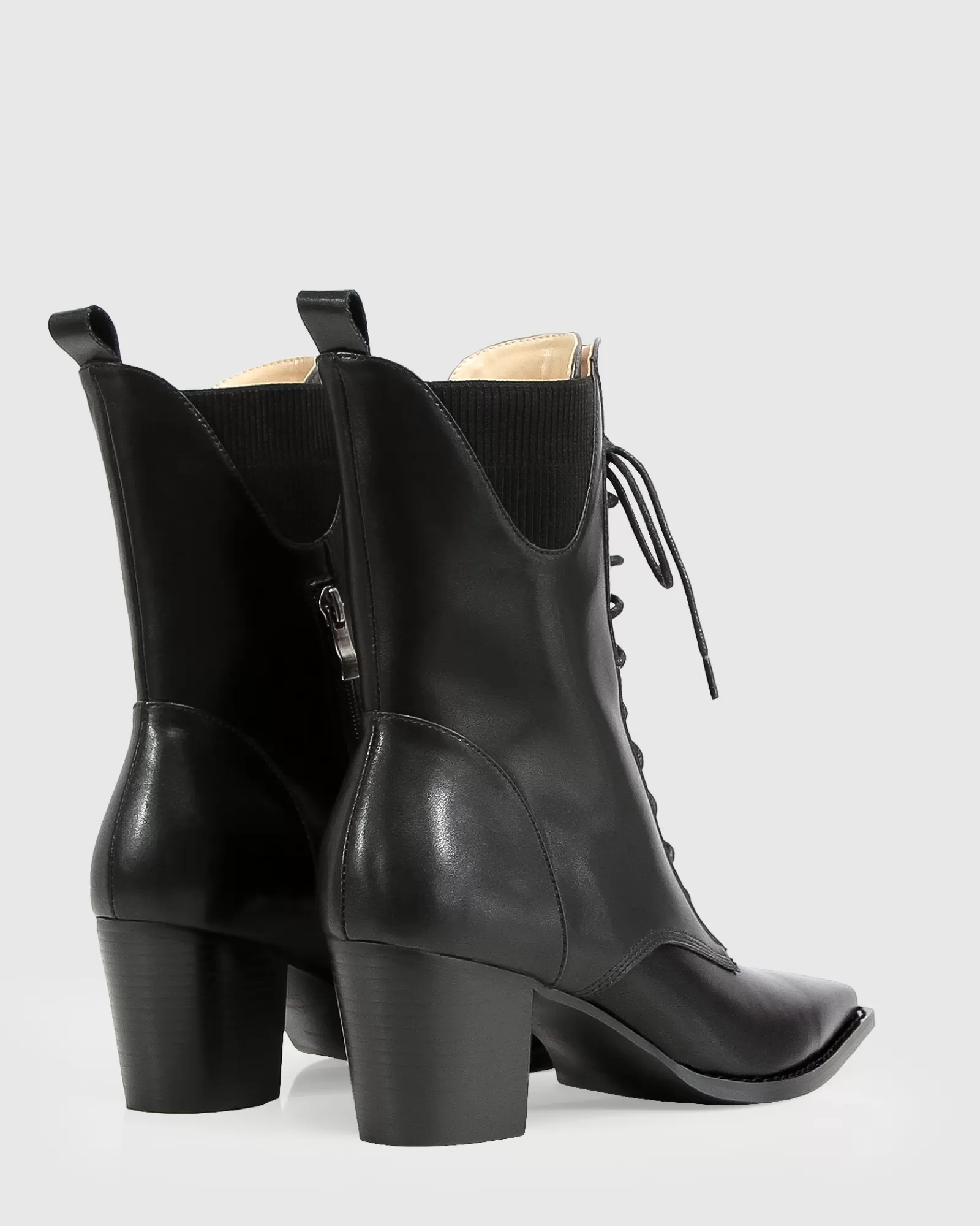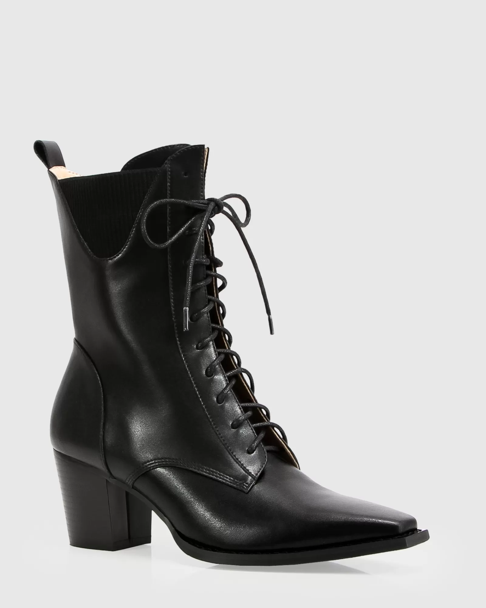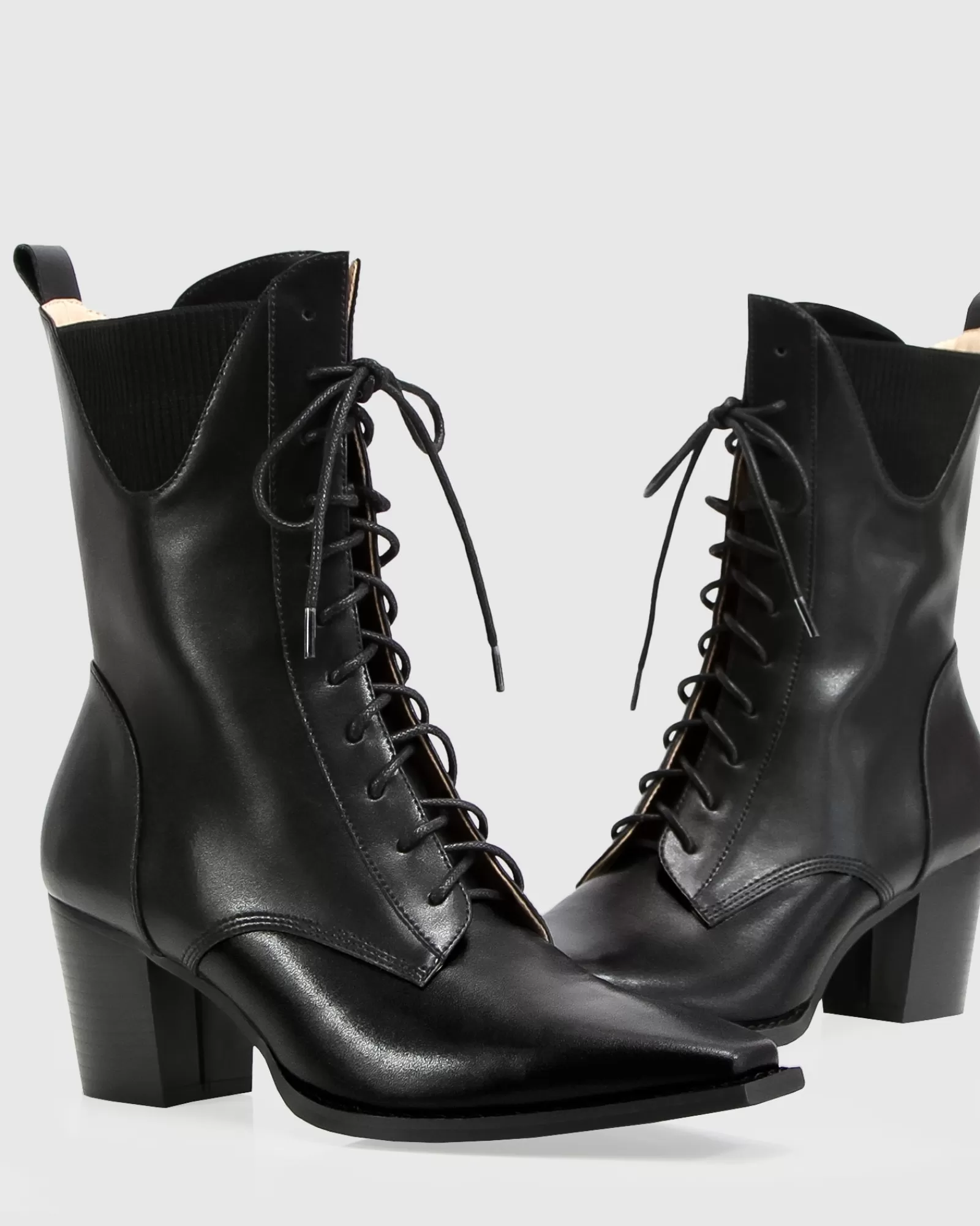 A snip toe silhouette adds a bit of subversive attitude to a straight-laced, Victorian-inspired boot with a block heel. This Jumping Ship Laced Boot is a classic style that has been updated updated for 2023 with ribbed inserts along the curved top edge and rounded leather laces.