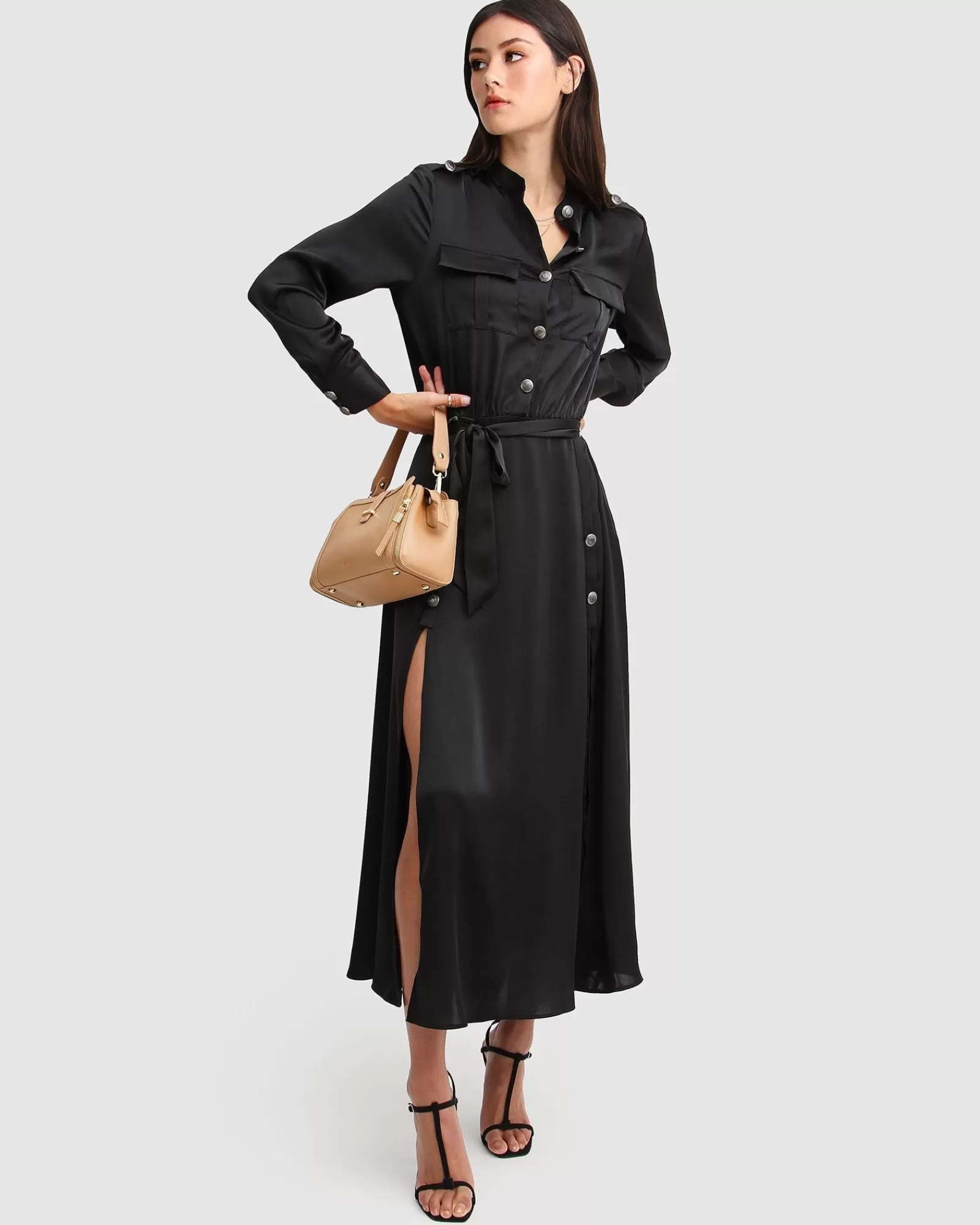 Elegantly stunning, the Lover To Lover Maxi Shirt Dress follows the classic military style in a silk-like fabric. With long sleeves and hemline, the high slits make an even bolder statement than the ornate metal buttons.