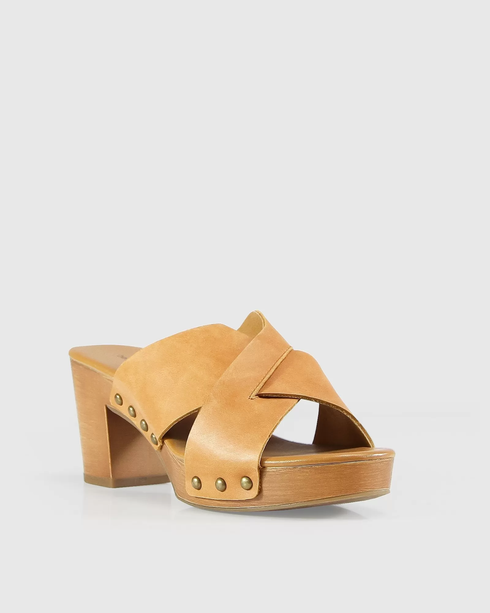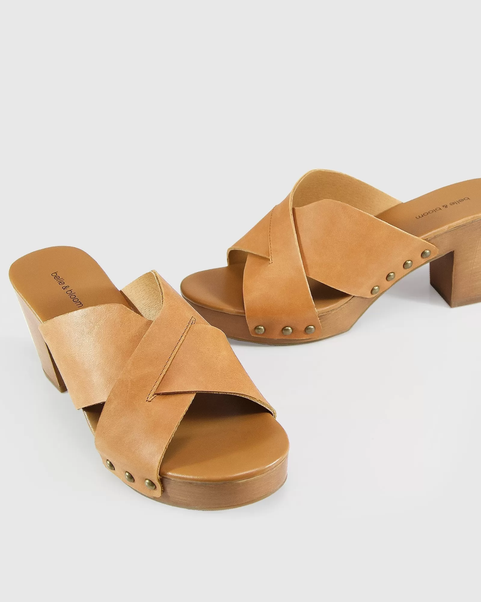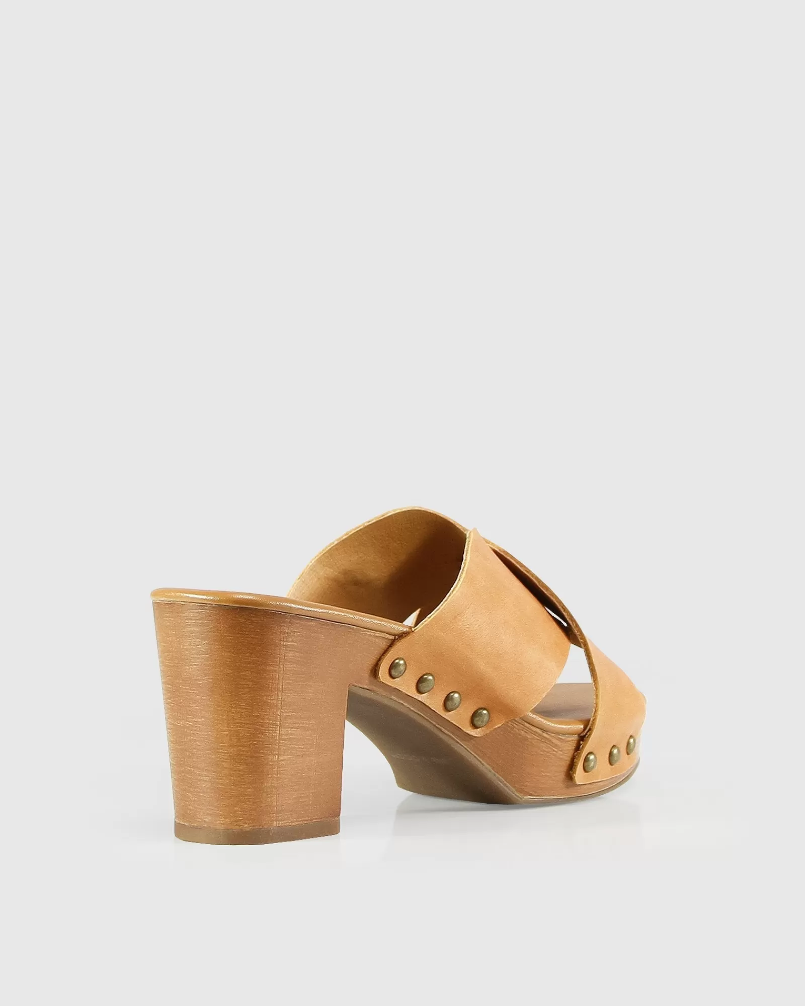 A chunky wood finish platform boosts the effortlessly cool Midtown Clog Mule, styled with leather crossover straps, an open toe and eye catching gold rivets.