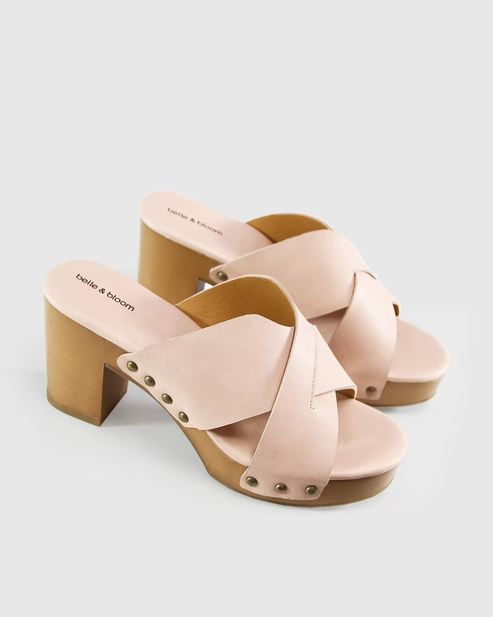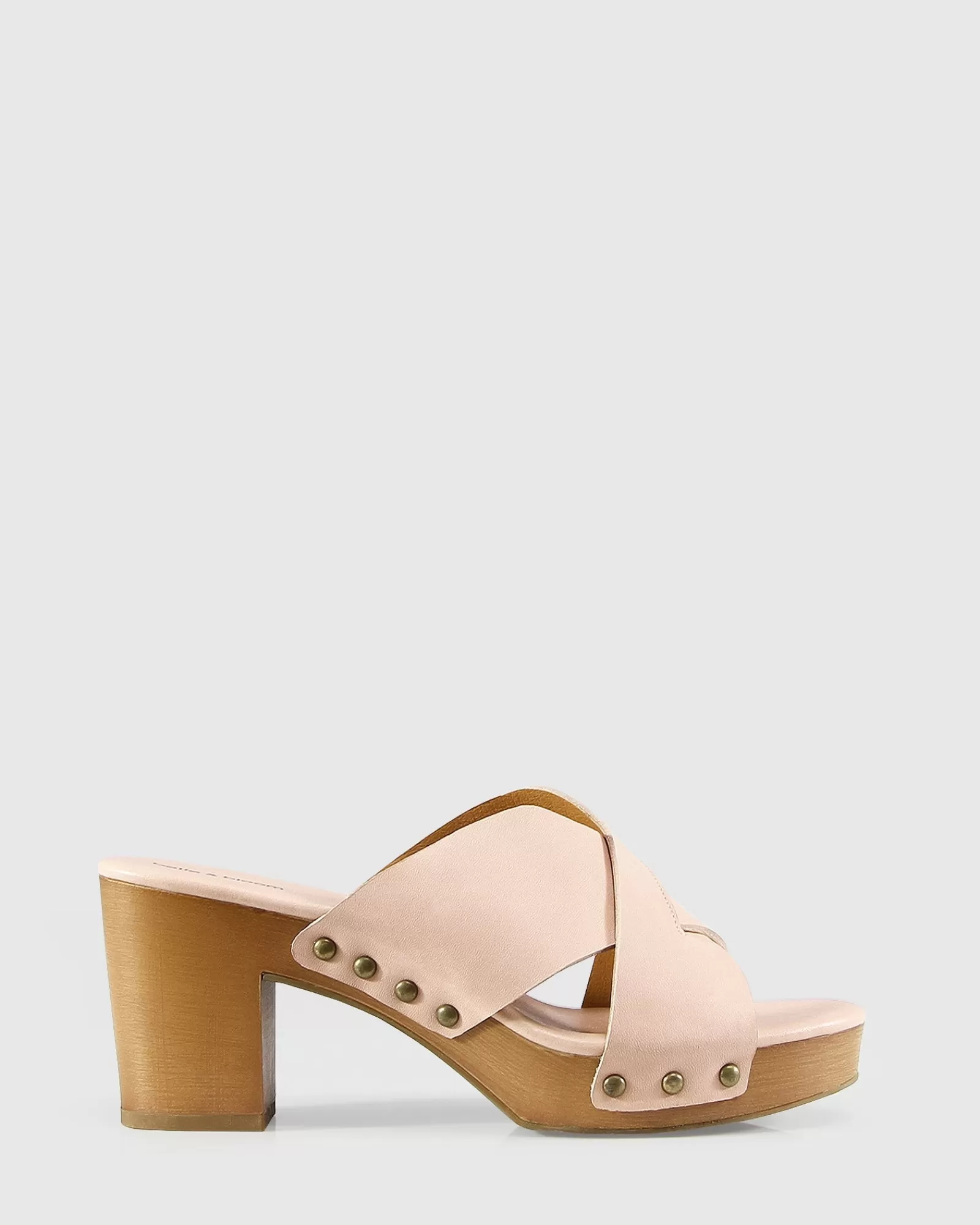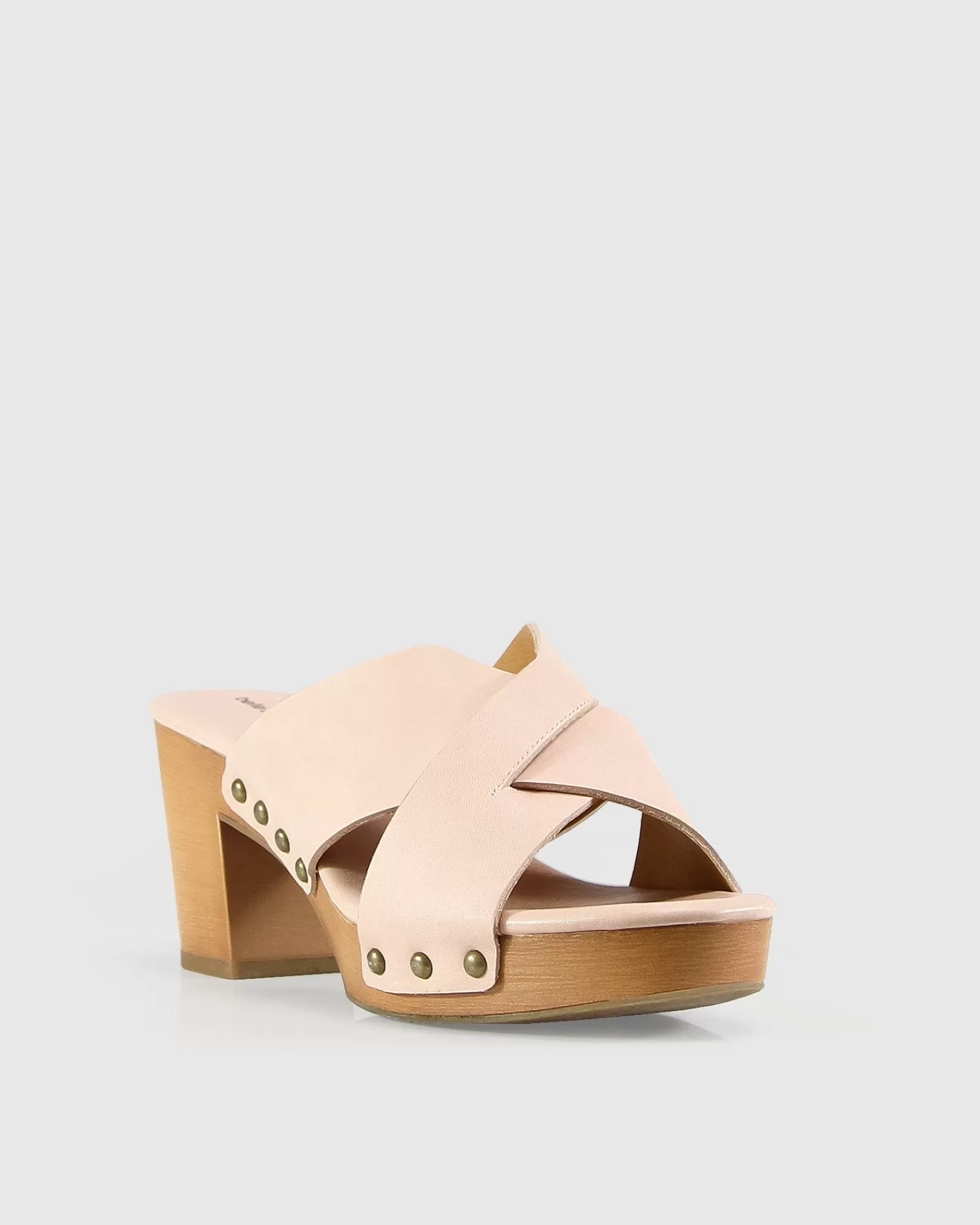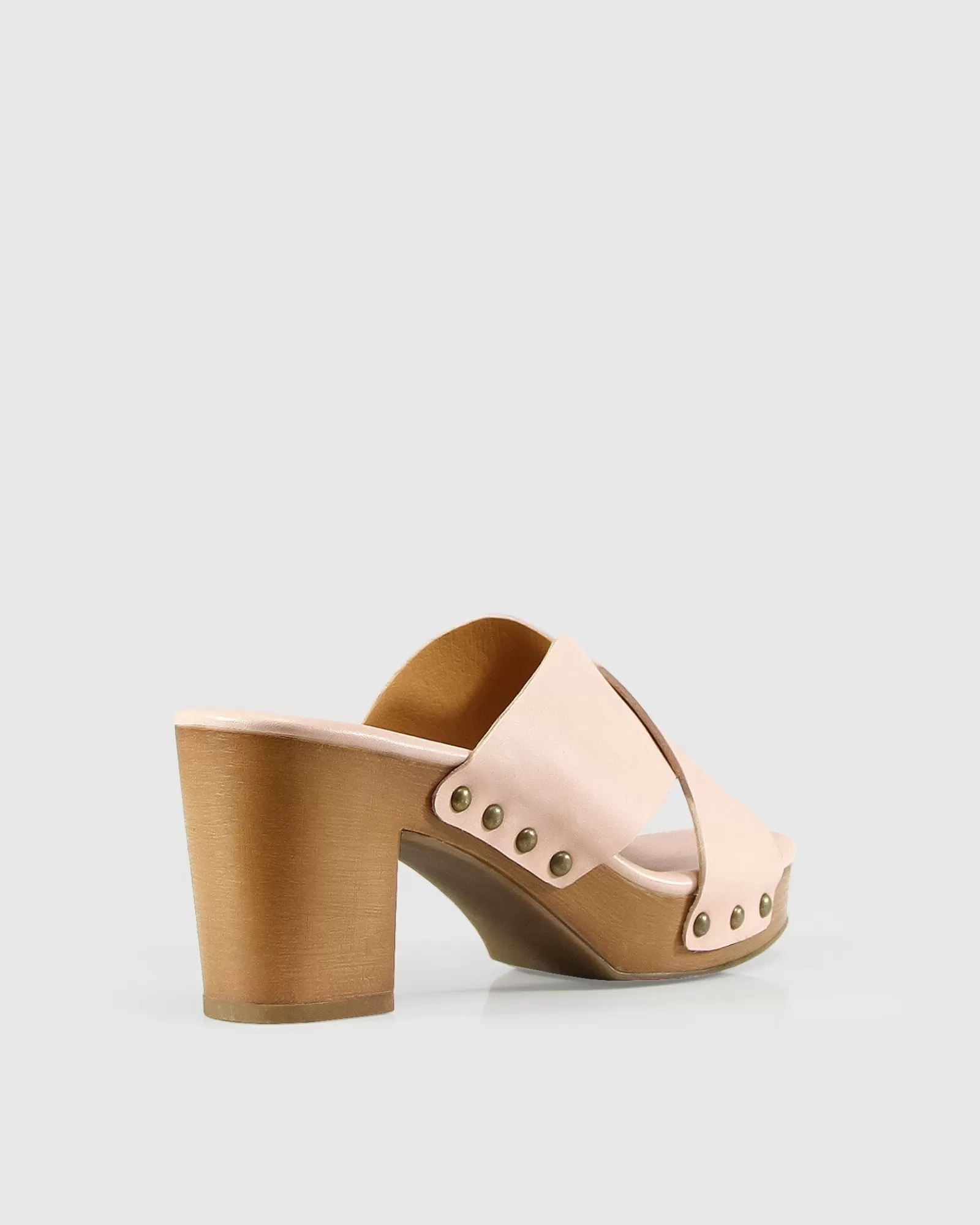 A chunky wood finish platform boosts the effortlessly cool Midtown Clog Mule, styled with leather crossover straps, an open toe and eye catching gold rivets.