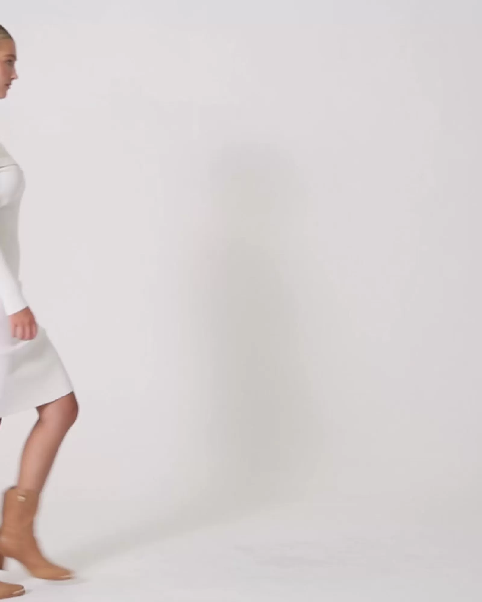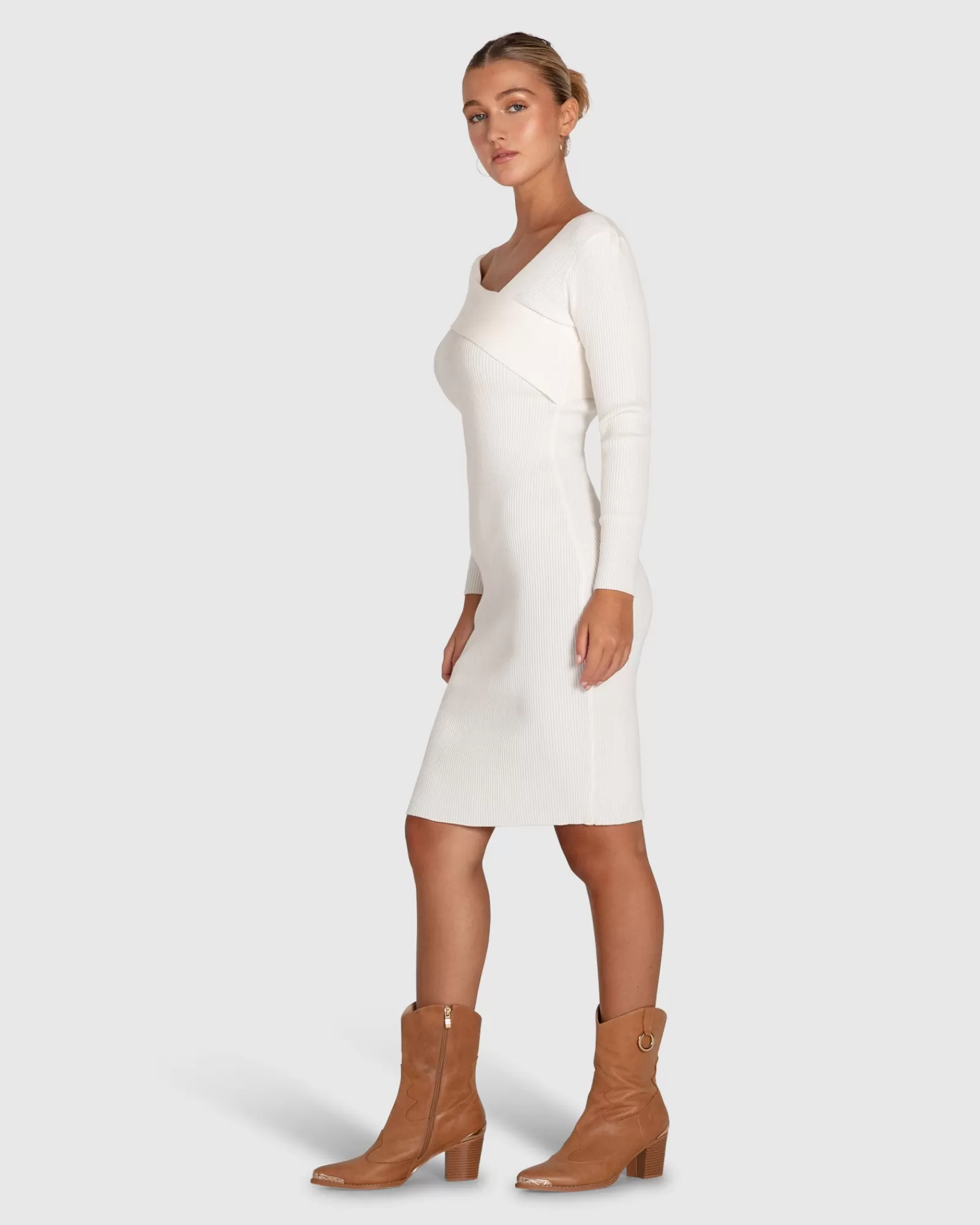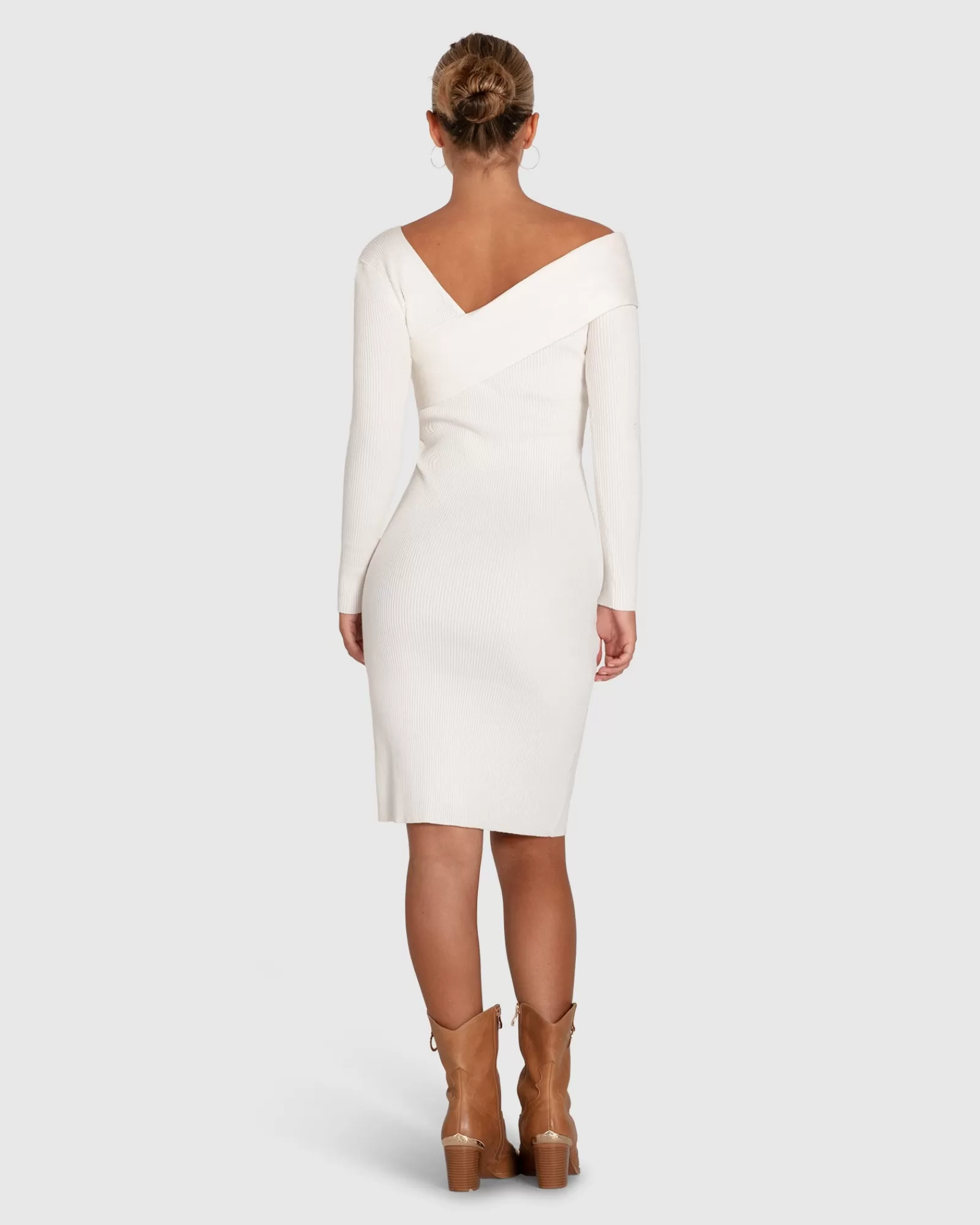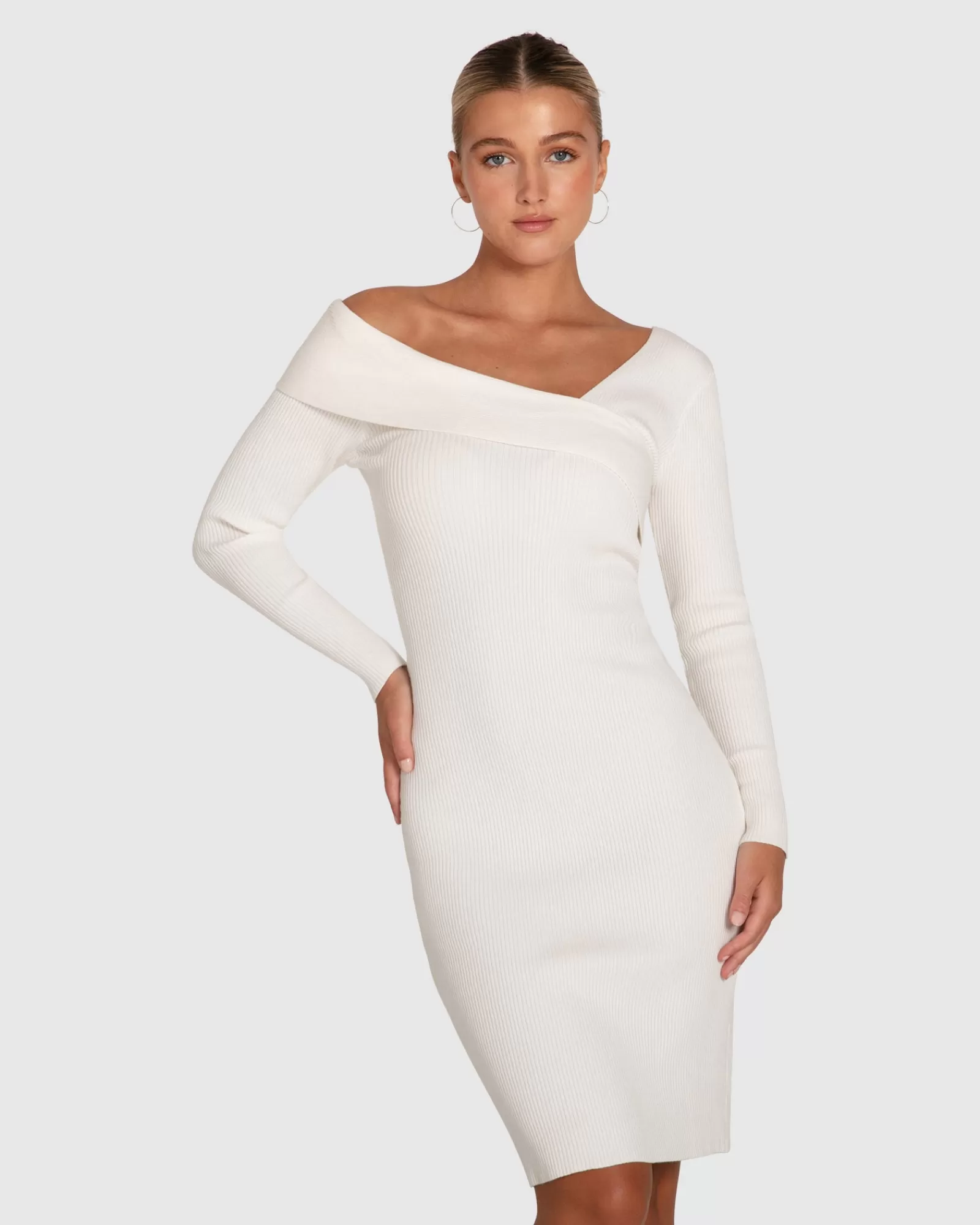 Warm and soft to the touch, the curve-hugging Way You Move Knit Dress is a winter wardrobe essential with its asymmetrical off-shoulder folded neckline and classic knee length silhouette.