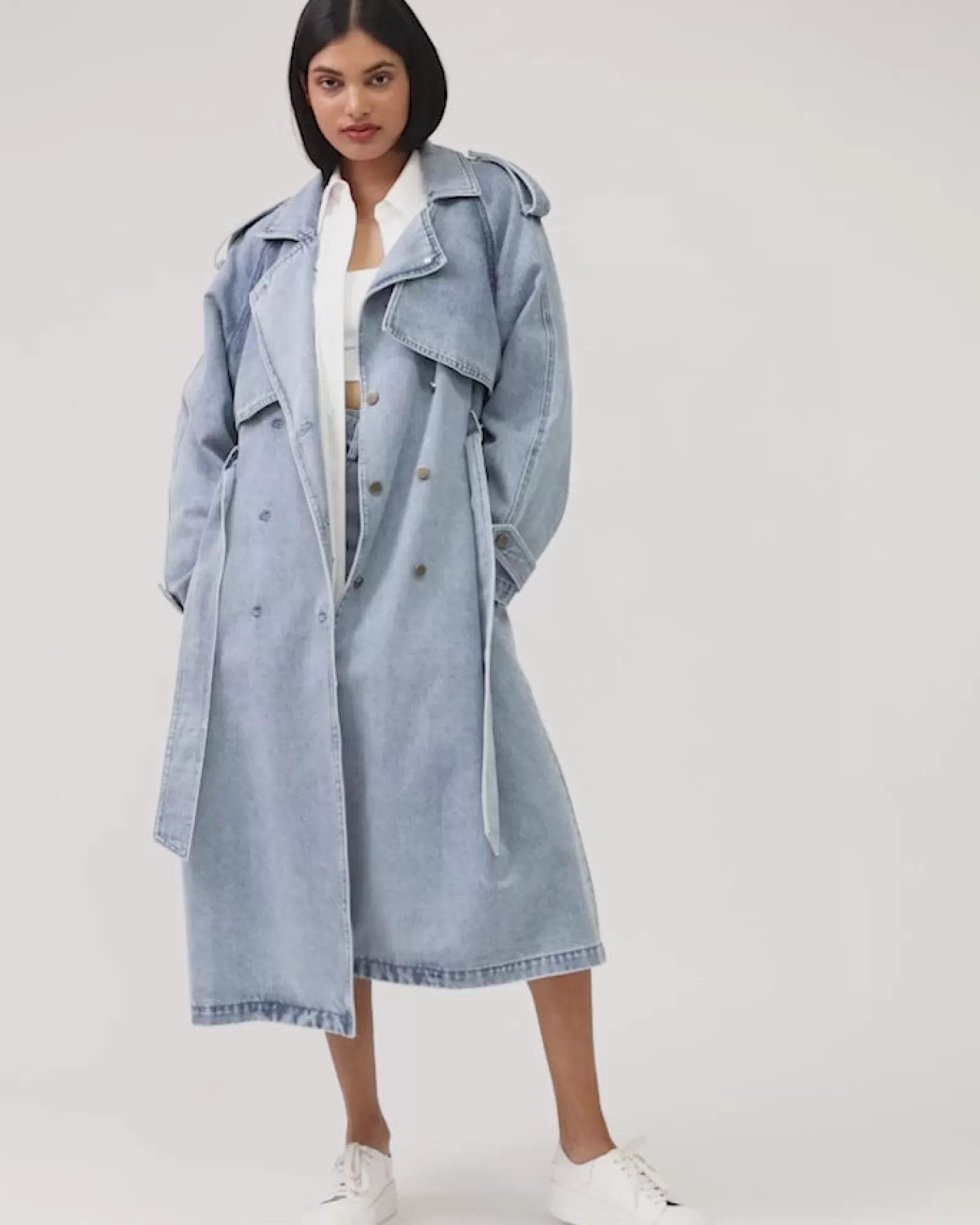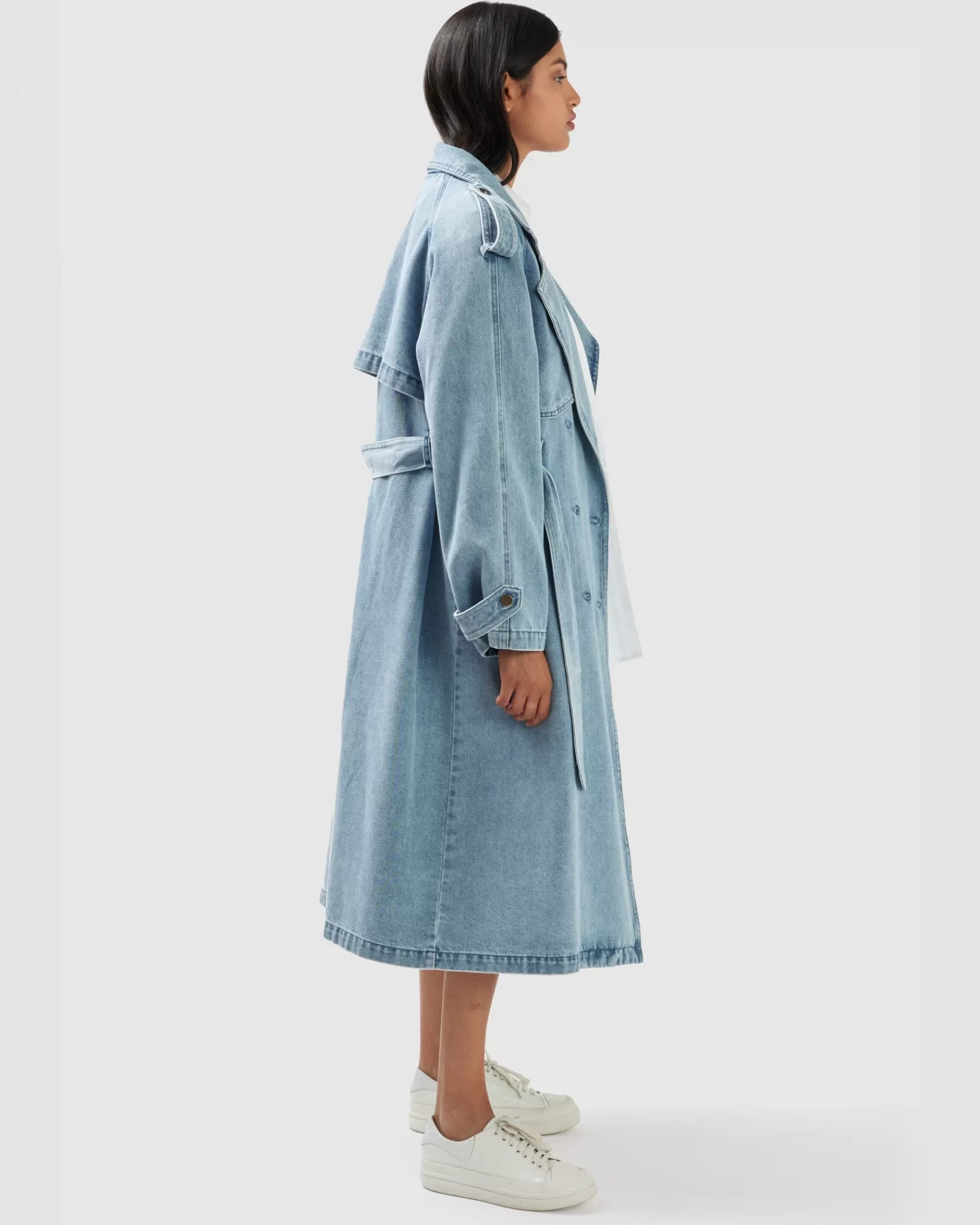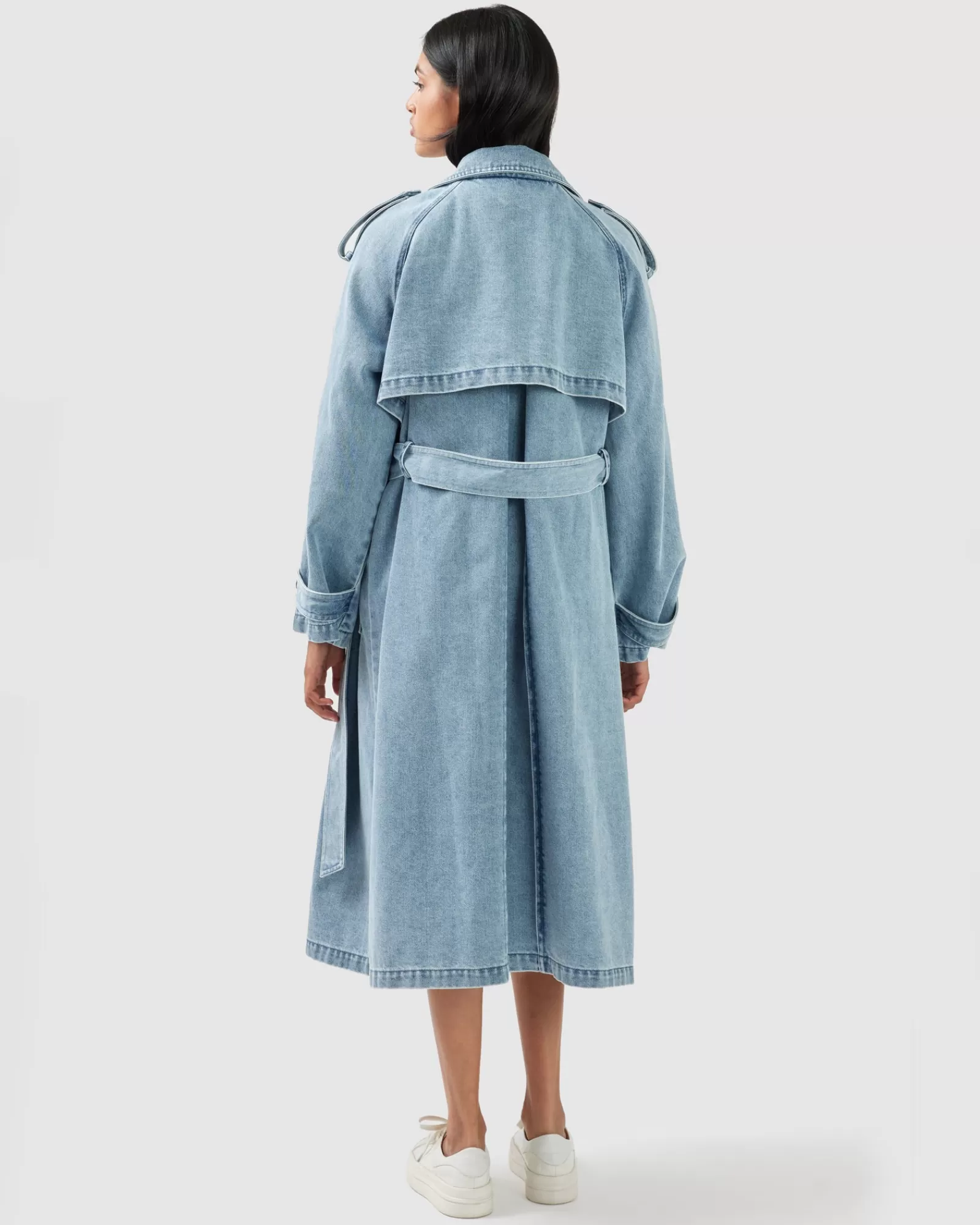 Sleek, dark denim provides a modern take on the classic trench coat. Giving the Wild Skies Denim Trench a decidedly powerful look.