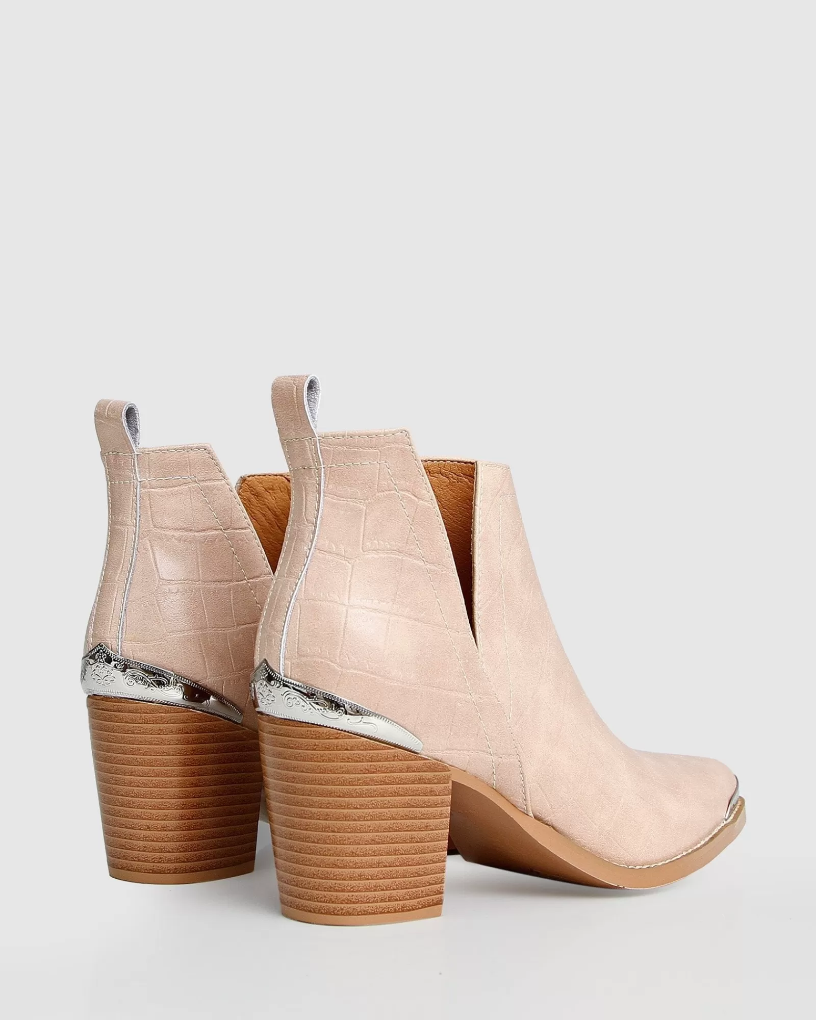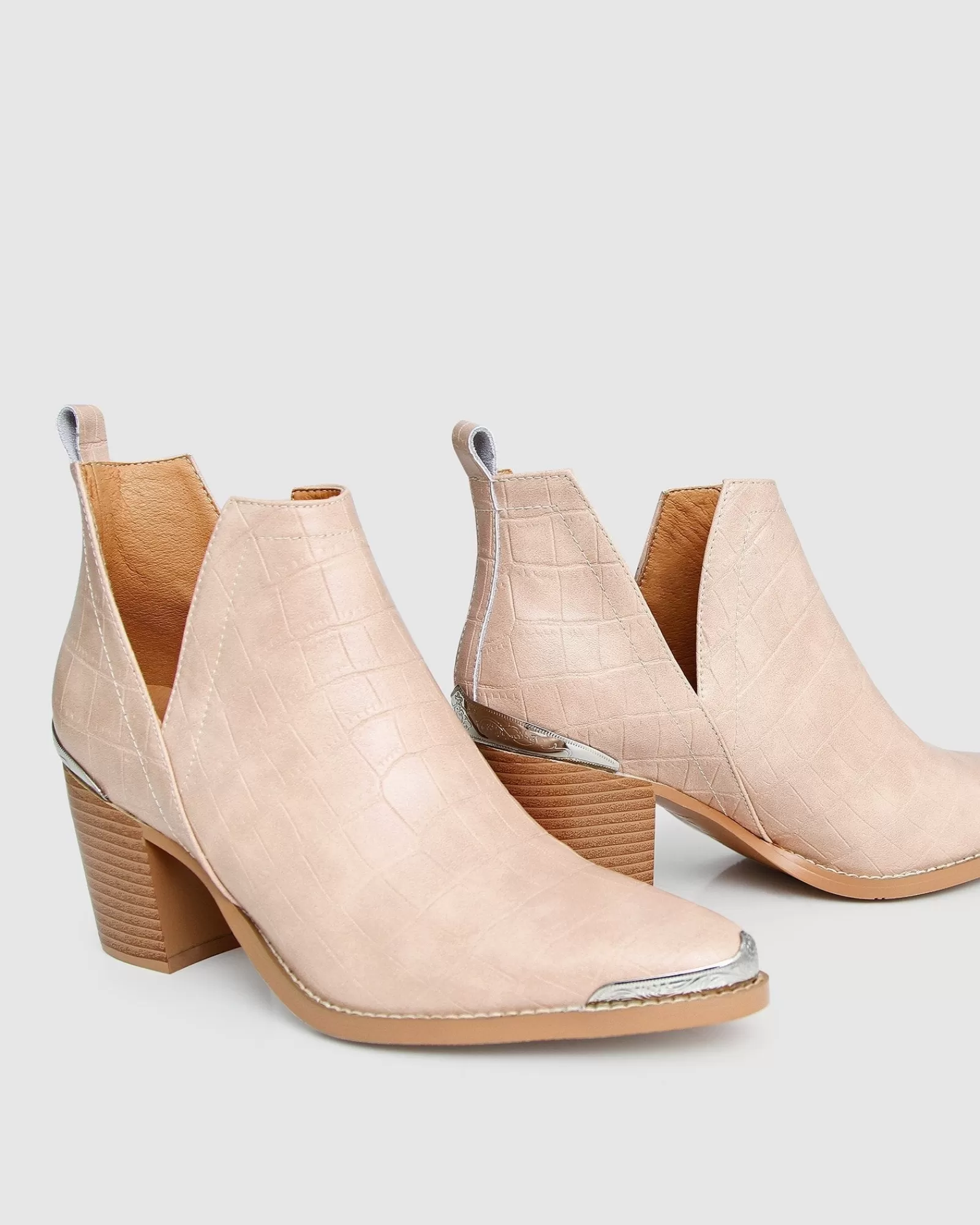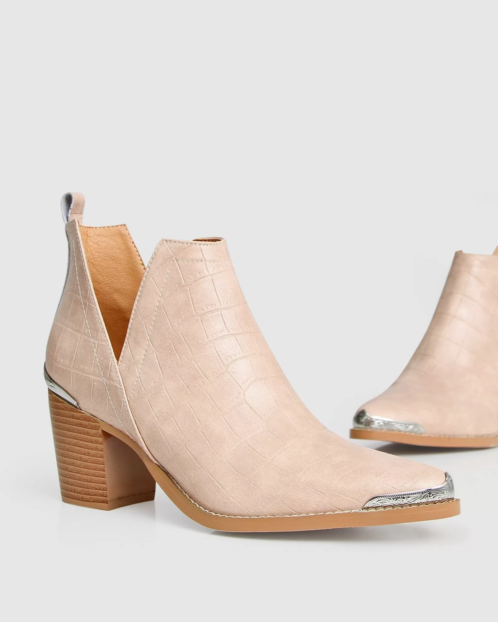 An etched metal capped heel and toe adds a dose of Western styling to the Austin Croc Embossed Ankle Boot. Grounded by a 7cm block heel, the cut-out silhouette and sleek croc embossed leather modernises the classic western features and creates a stylish addition to any outfit.