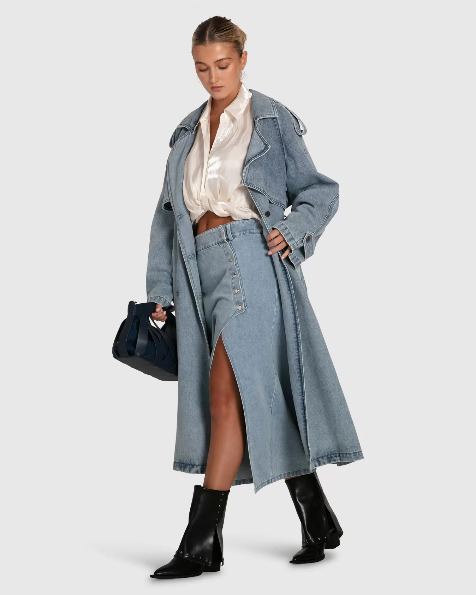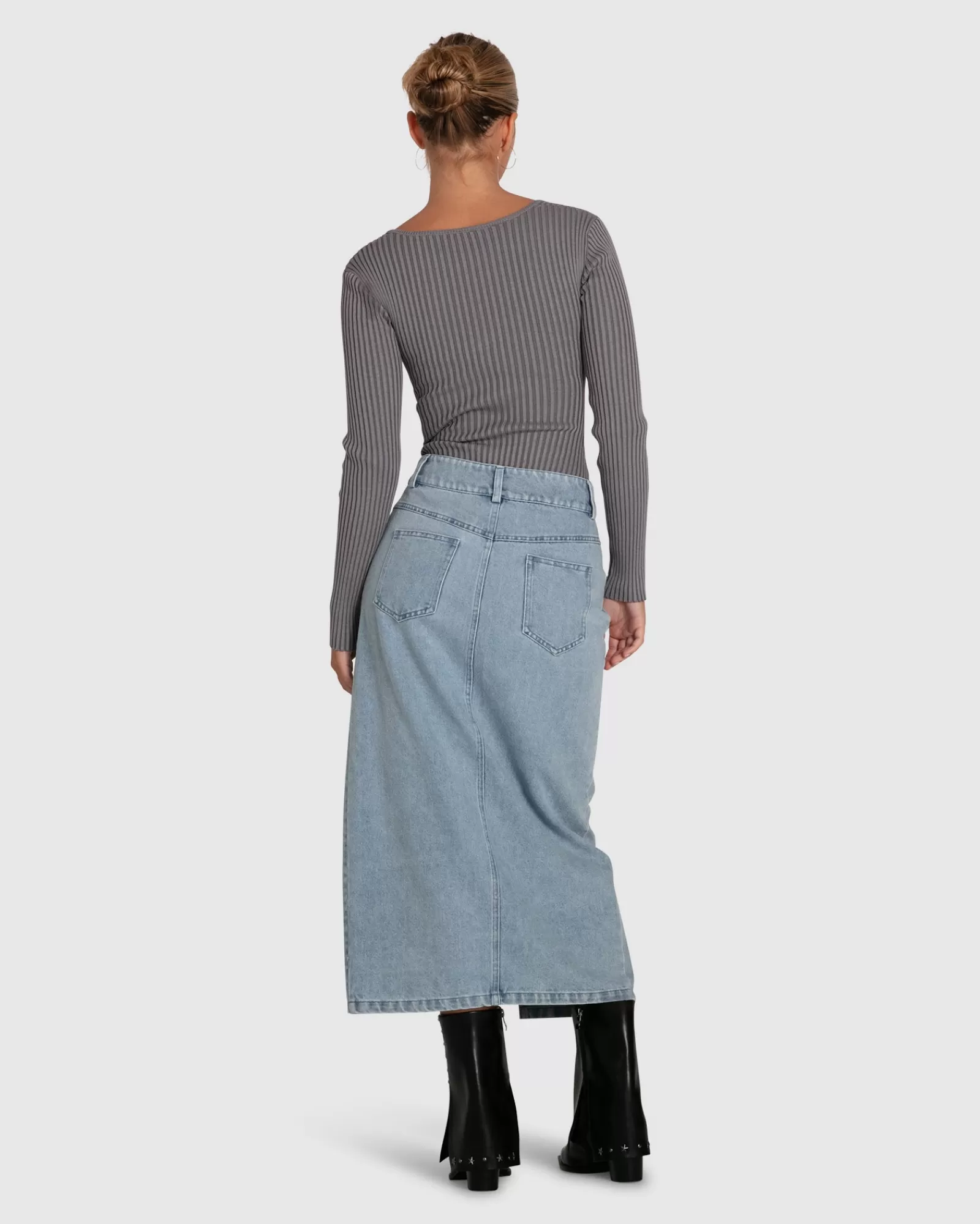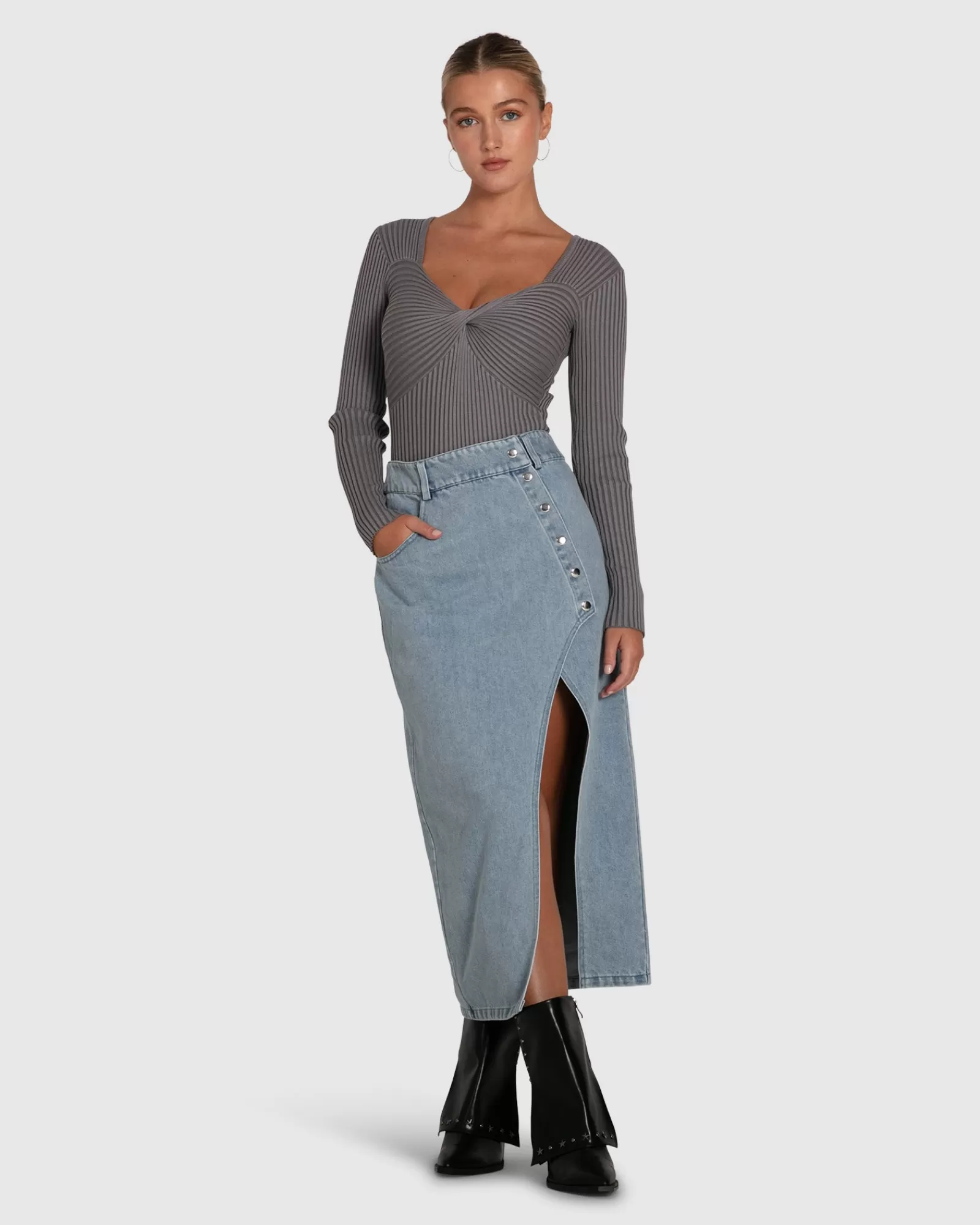 A front slit gives you room to move in the Can’t Forget You Denim Midi Skirt. Traditionally casual denim has had a refined update with the unique asymmetrical stud closure and stonewash finish.