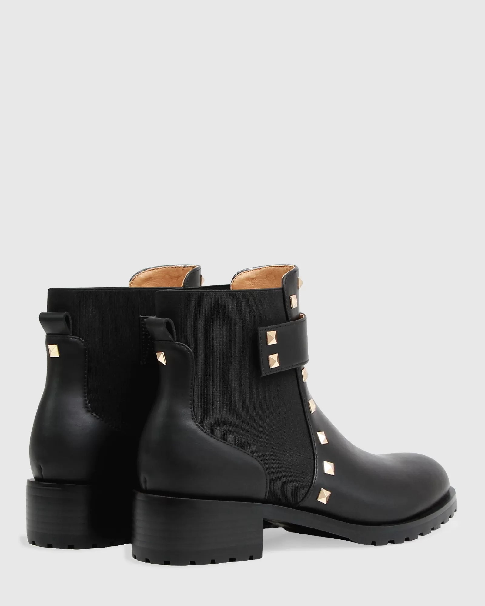 Gleaming gold pyramid studs stand out against the sleek black silhouette of the City Lights Leather Ankle Boot. Stretchy side panels and a classic comfortable lug sole make this boot the perfect addition to take your everyday winter wardrobe to the next level.