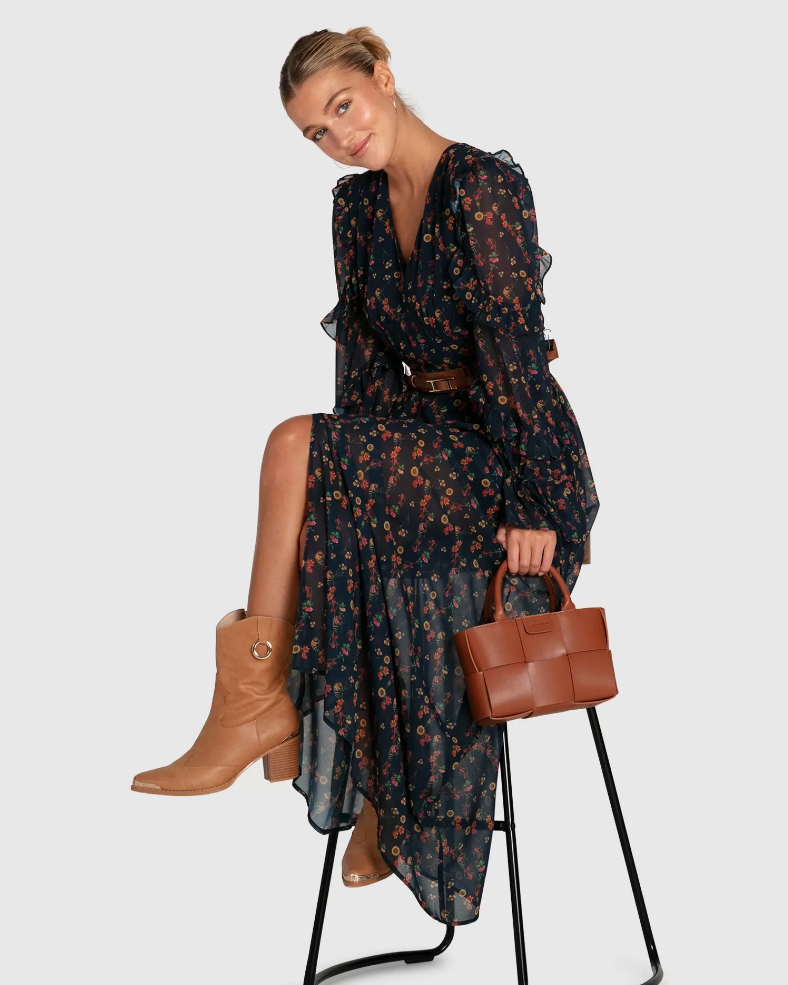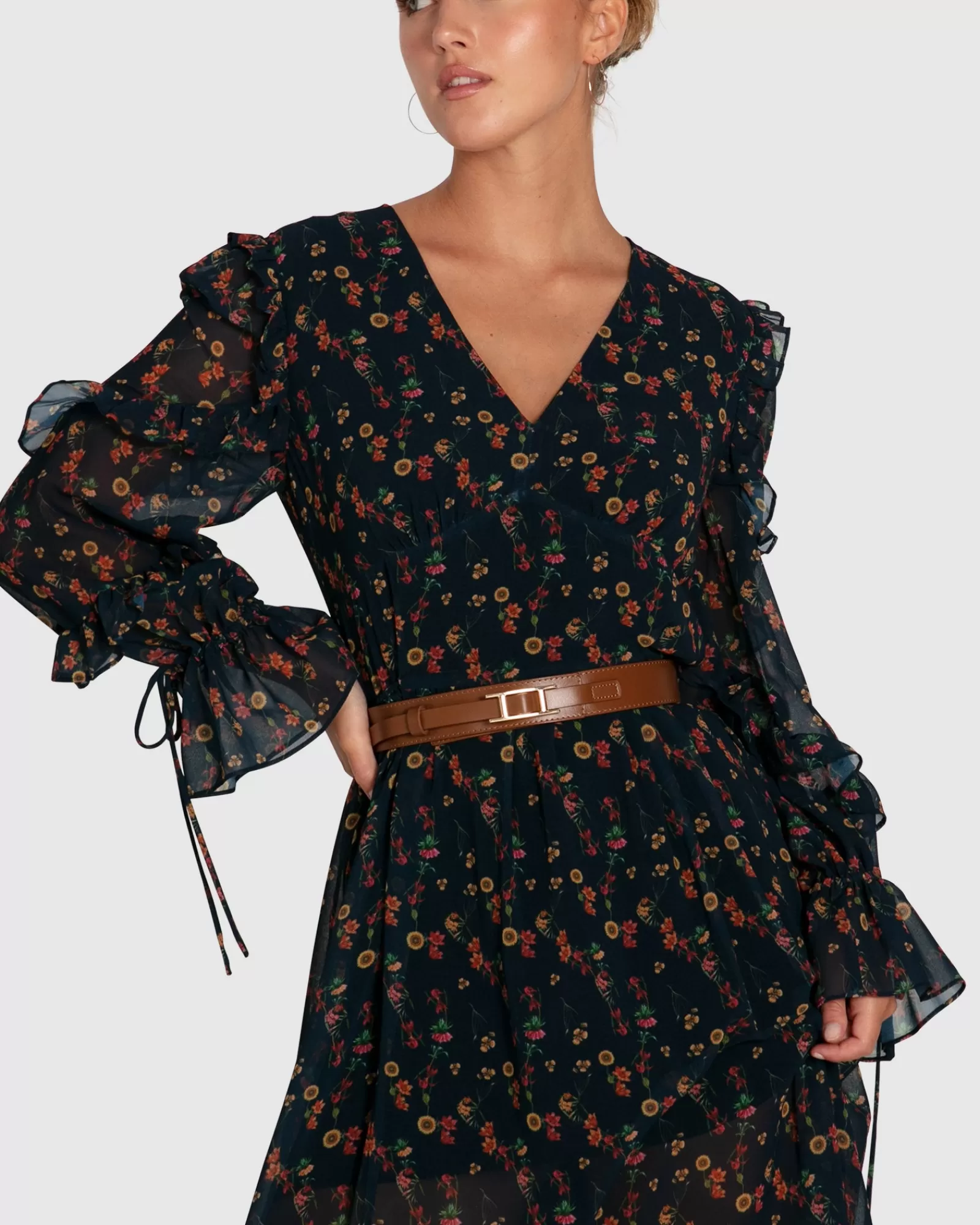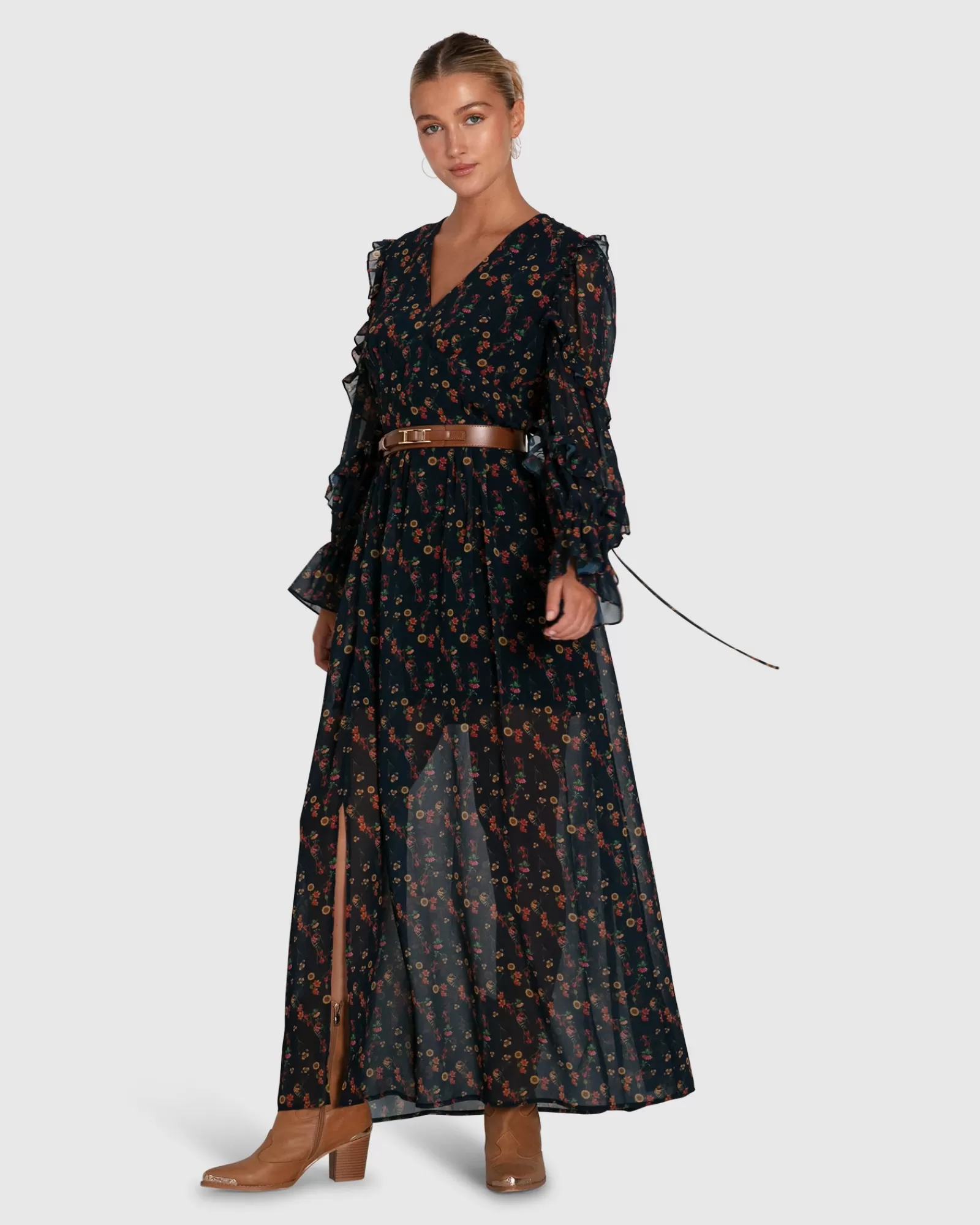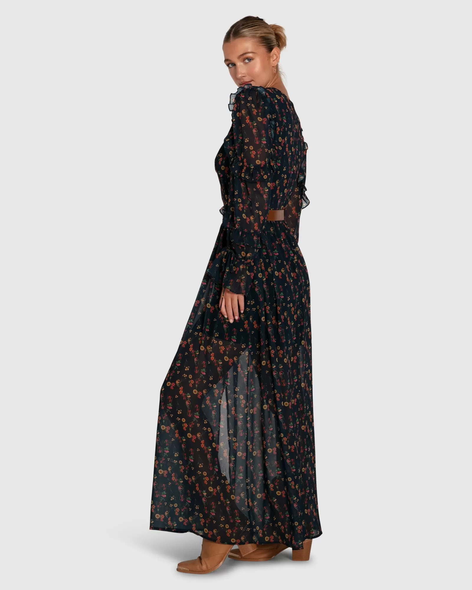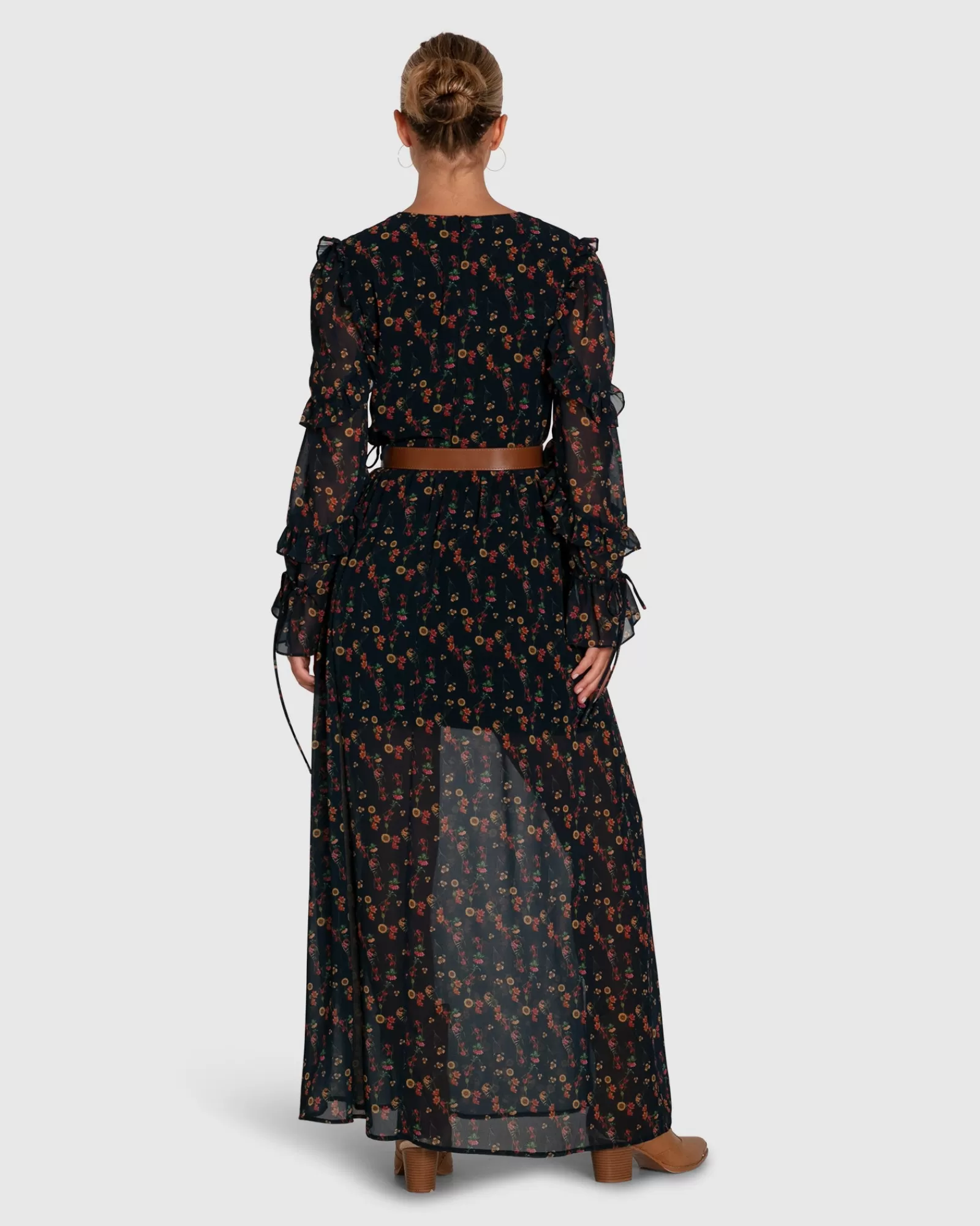 Dainty ruffles add texture to the Come As You Are Floral Maxi Dress, made with soft chiffon, a half-lined skirt and an unlined sleeve for a sheer, romantic feel. Also featuring adjustable ties for the waist and cuffs.