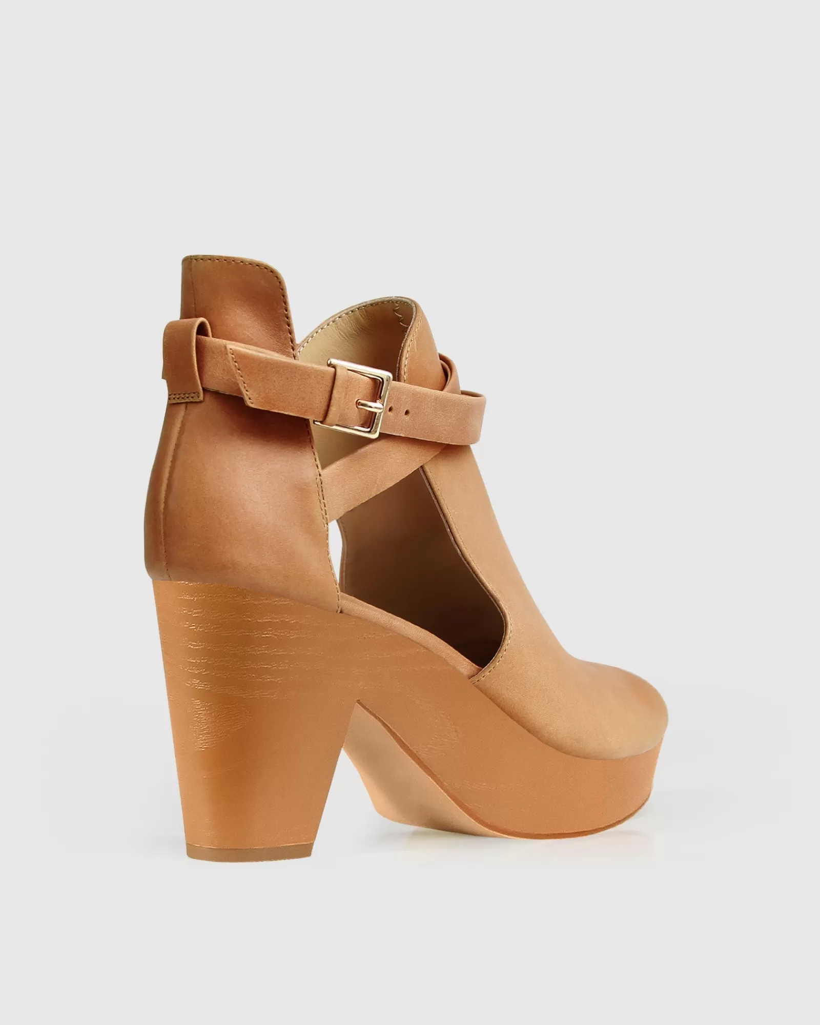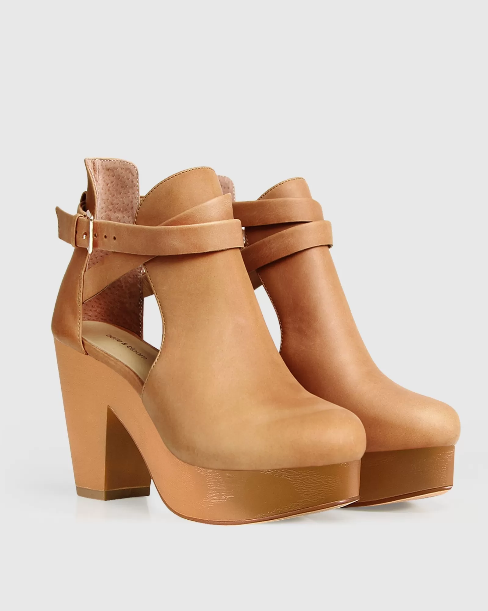 A woodgrain finish platform and heel add to the 70‚Äôs vibe of the Fearless Clog Ankle Boot by Belle and Bloom. Feat…