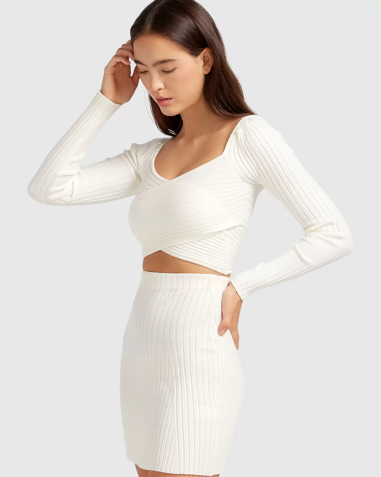 Made to be worn on its own or layered, our Forget Me Not Knit Crop is all about simple details. With an accentuated rib and crossover panelled front for a snug fit, you can pair it with its soul mate the C’est Belle Knit Mini skirt, or layer it up over your favourite tank/bodycon dress.