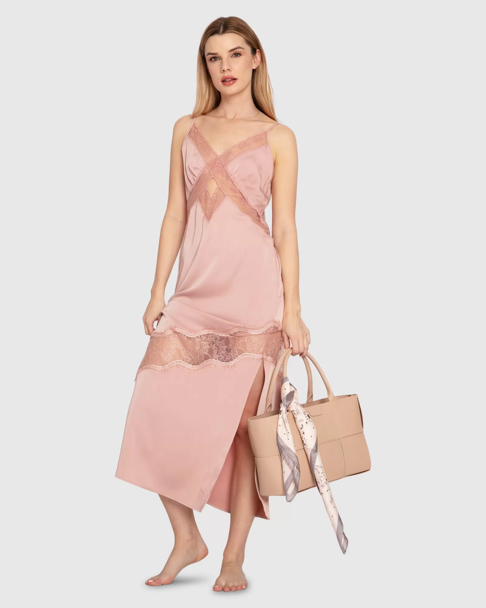 The Heavenly Bodies Lace Slip Dress is a nod to vintage glam with a contemporary twist. The soft satin and side split ensure all-day comfort, while its versatility allows for effortless styling‚ pair it with heels for a night out or embrace casual chic with sneakers and a leather jacket.