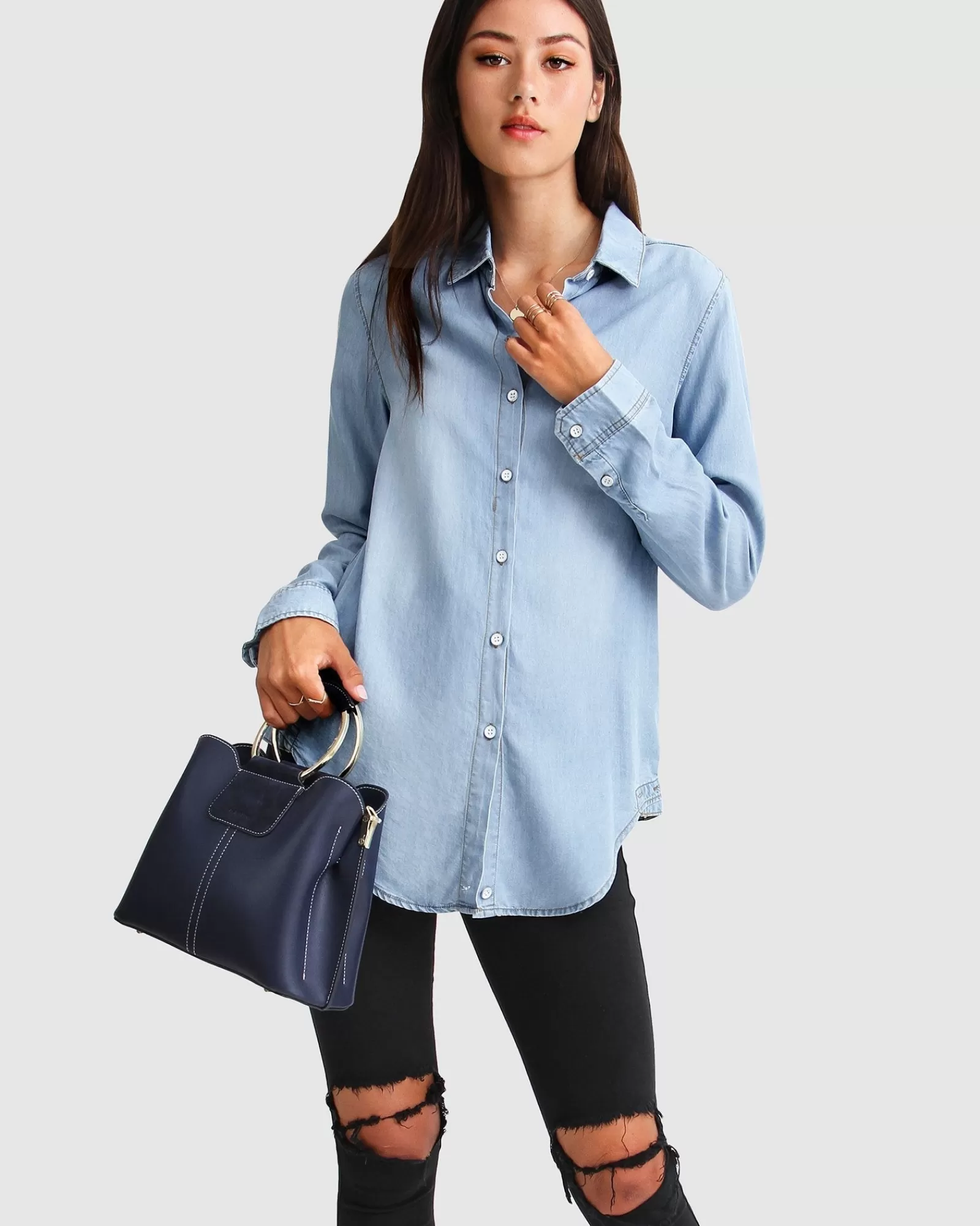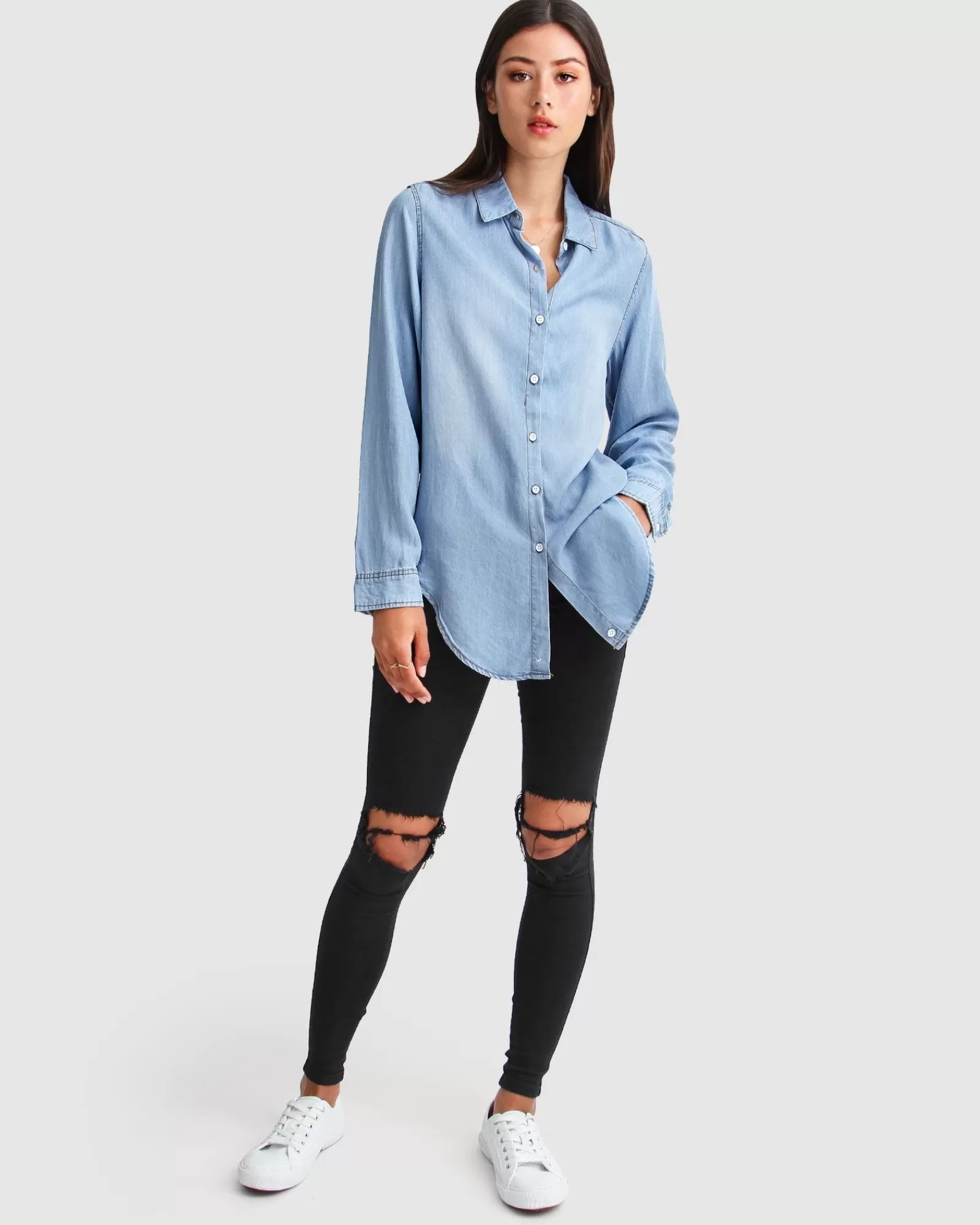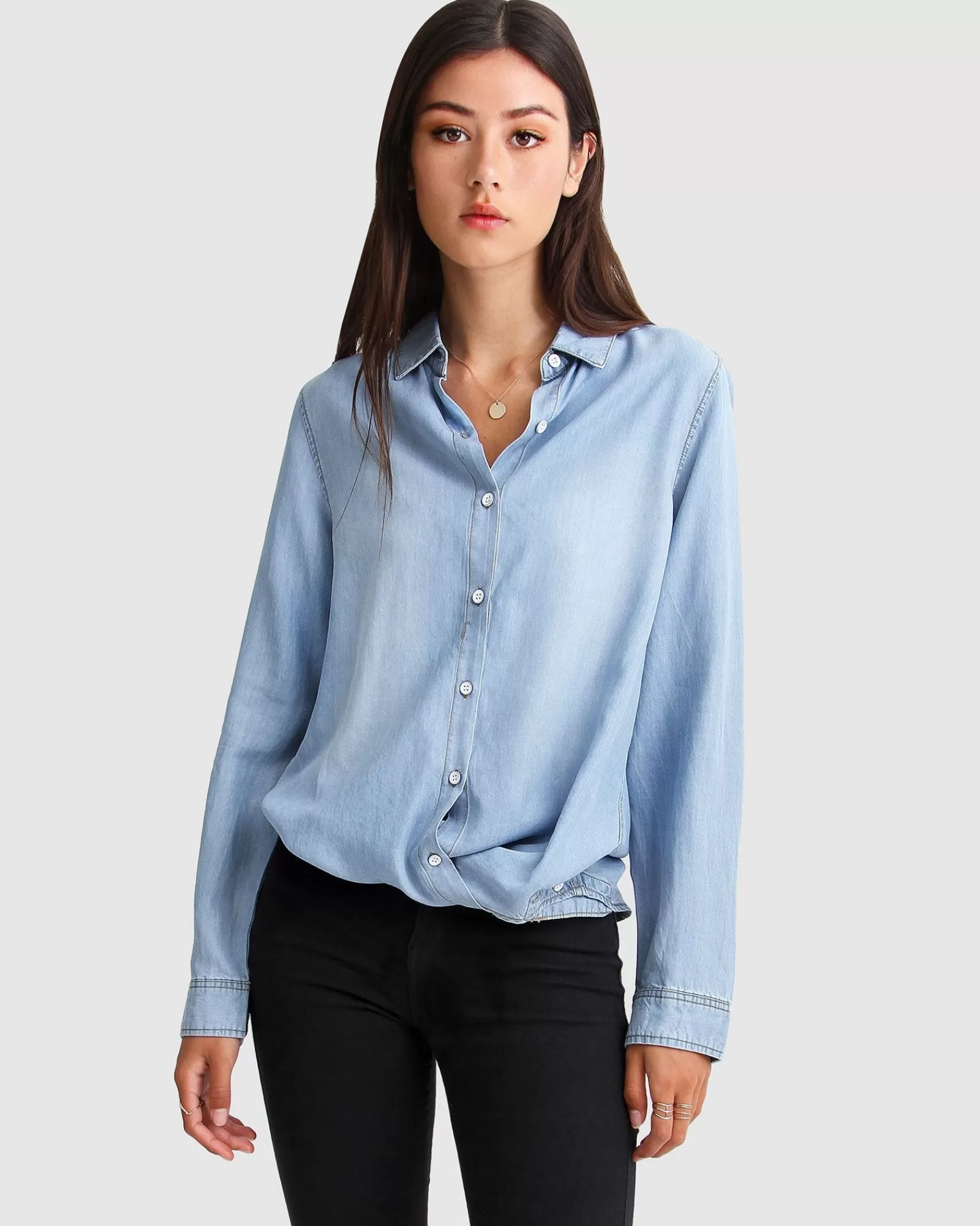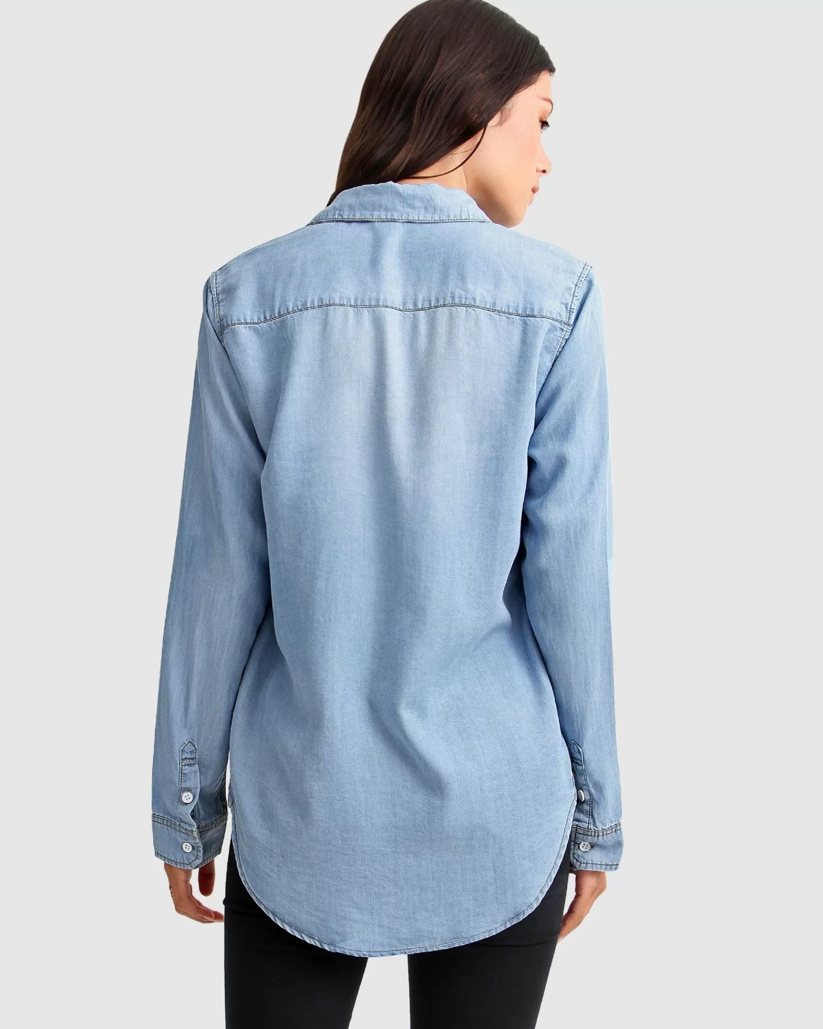 Made in lightweight denim, the Keep Me Wild Denim Top is an easy upgrade to a classic wardrobe staple. Button the bottom of the placket to the sides to create an effortless wrap look for a shorter top.
