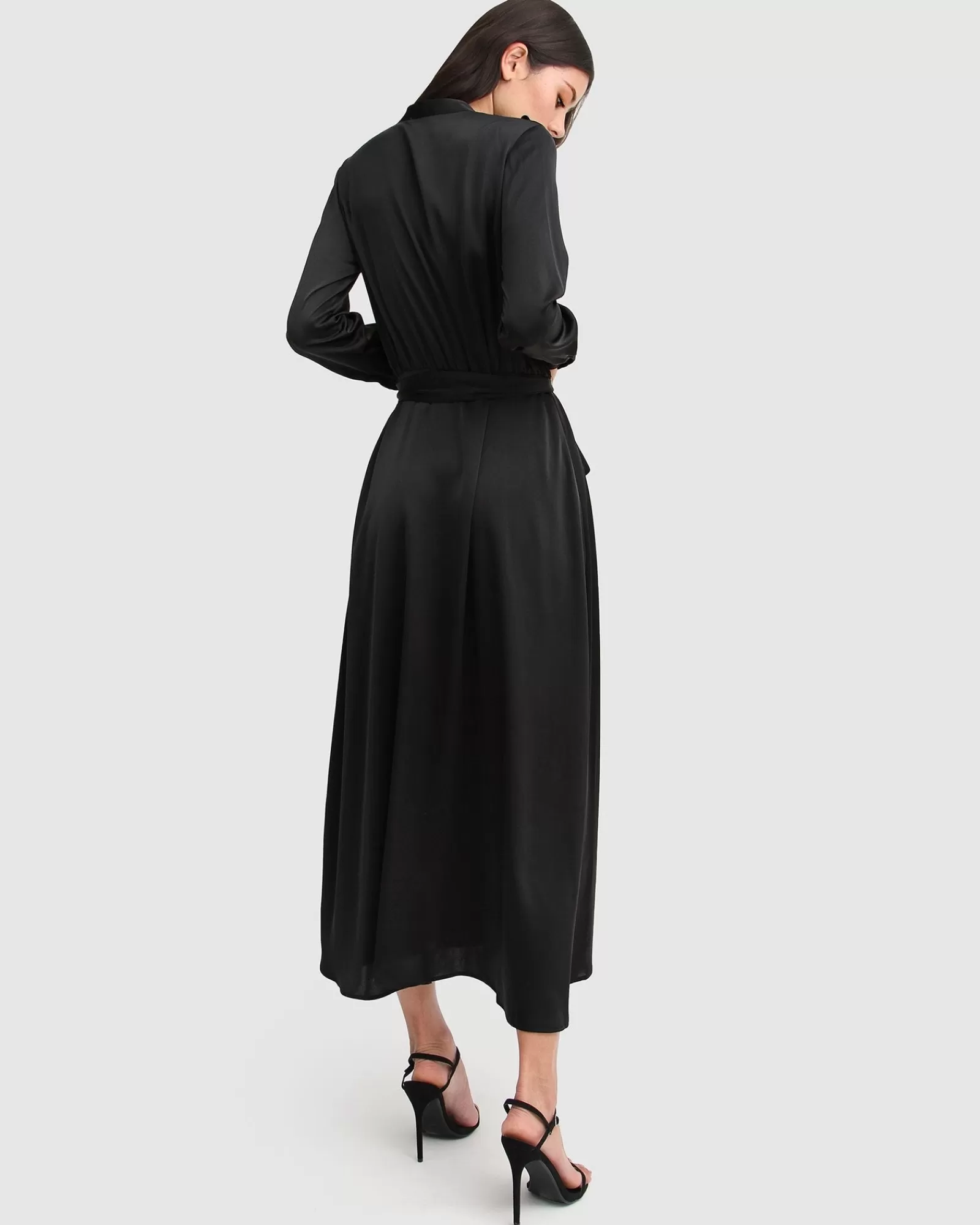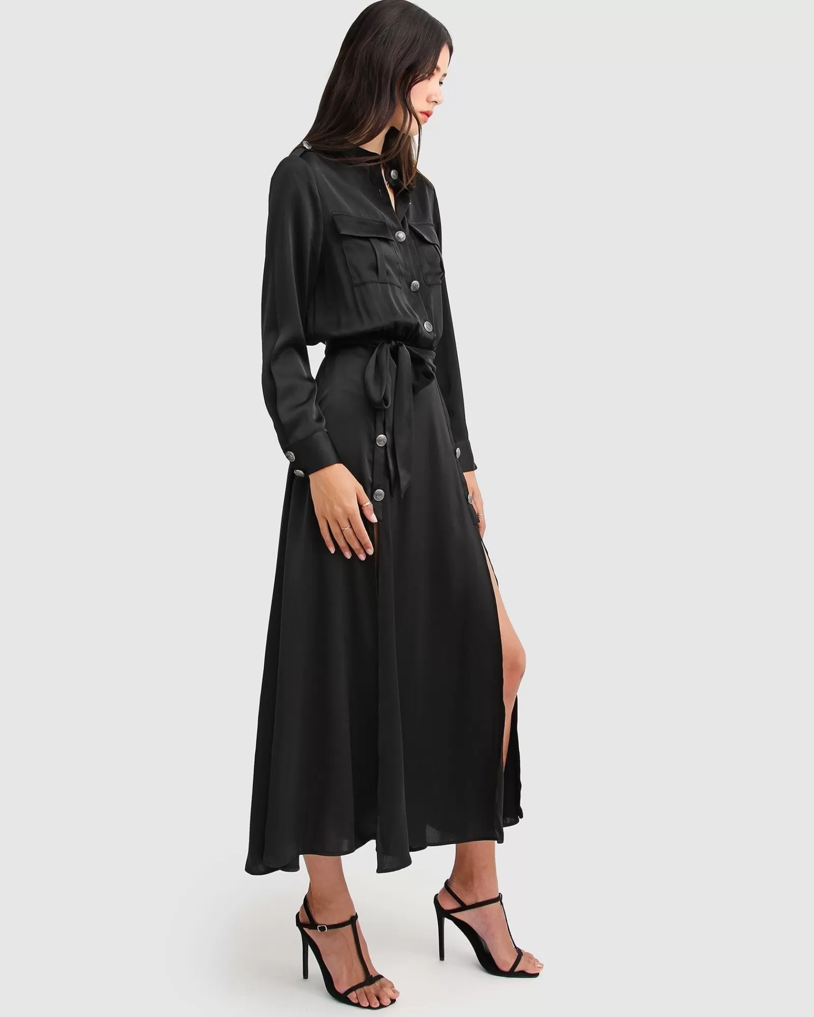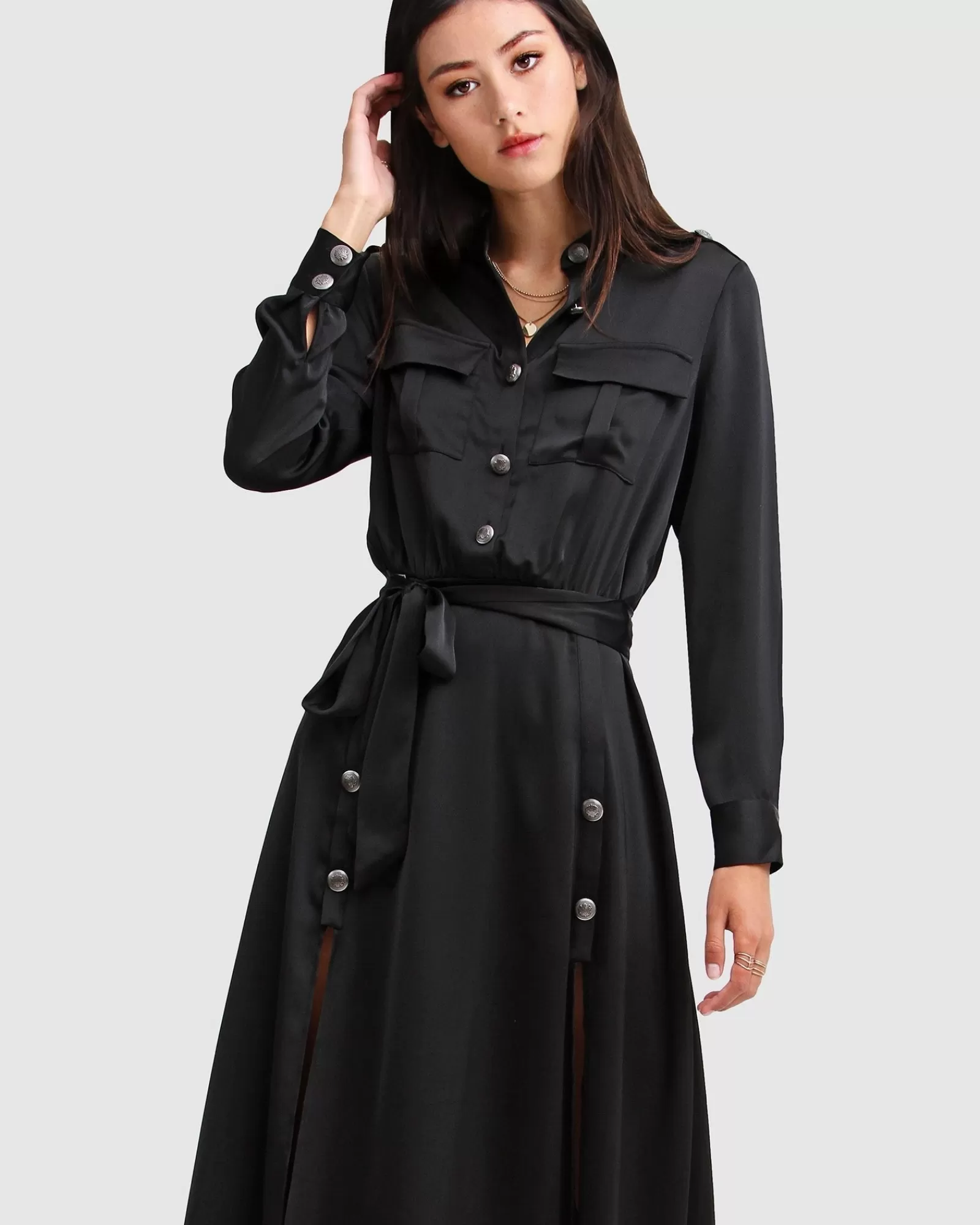 Elegantly stunning, the Lover To Lover Maxi Shirt Dress follows the classic military style in a silk-like fabric. With long sleeves and hemline, the high slits make an even bolder statement than the ornate metal buttons.