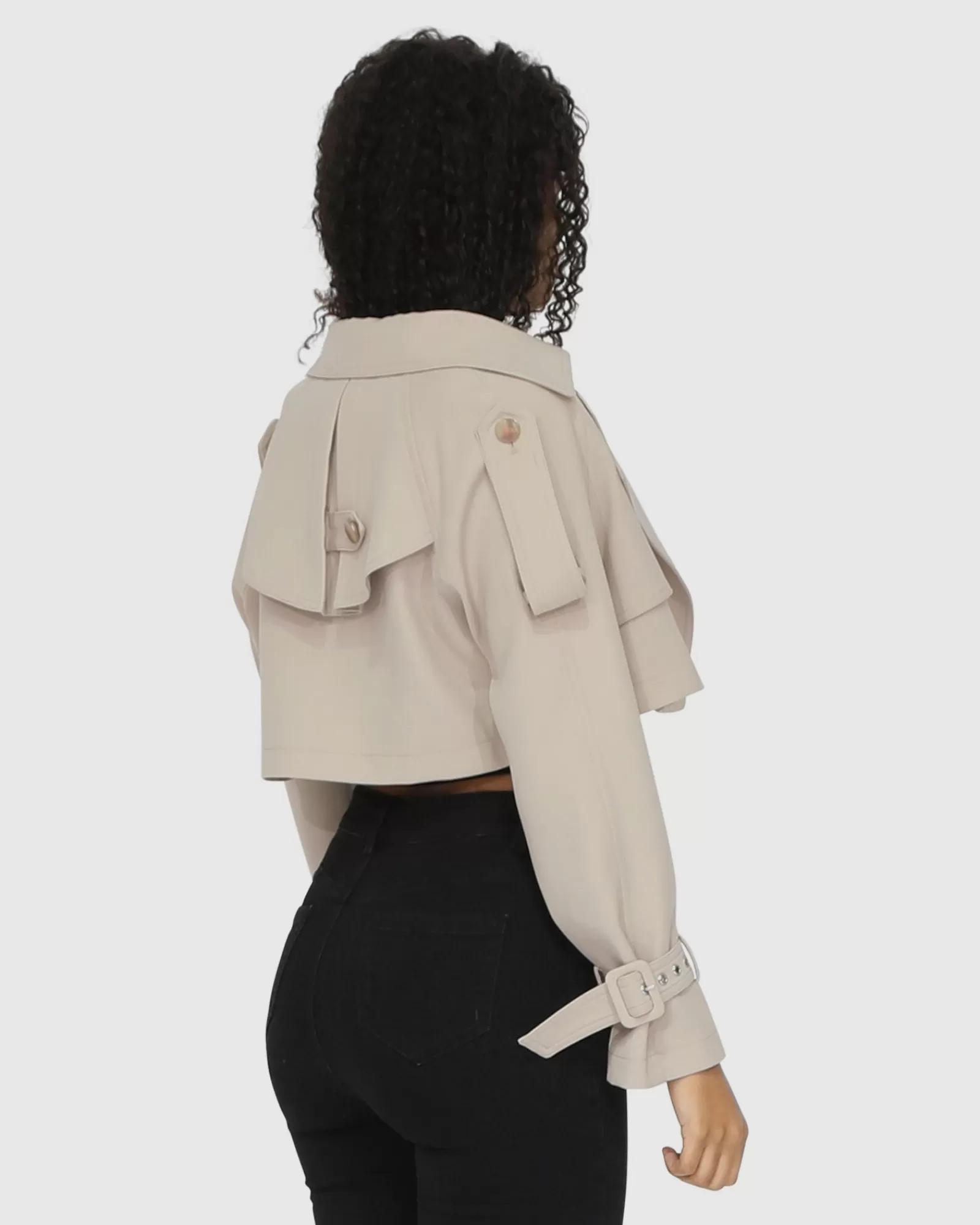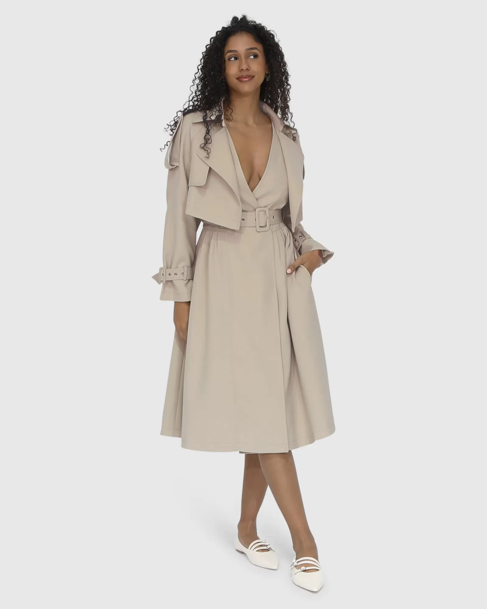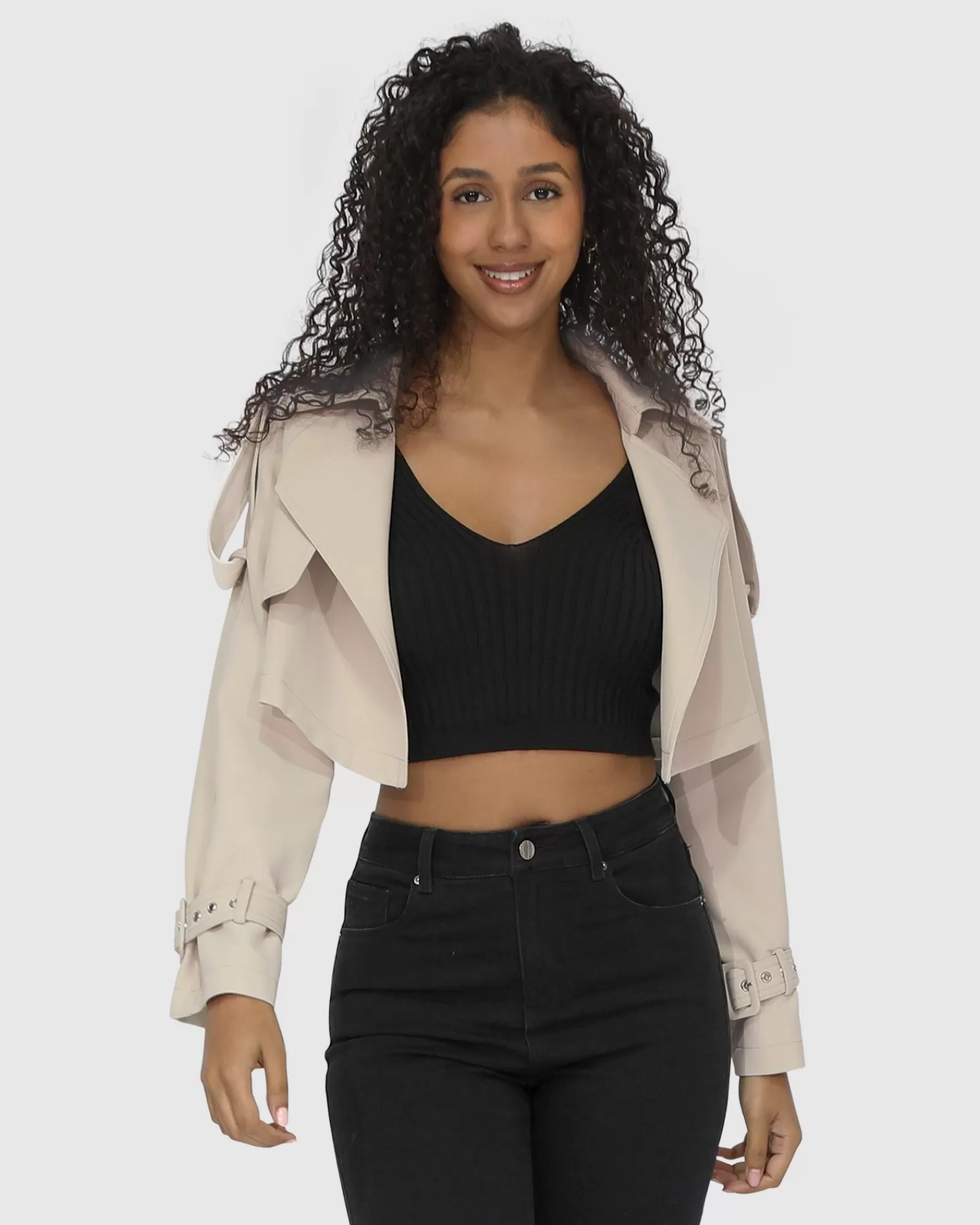 The Manhattan Cropped Trench is the perfect addition to your wardrobe. With classic storm flap detailing and finished off with gold tone hardware, this is a staple piece for all seasons! A match made in heaven for the Miss Independence Midi Dress (sold separately).
