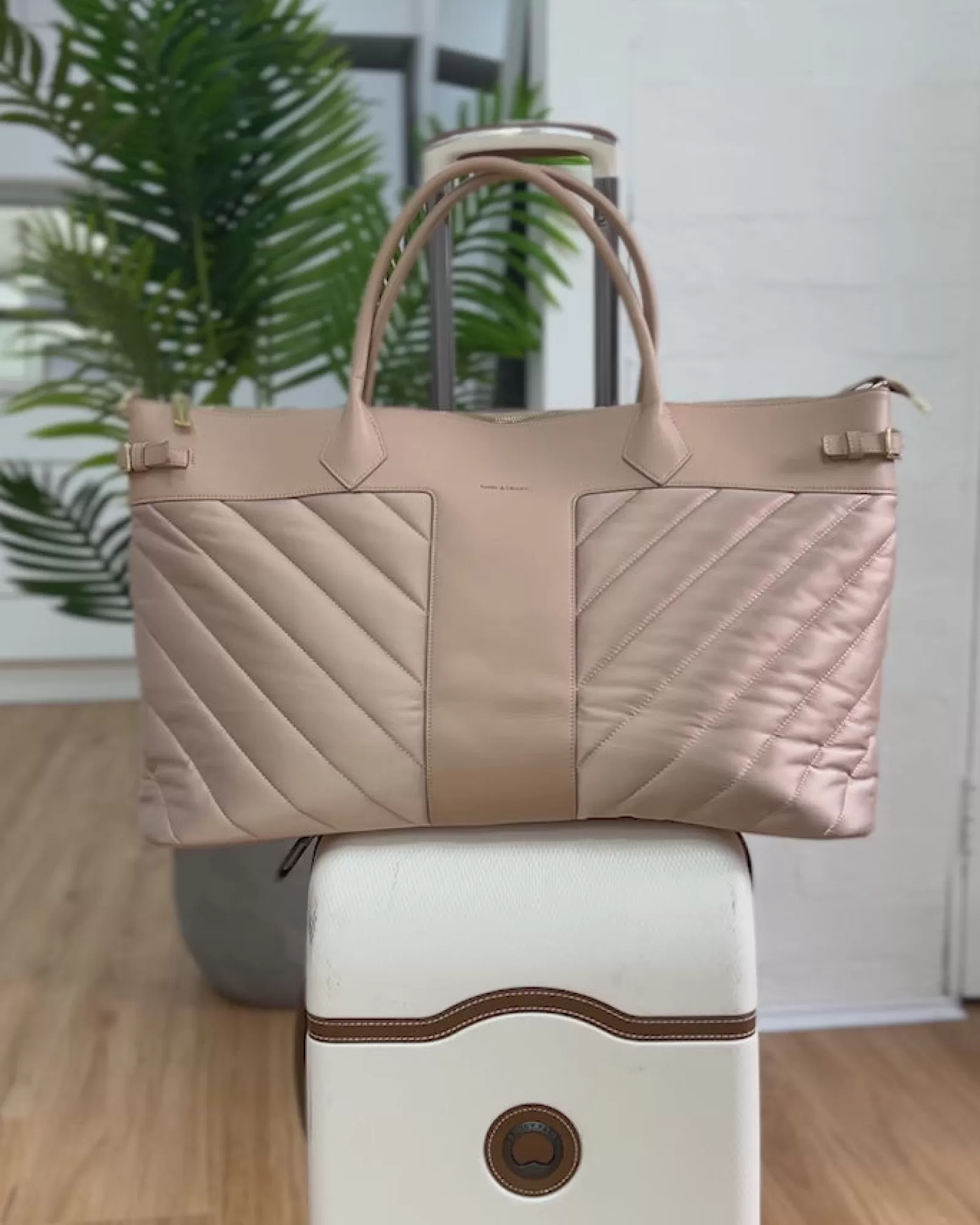 The perfect carry-on travel bag has arrived! Featuring a suitcase sleeve to ensure all your luggage stays together, multiple inner compartments for keeping your essentials organised, an outer zip pocket for easy access to your passport, and a detachable crossbody strap. The Meet Me In Paris Weekender Bag really has it all, packaged into a stylish leather design featuring soft quilting made from 100% recycled polyester!