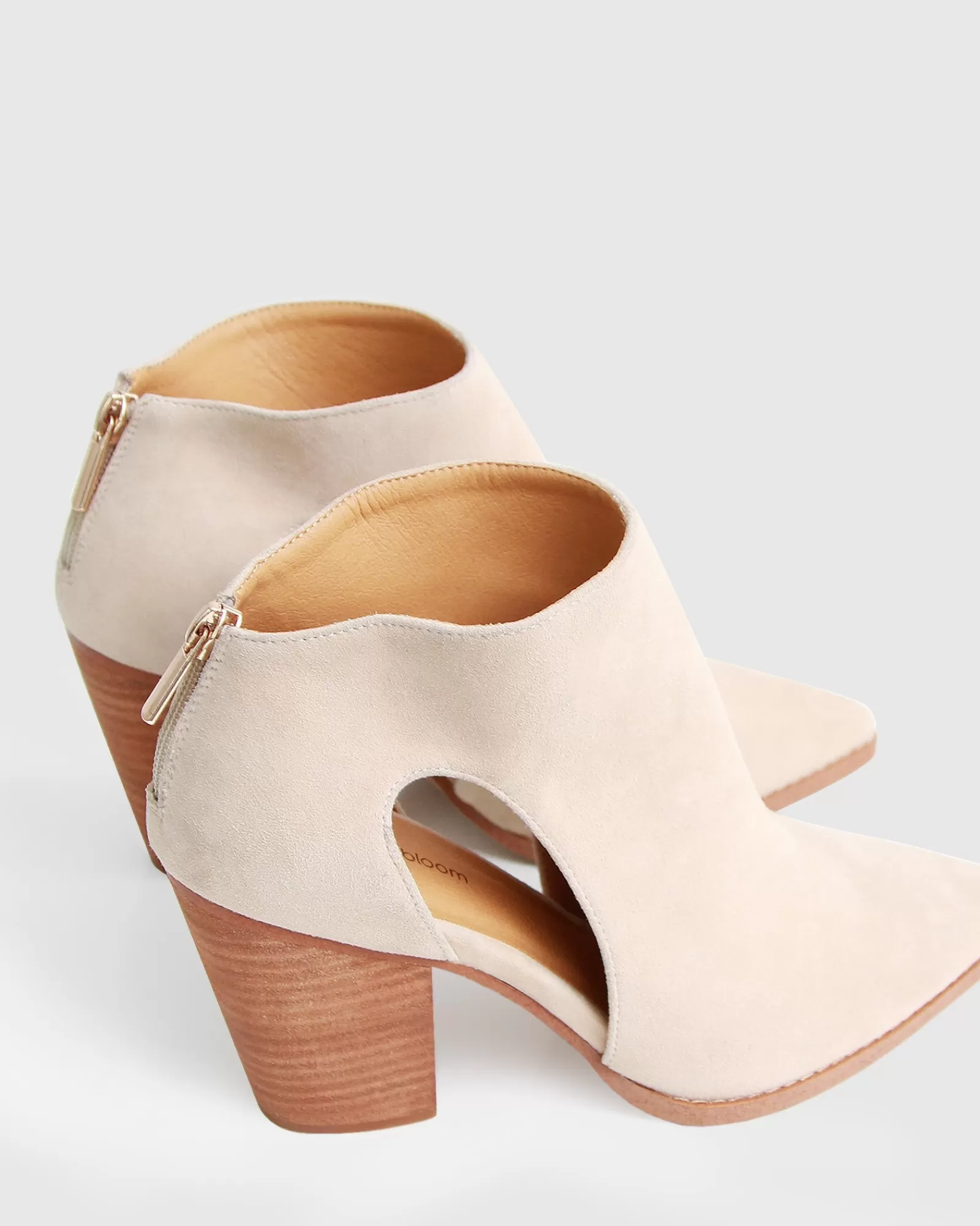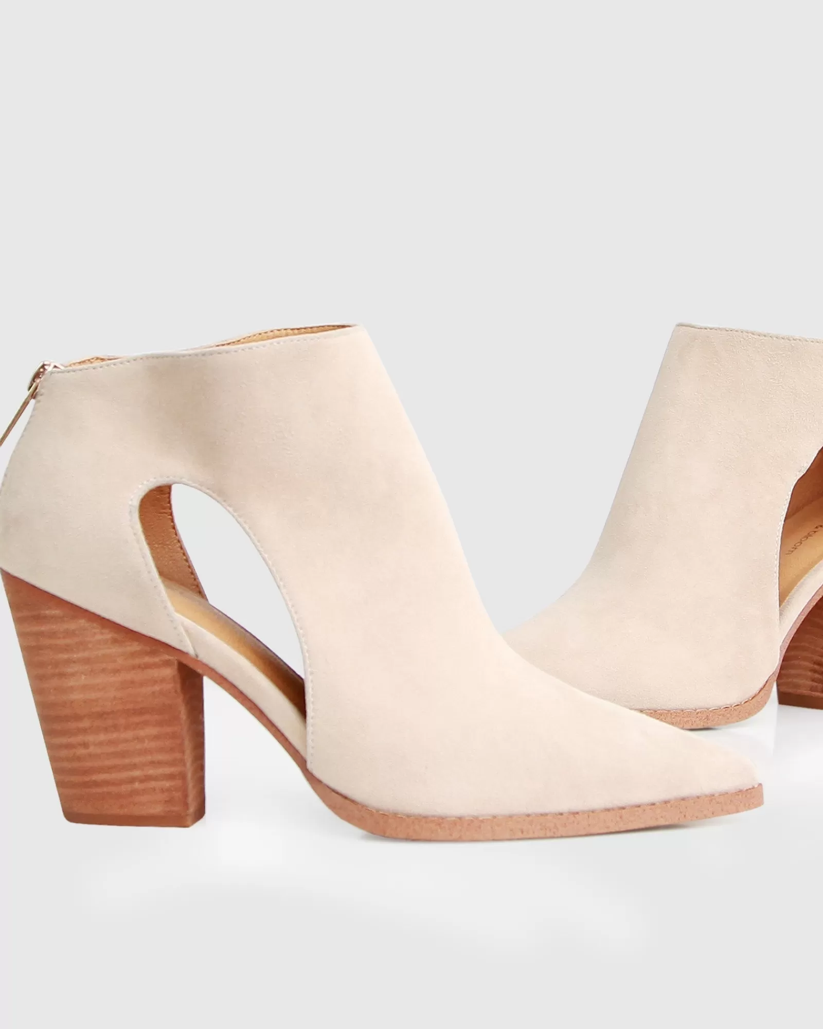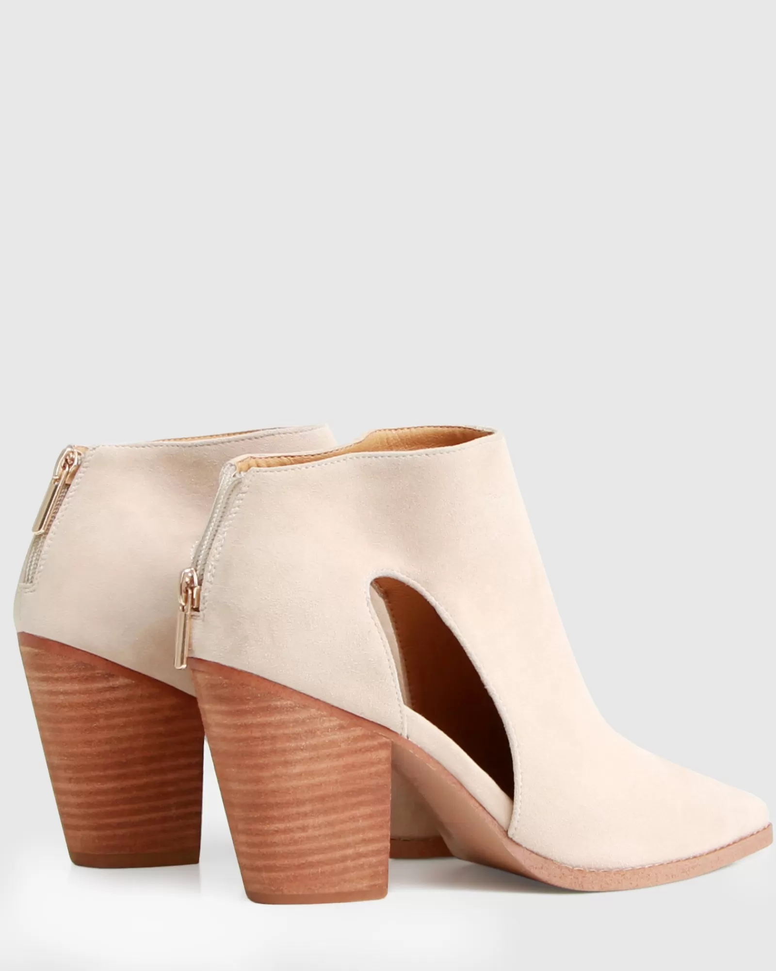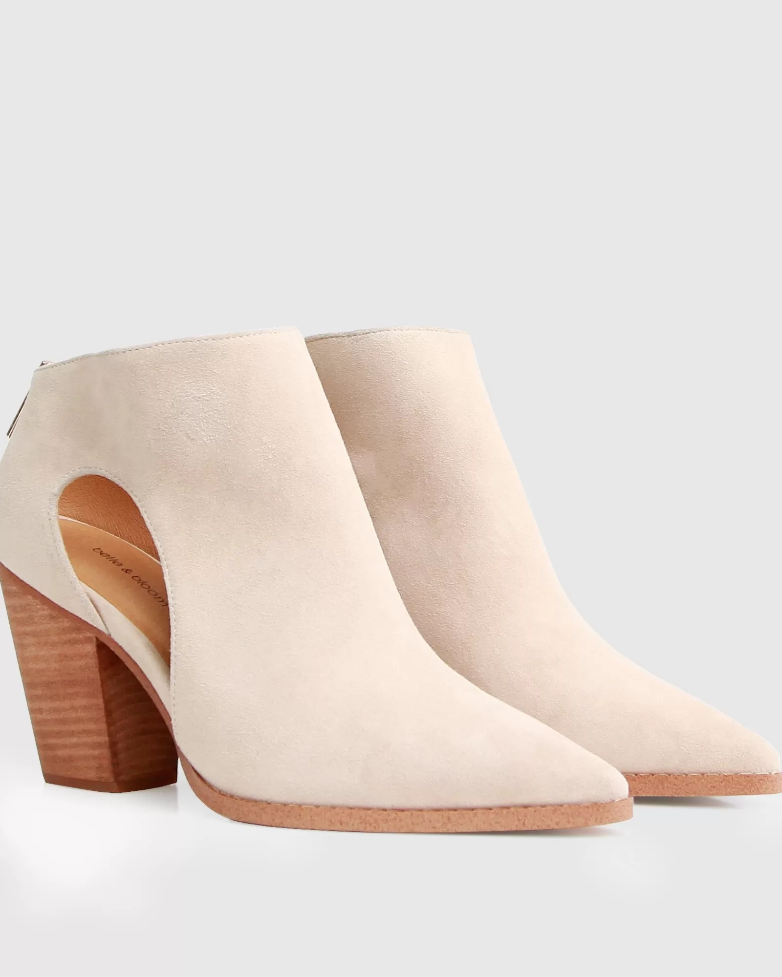 The edgy cutout silhouette of the Midnight Special Suede Ankle Boots by Belle & Bloom is balanced with a classic suede and wooden heel pairing.