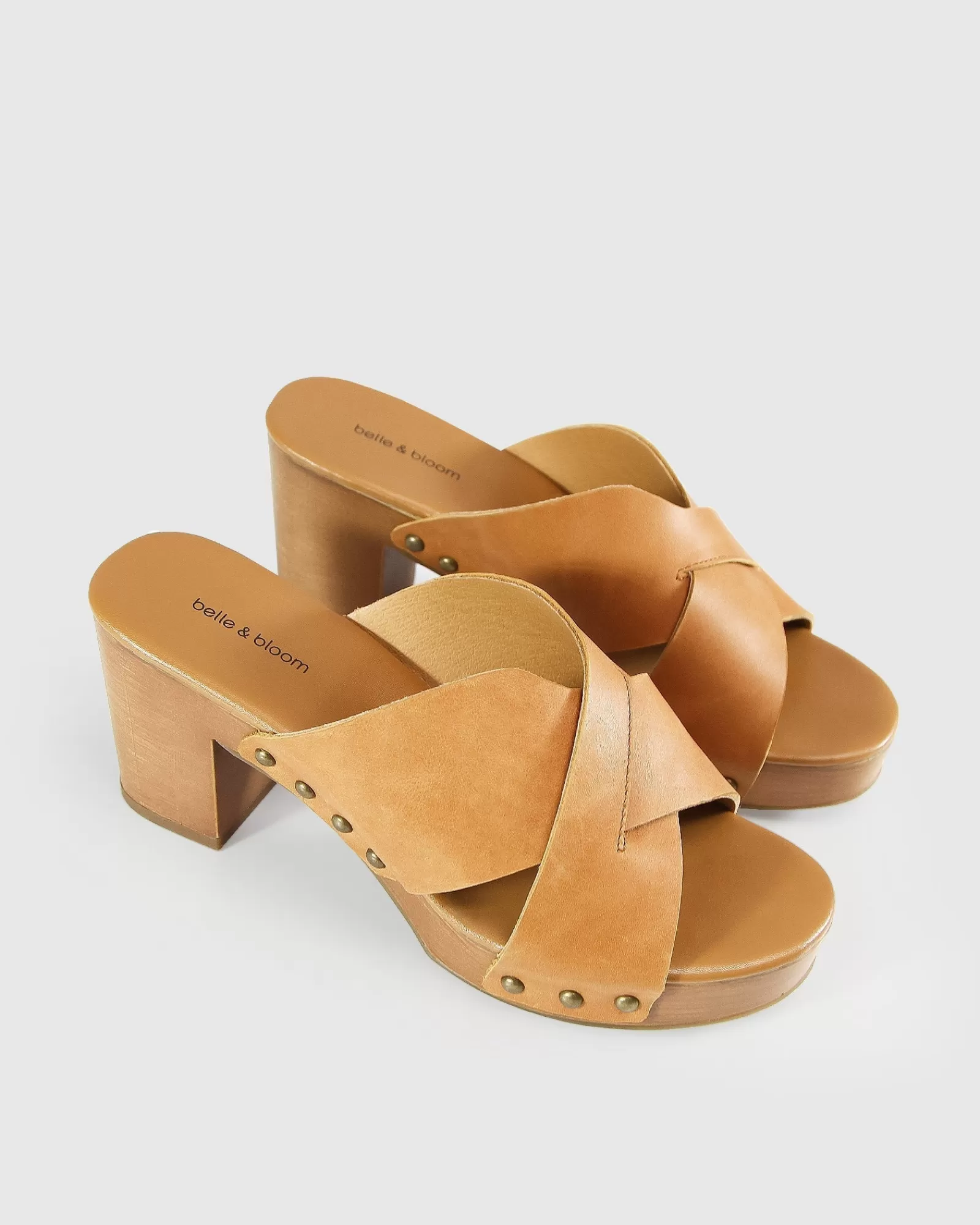 A chunky wood finish platform boosts the effortlessly cool Midtown Clog Mule, styled with leather crossover straps, an open toe and eye catching gold rivets.