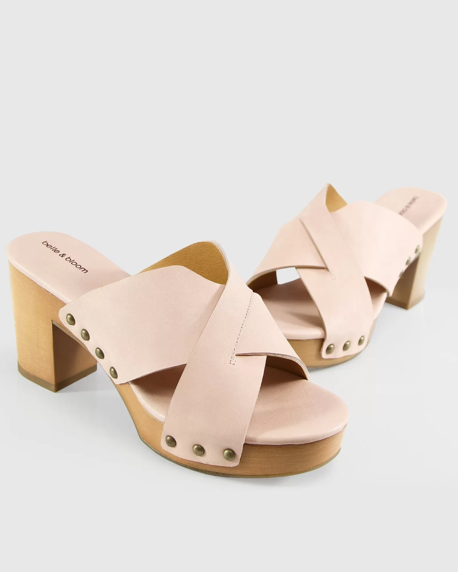 A chunky wood finish platform boosts the effortlessly cool Midtown Clog Mule, styled with leather crossover straps, an open toe and eye catching gold rivets.