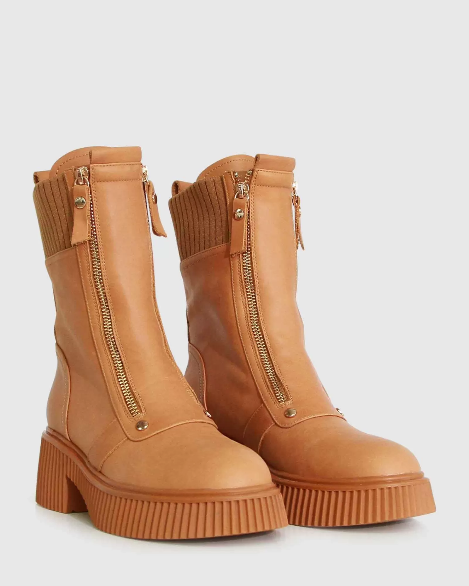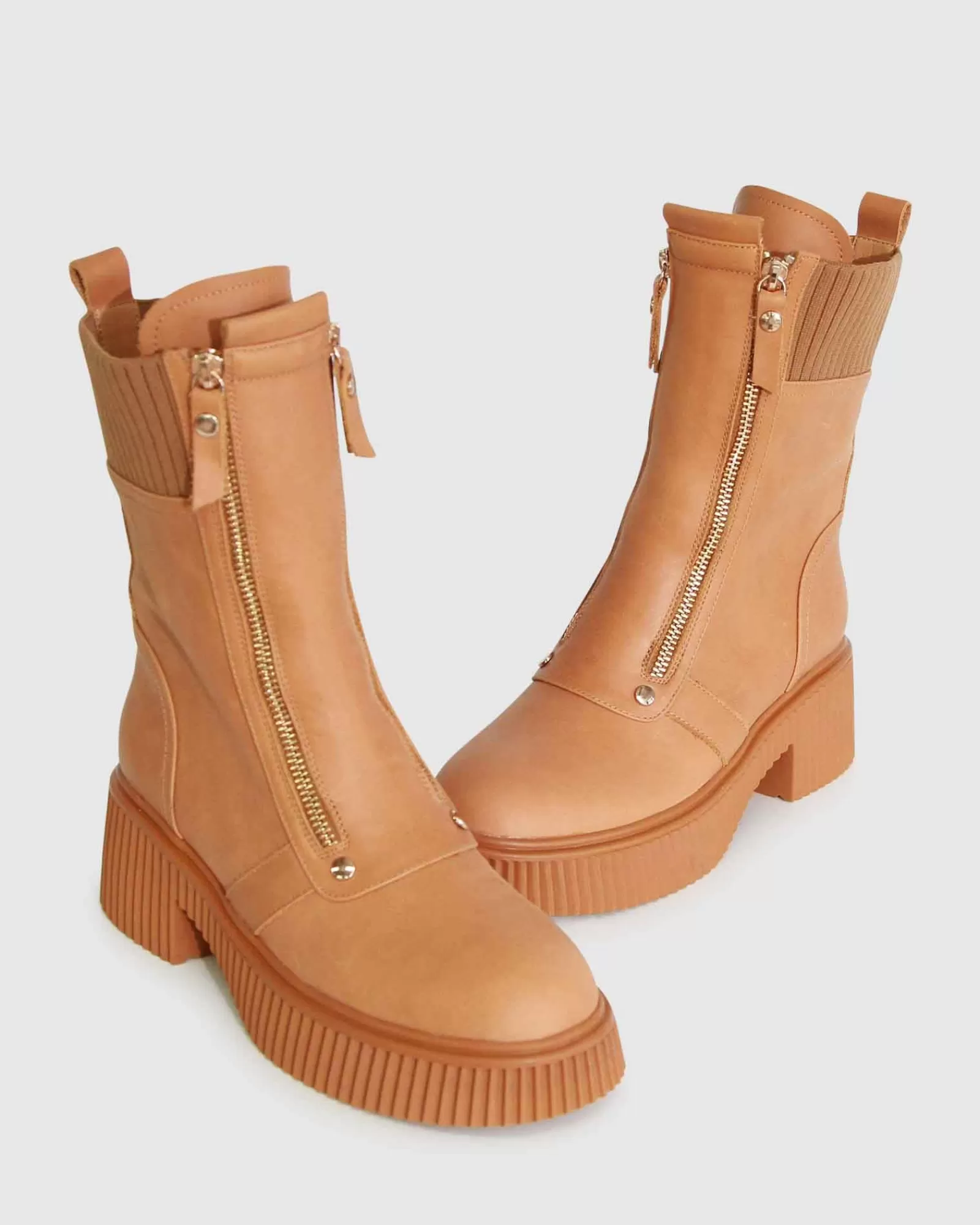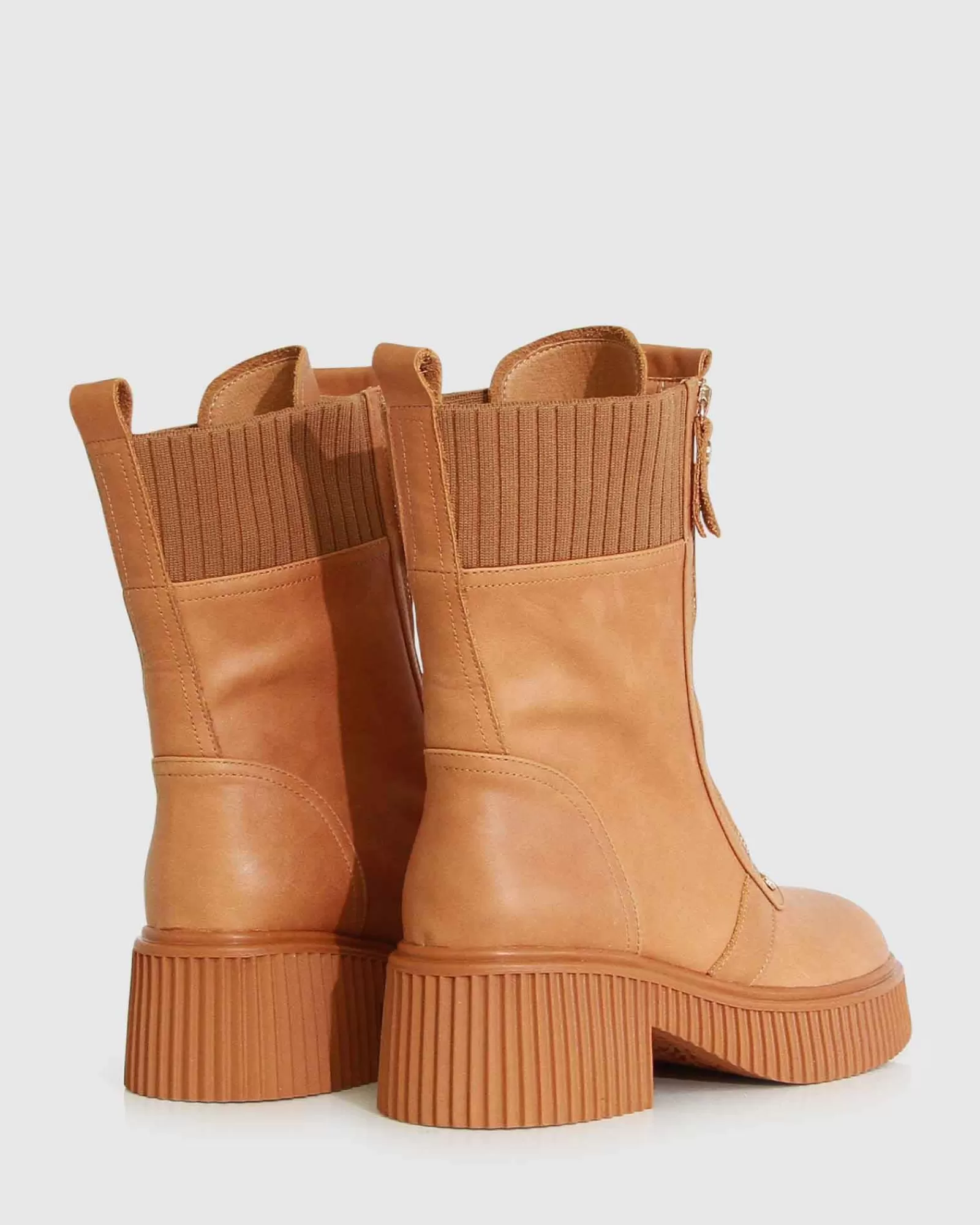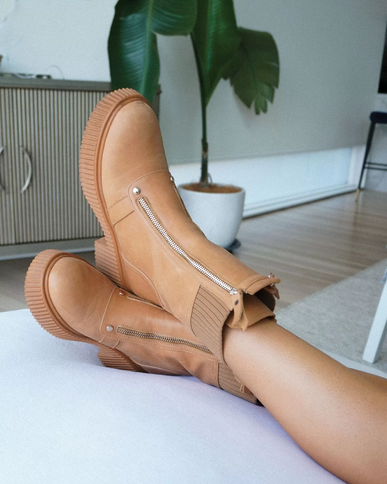 Ribbed panels and a unique chunky lug sole add a contemporary edge to this zip up- moto boot. Featuring a rounded toe and gleaming gold hardware the More To Come Ankle Boot is sure to become your everyday go-to wardrobe staple.