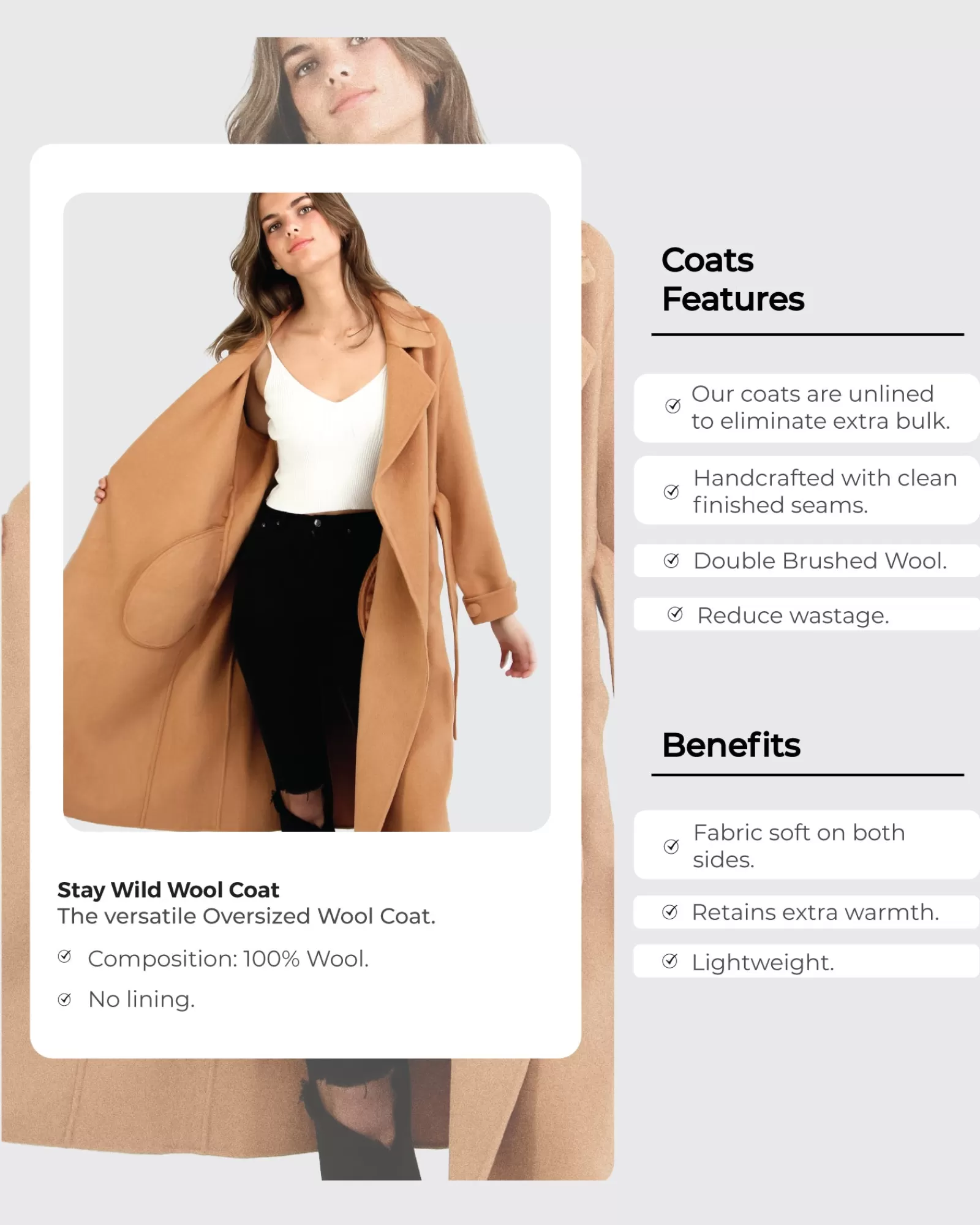 The versatile Stay Wild Oversized Wool Coat can be worn belted for the workweek or remove it for a casual weekend look. Made of pure wool, this coat features buttoned cuff details and oversized collar.