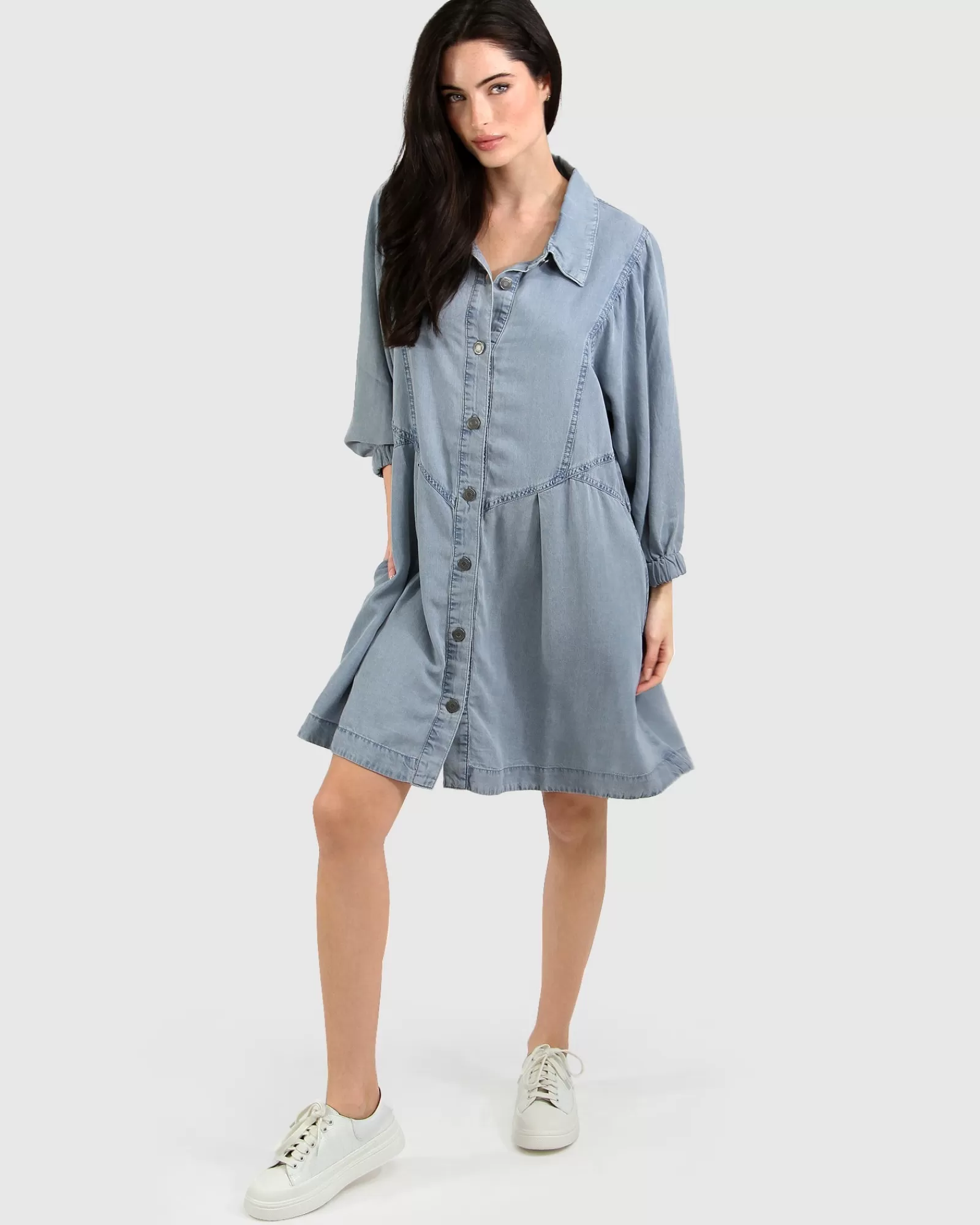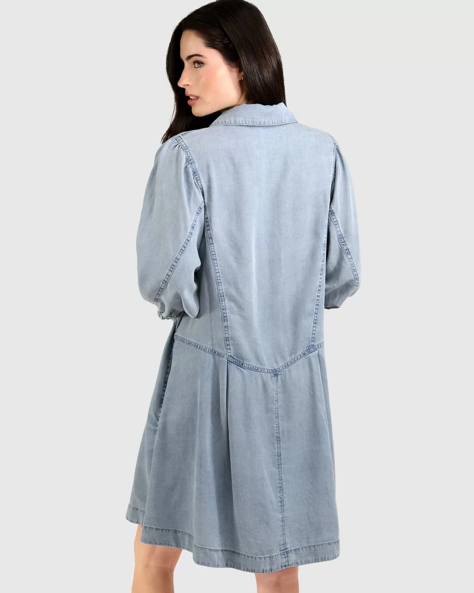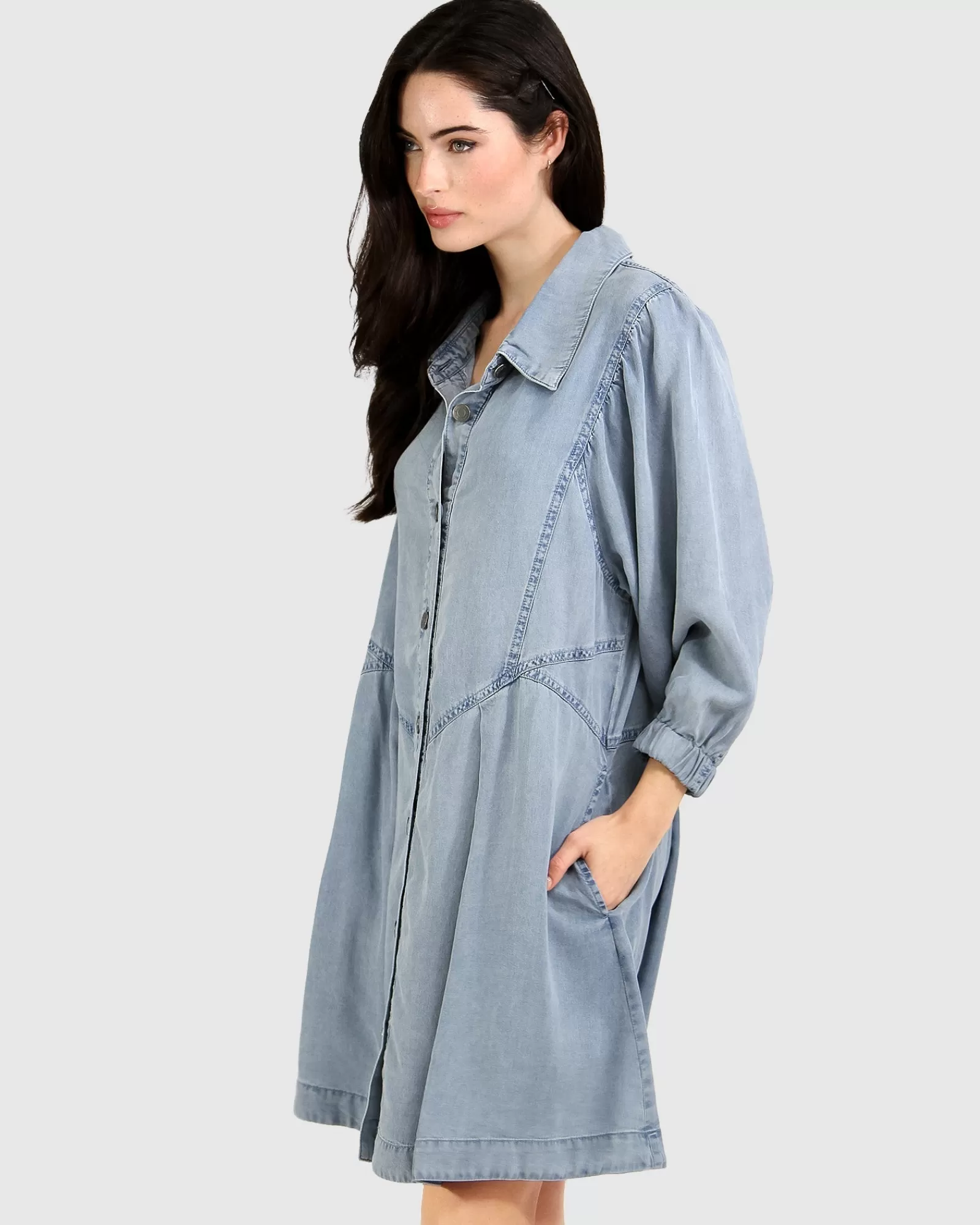 The Supercut Denim Dress is everything! The perfect denim dress featuring a classic button-front with A-line silhouette and contrast seaming for added dimension. It’s an easy, stylish piece and can be worn on its own, layered over tights or leggings during transeasonal months or open as an oversized Jacket.
