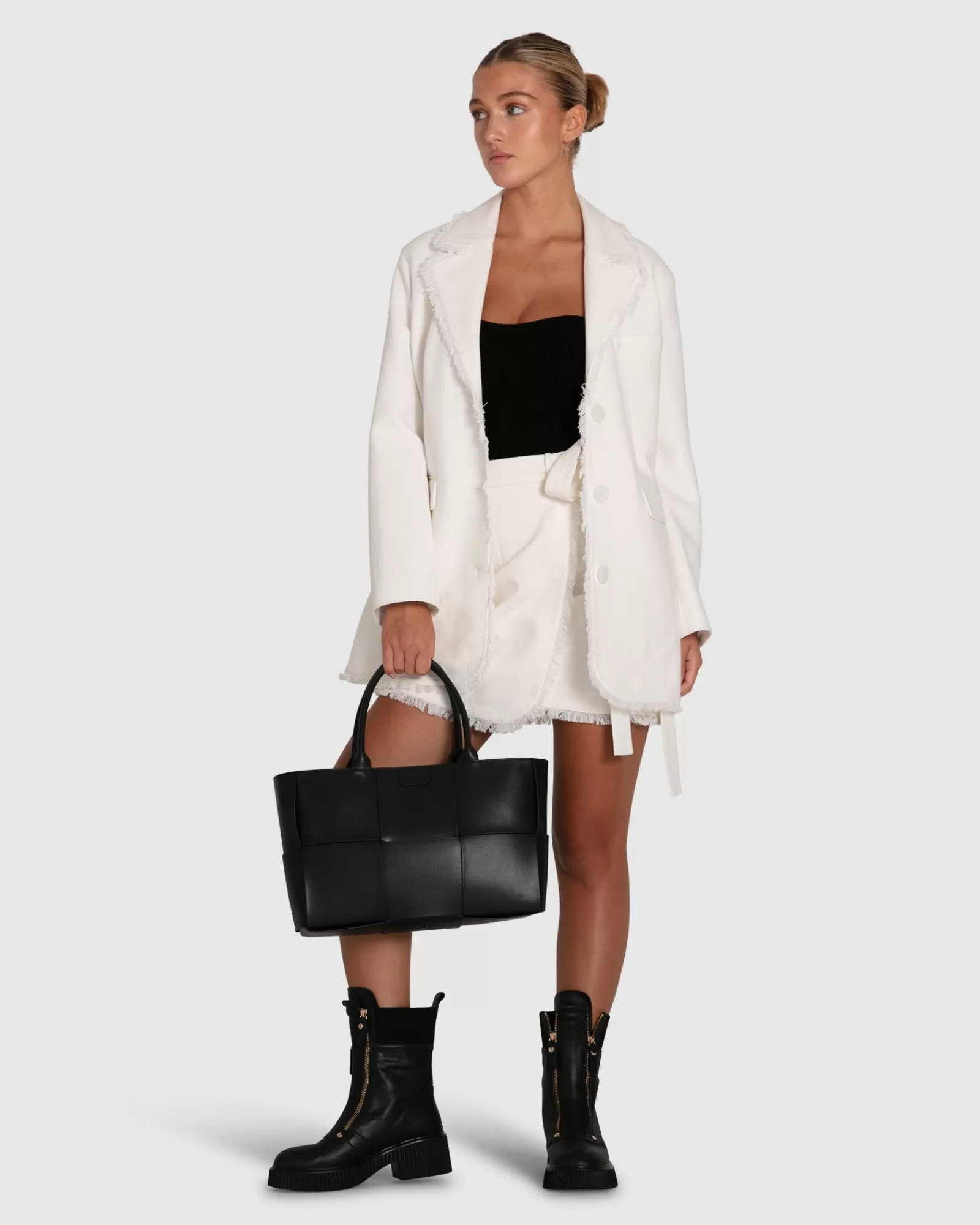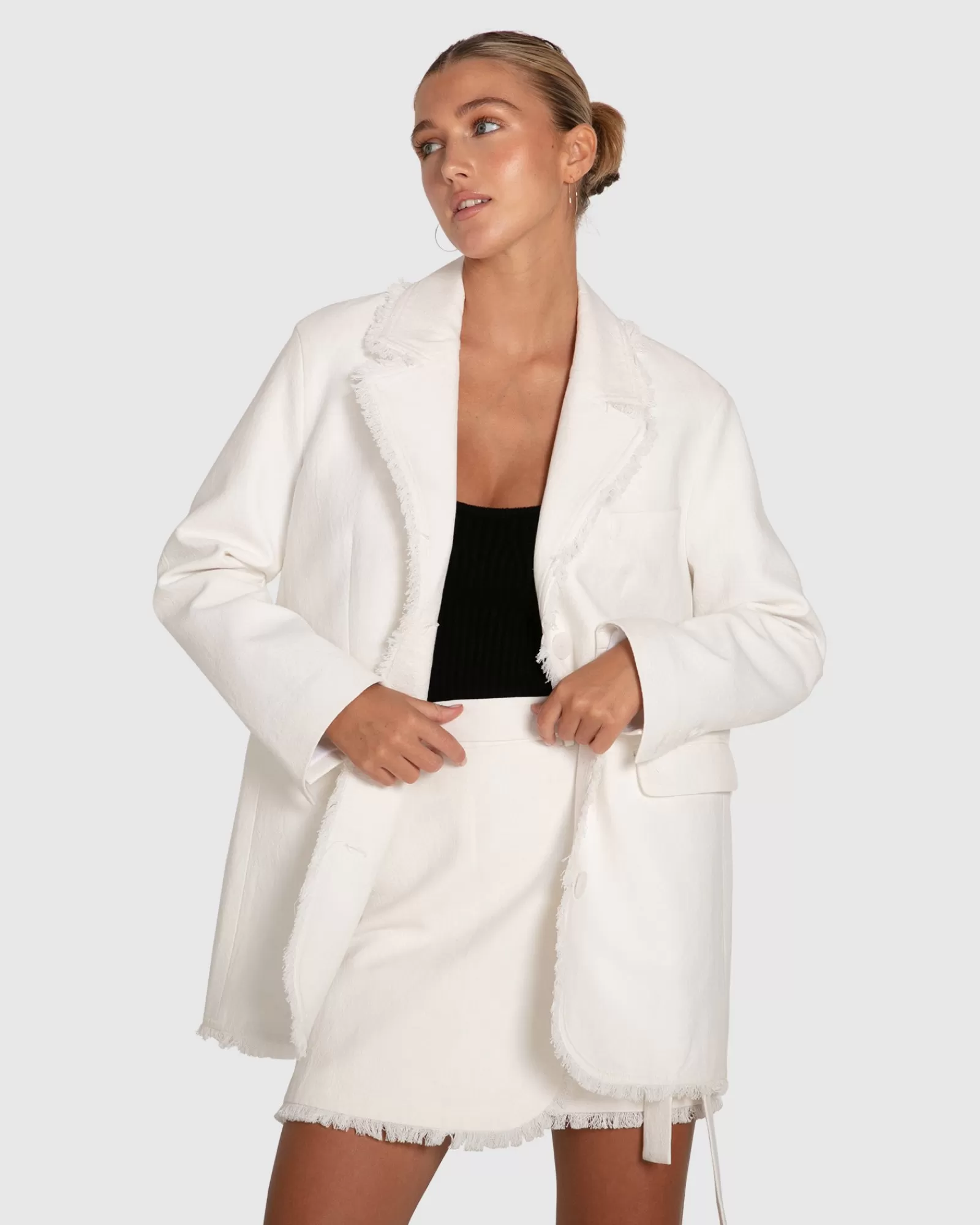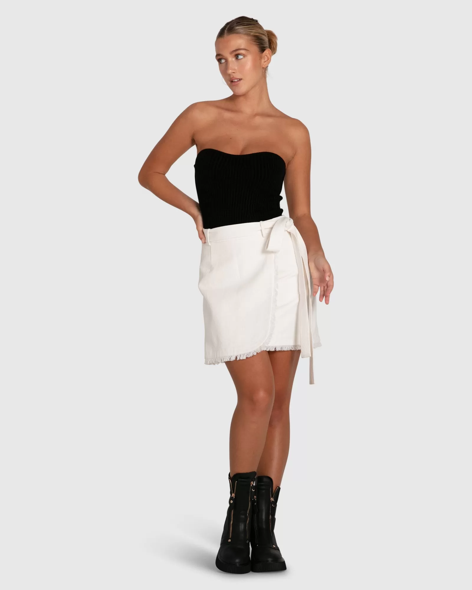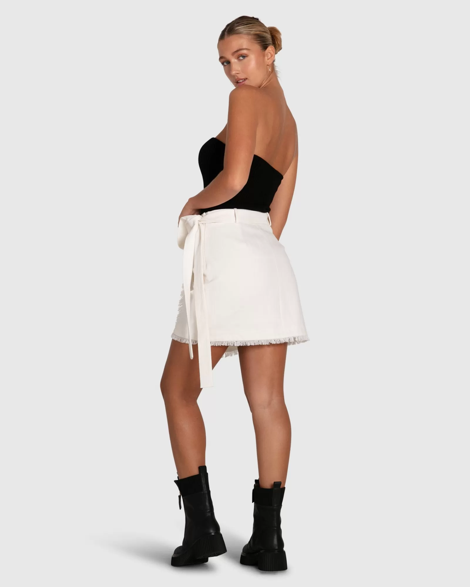 Keep it cute year-round with the There She Goes Frayed Edge Skirt. The flattering wrap silhouette and mini length can be styled with the matching blazer and boots in the cooler months, or effortlessly styled with anything in your summer wardrobe for long sunny beach days.