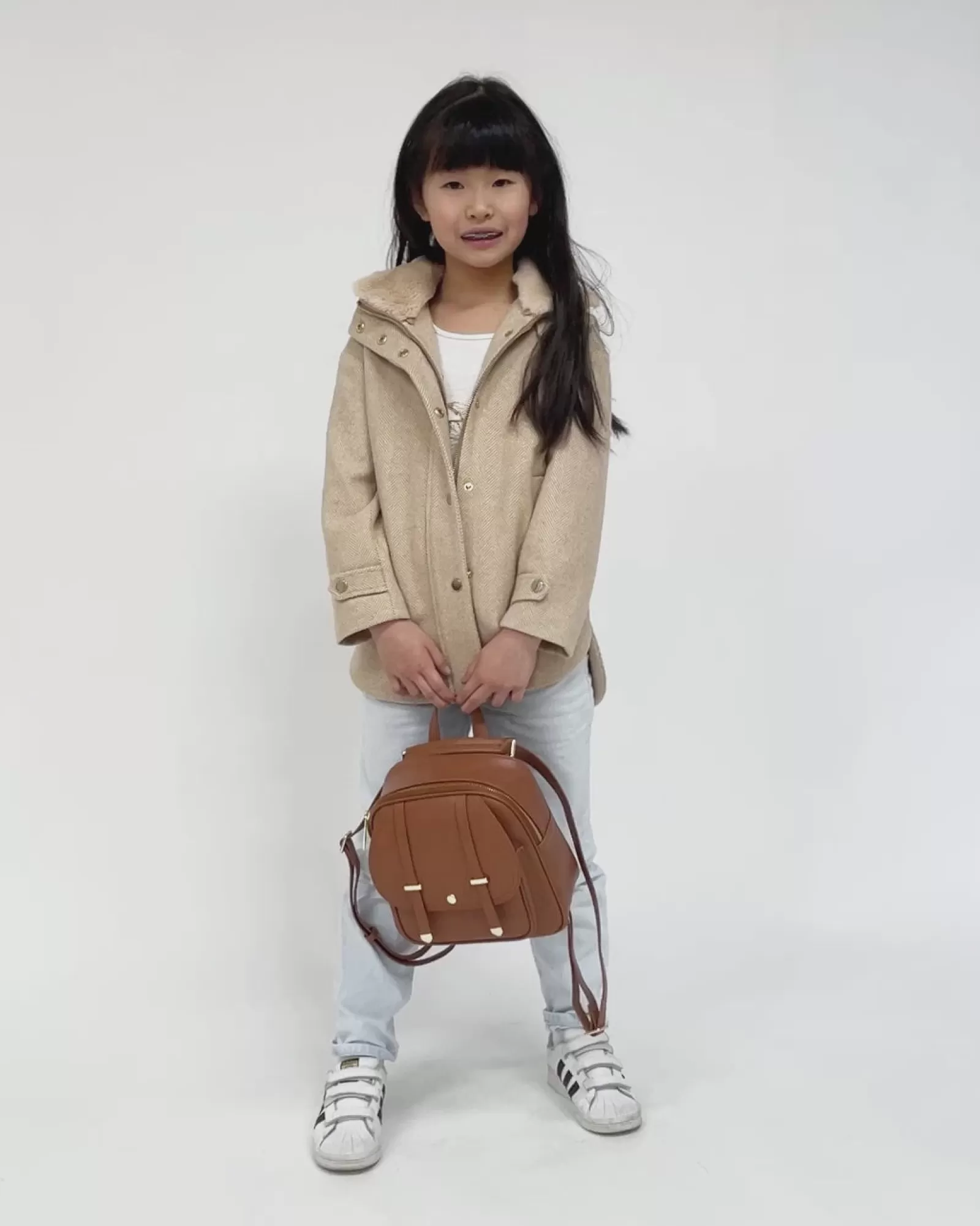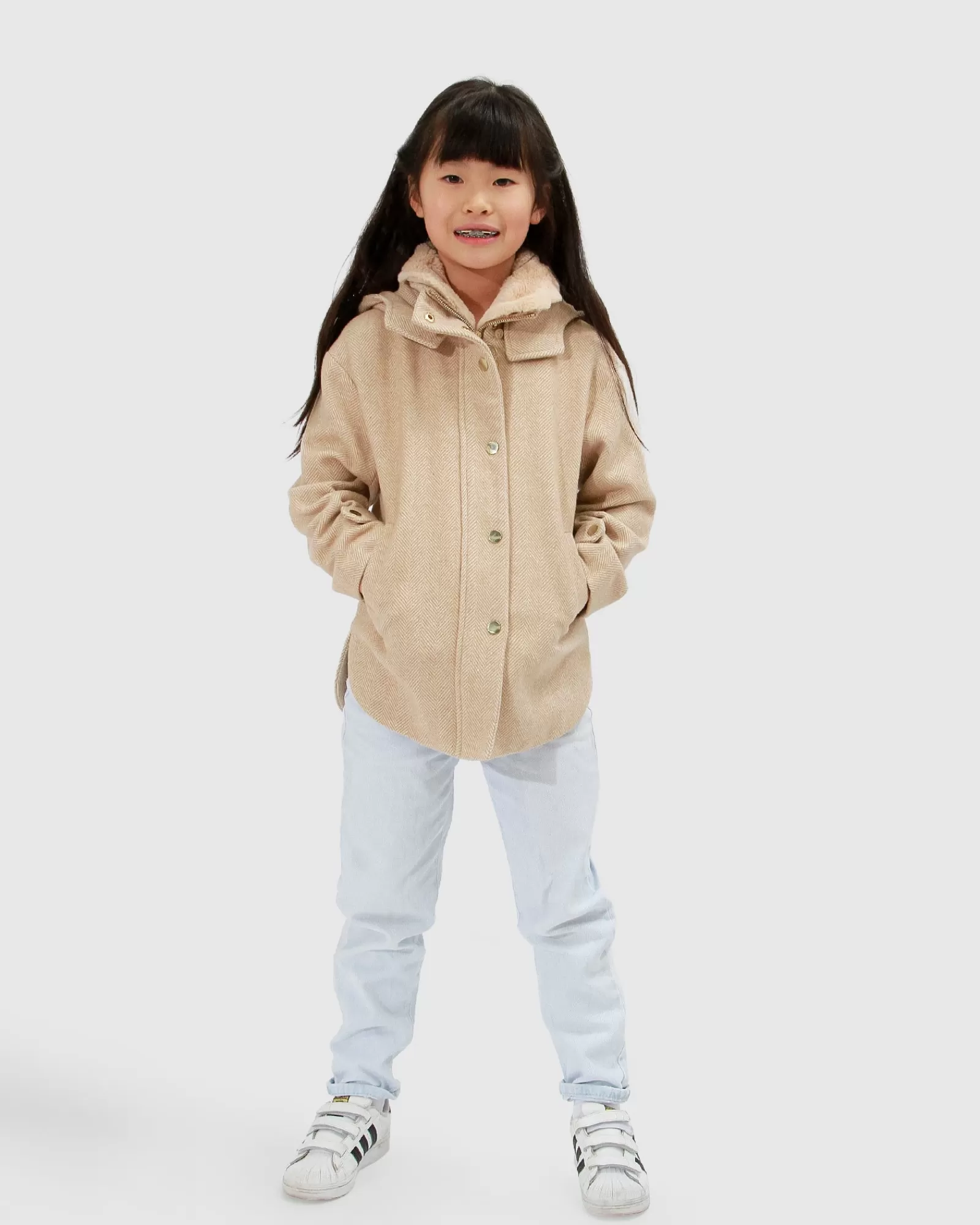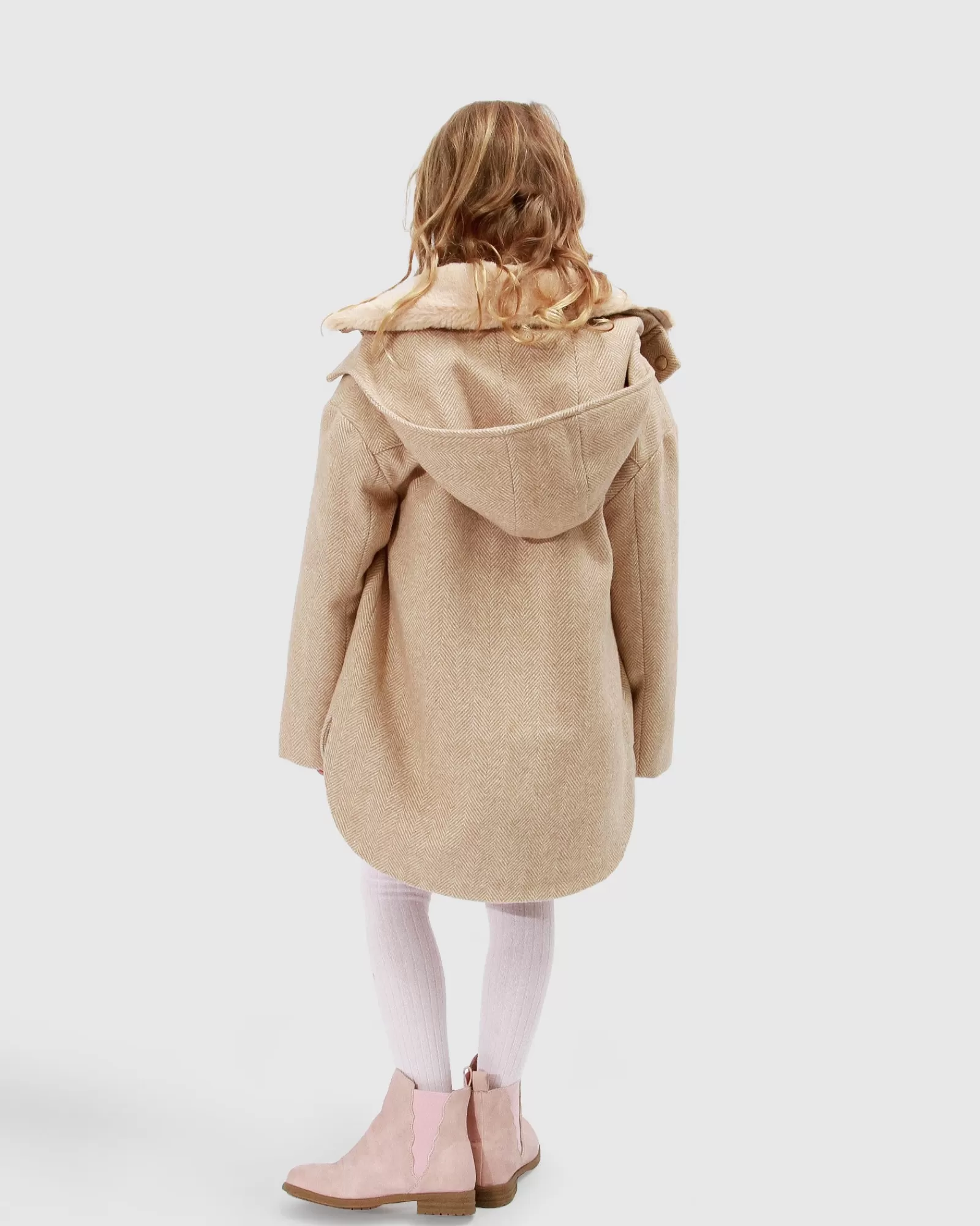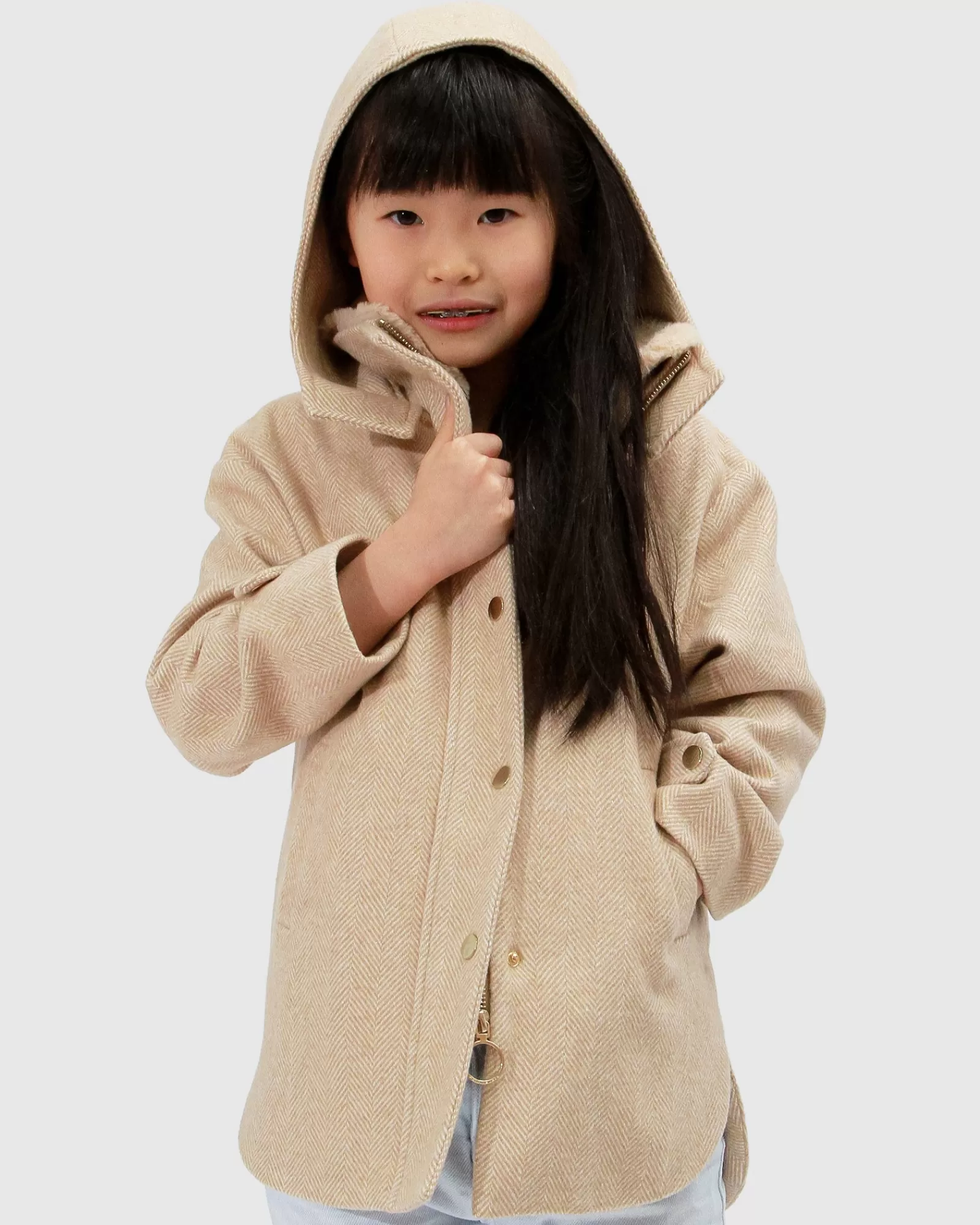 Our When I Grow Up Detachable Hooded Coat is a winter wardrobe essential that blends warmth and style seamlessly. Crafted from a luxurious wool blend fabric with a timeless herringbone pattern, this coat is the perfect addition to your little fashionista’s winter layering wardrobe, ensuring they stay warm and stylish throughout the season.