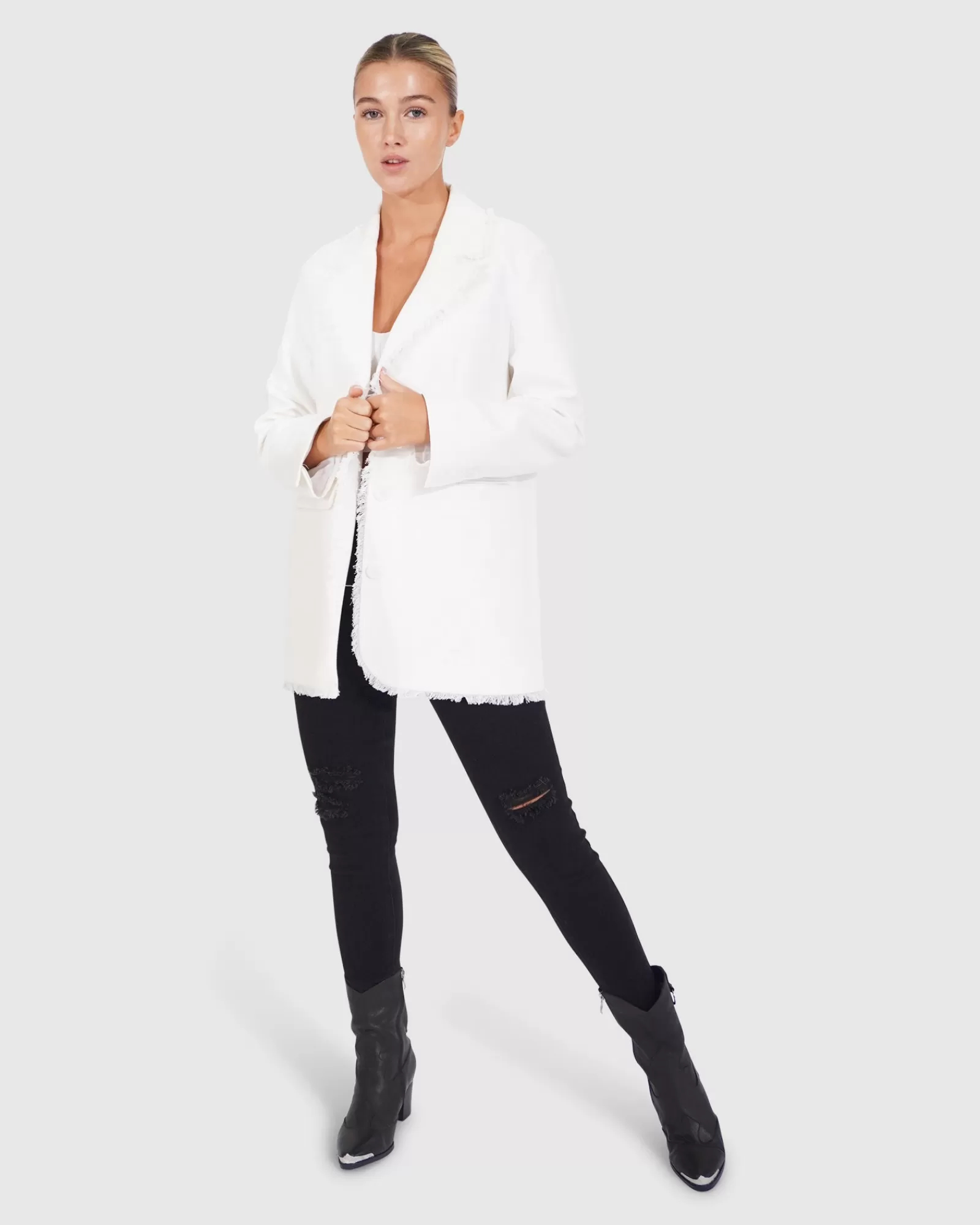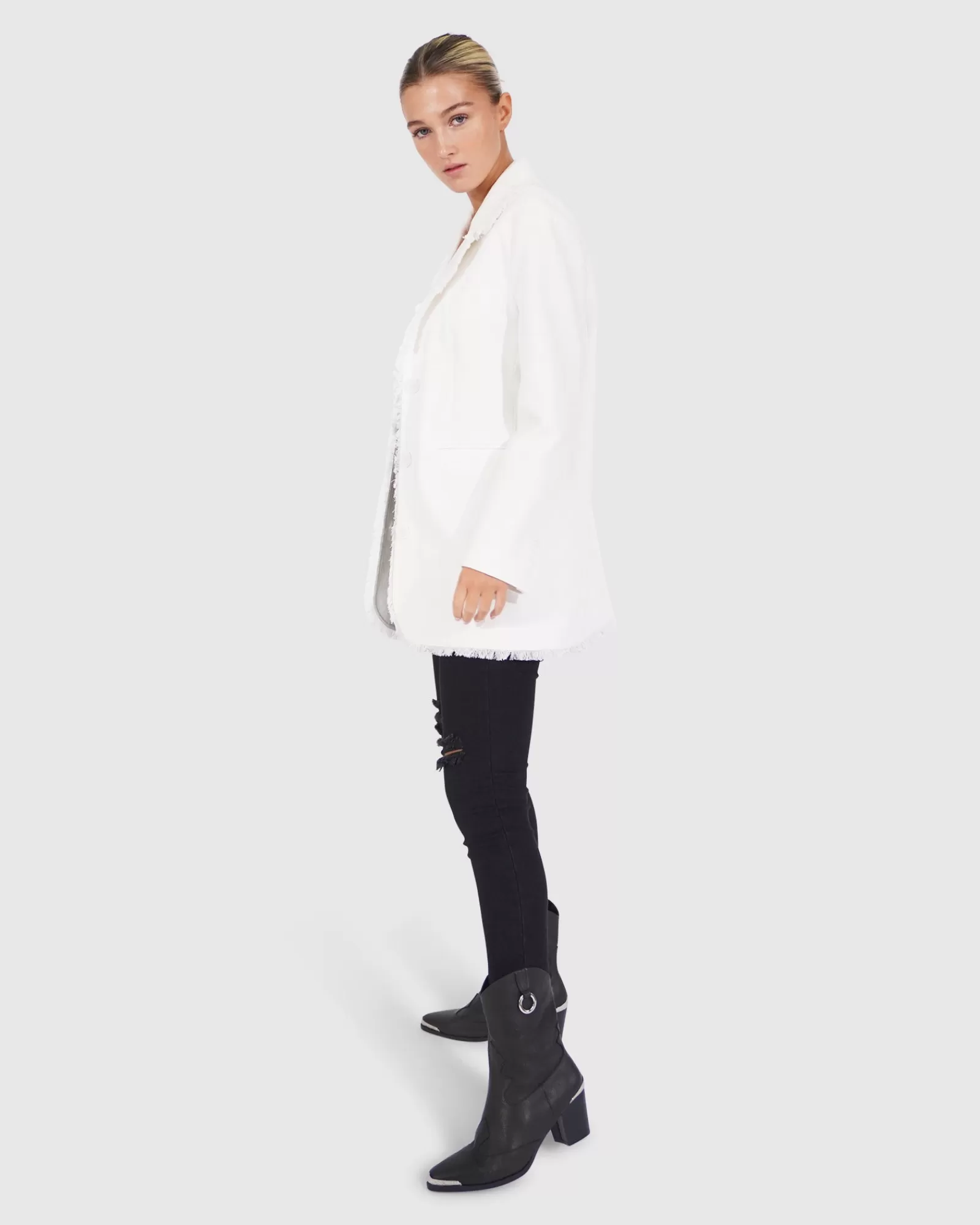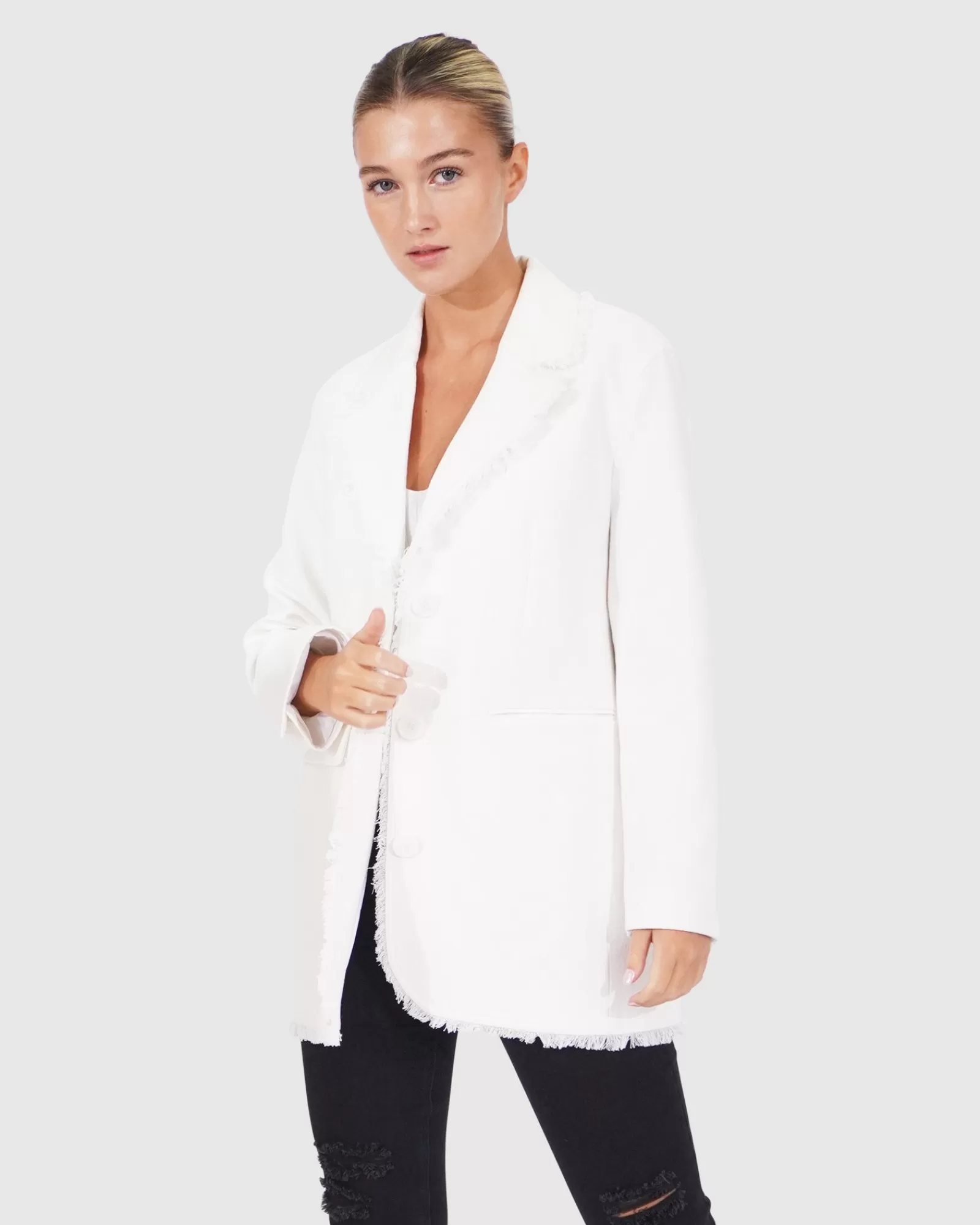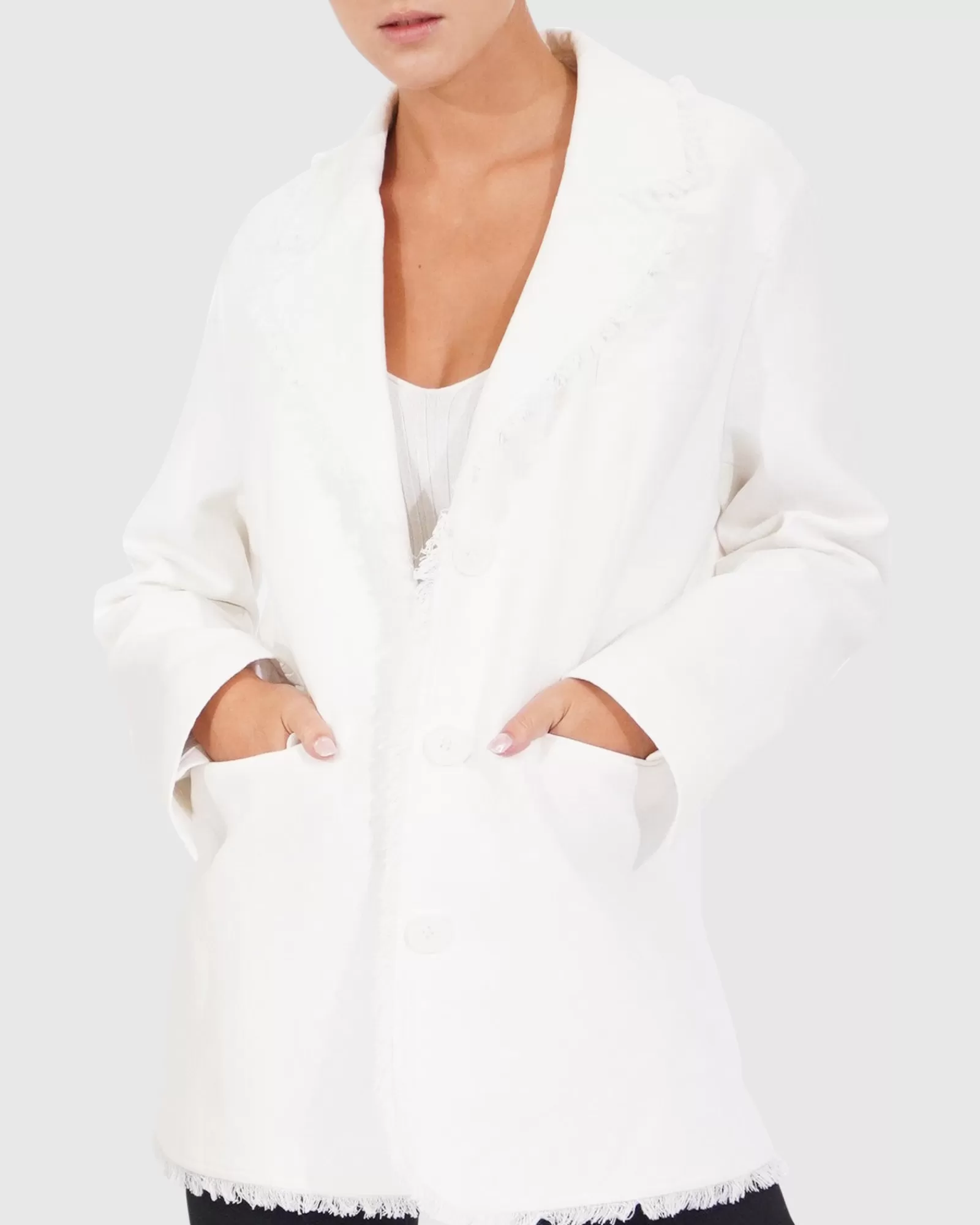 Rock a modern, polished vibe with a twist in the Young Blood Frayed Edge Blazer. The oversized single breasted silhouette and subtly textured fabric makes it perfect for year-round styling.