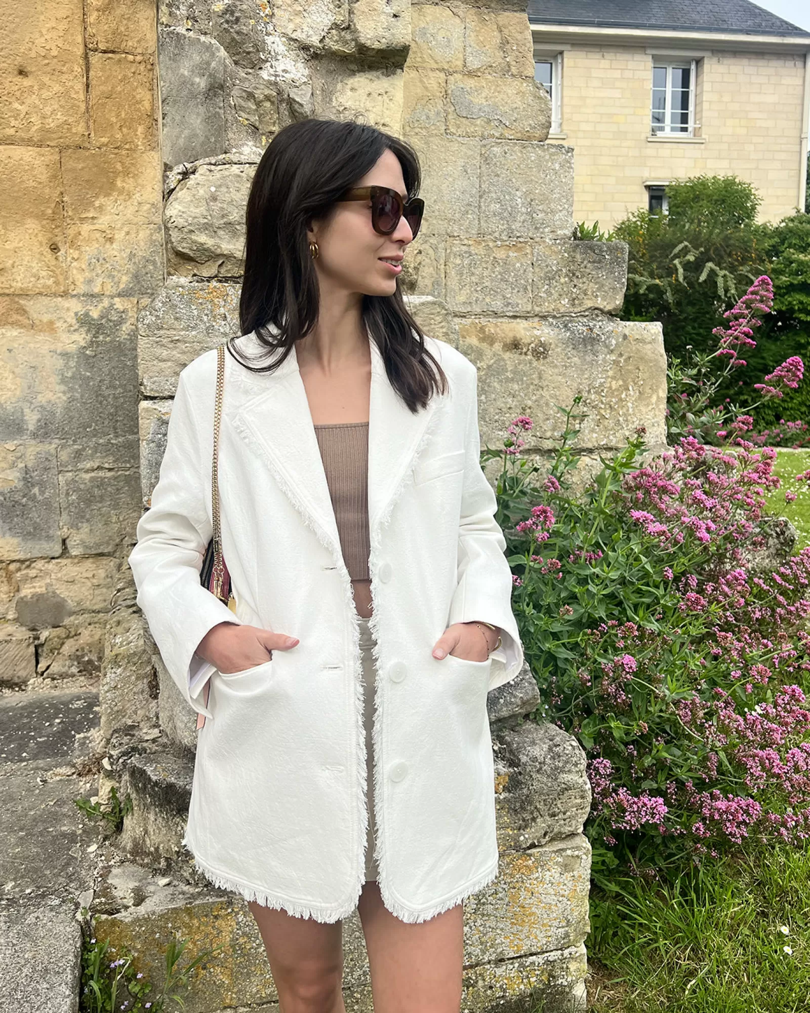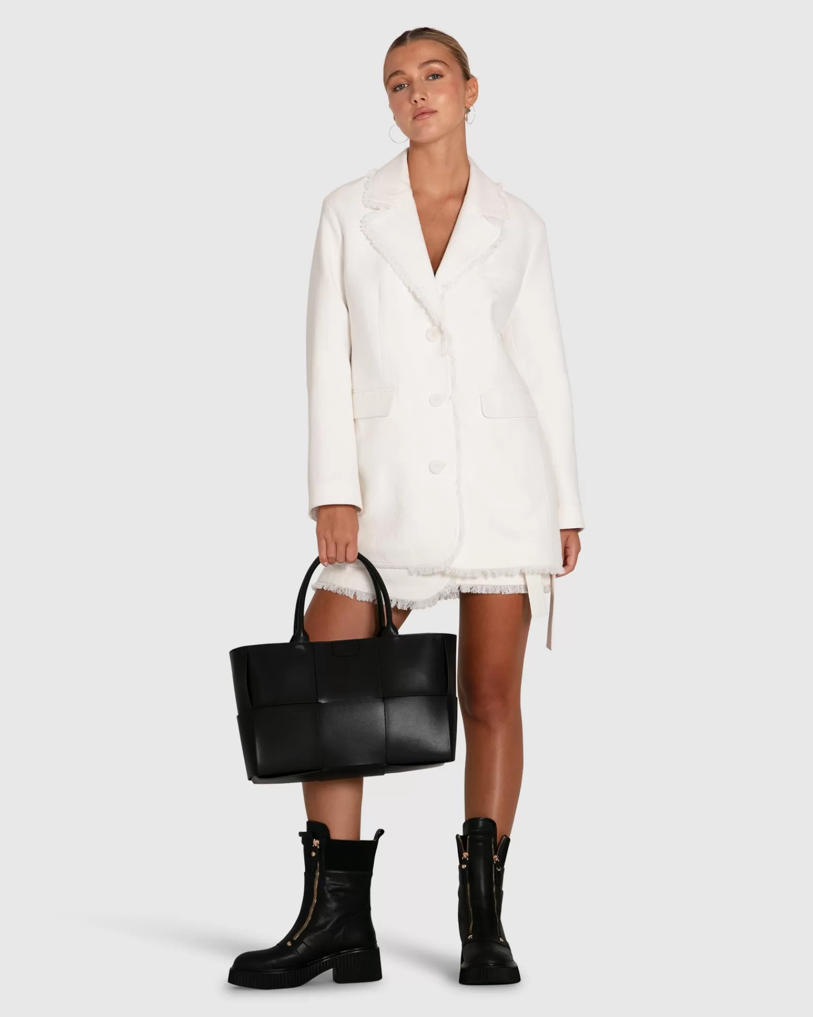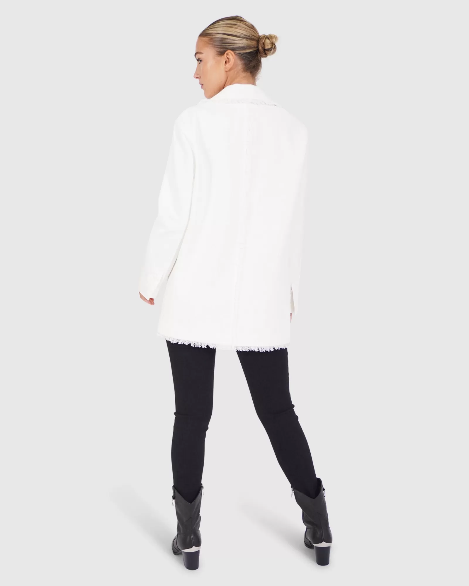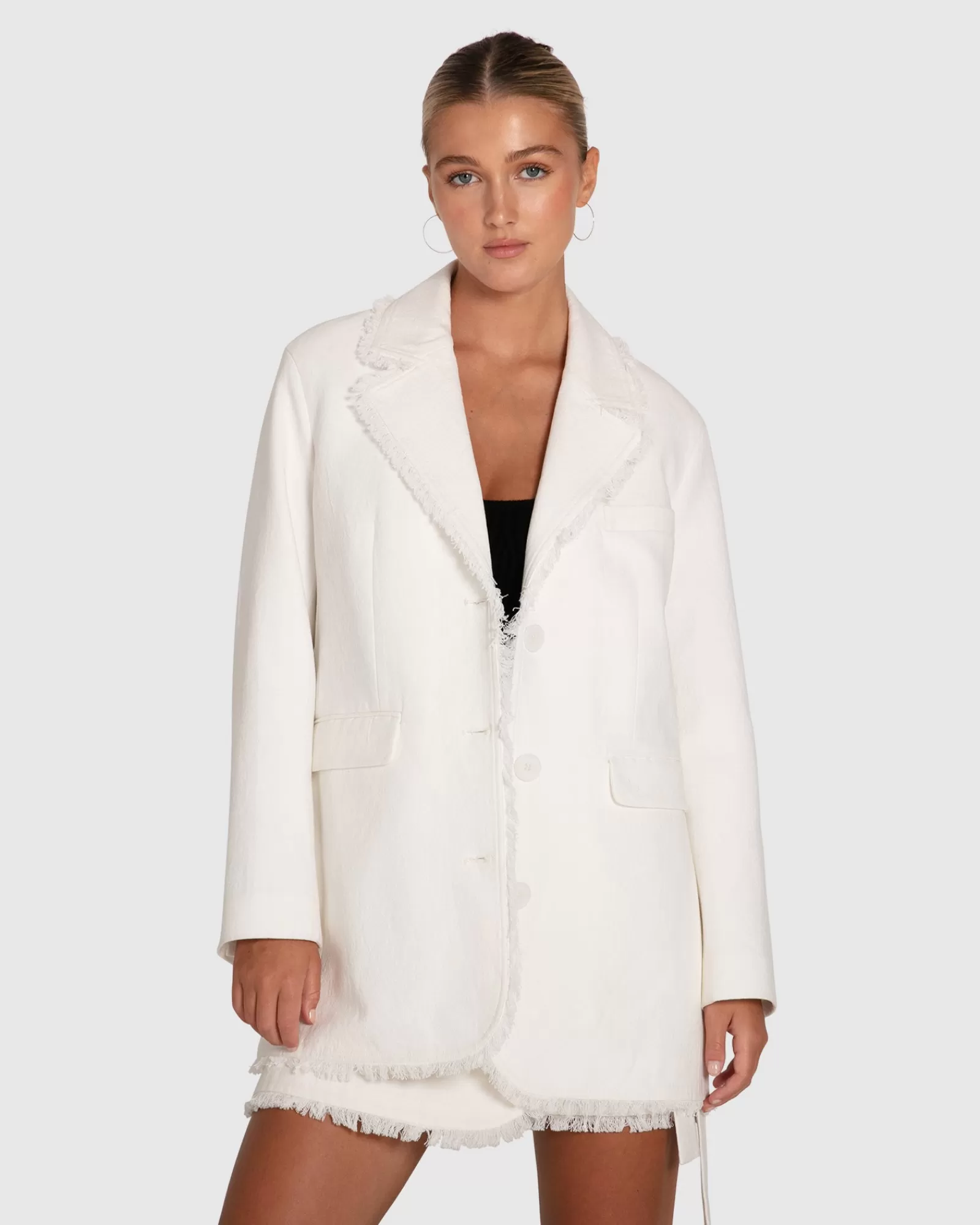 Rock a modern, polished vibe with a twist in the Young Blood Frayed Edge Blazer. The oversized single breasted silhouette and subtly textured fabric makes it perfect for year-round styling.
